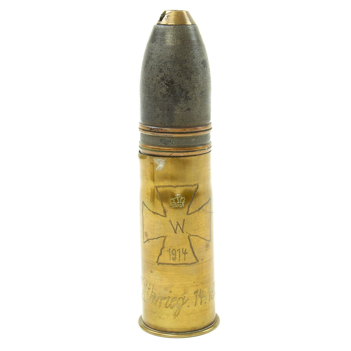 - French M1916 37mm artillery shell with projectile and inert fuze. The casing is engraved with a Iron Cross and reads WELTKRIEG 14. 1918. The base is is marked PPDs for the factory, “Pouderies de Paris”, and 37-85 which means 37mm model of 1885 as well a 9.16 which is the manufacture date, September 1916.