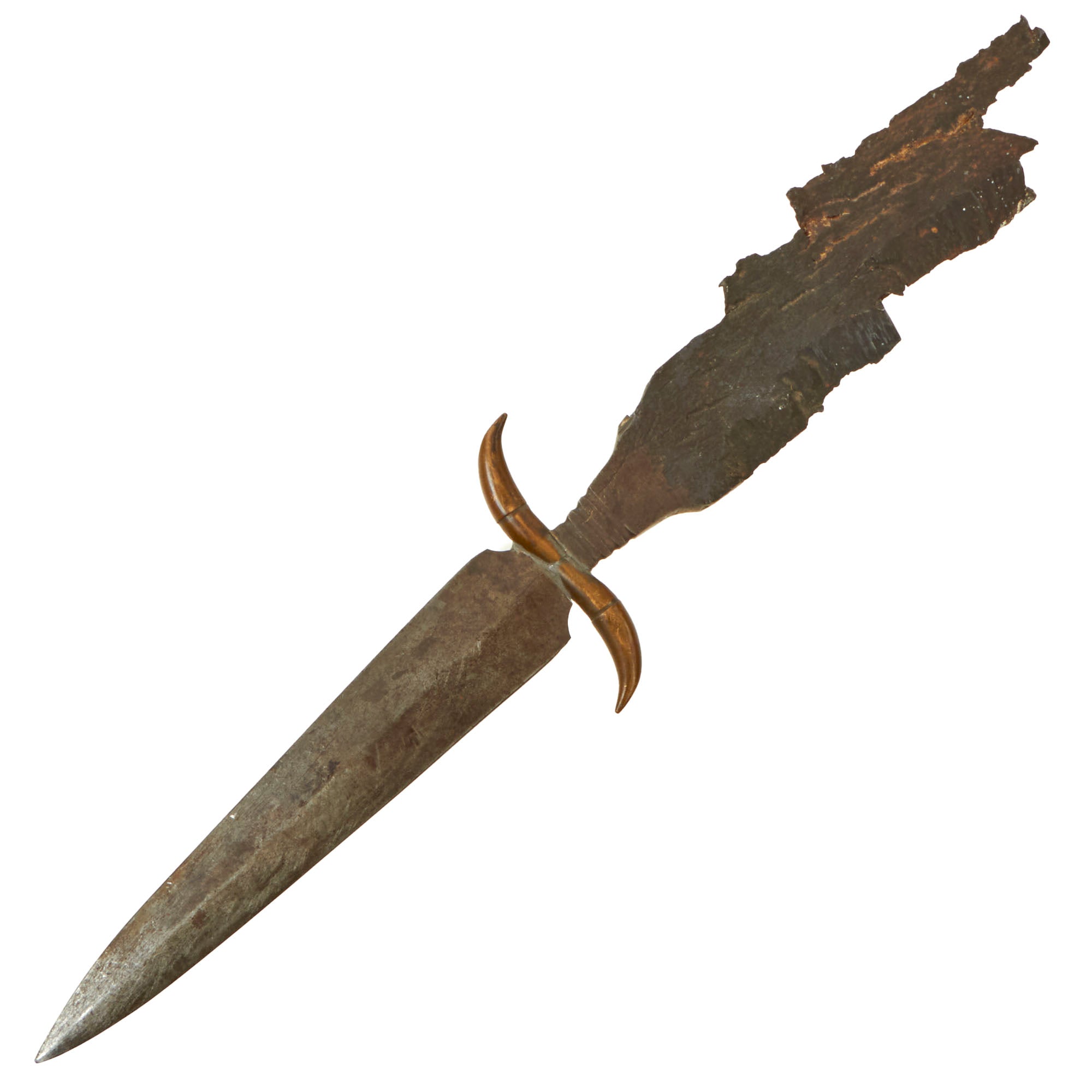 The knife has some wear and cracking but is a phenomenal display piece, obviously not meant to be used as a real fighting knife due to the sharp edges of the handle. A really fantastic piece of trench art perfect for any WWI collection. Comes ready for further research and display.