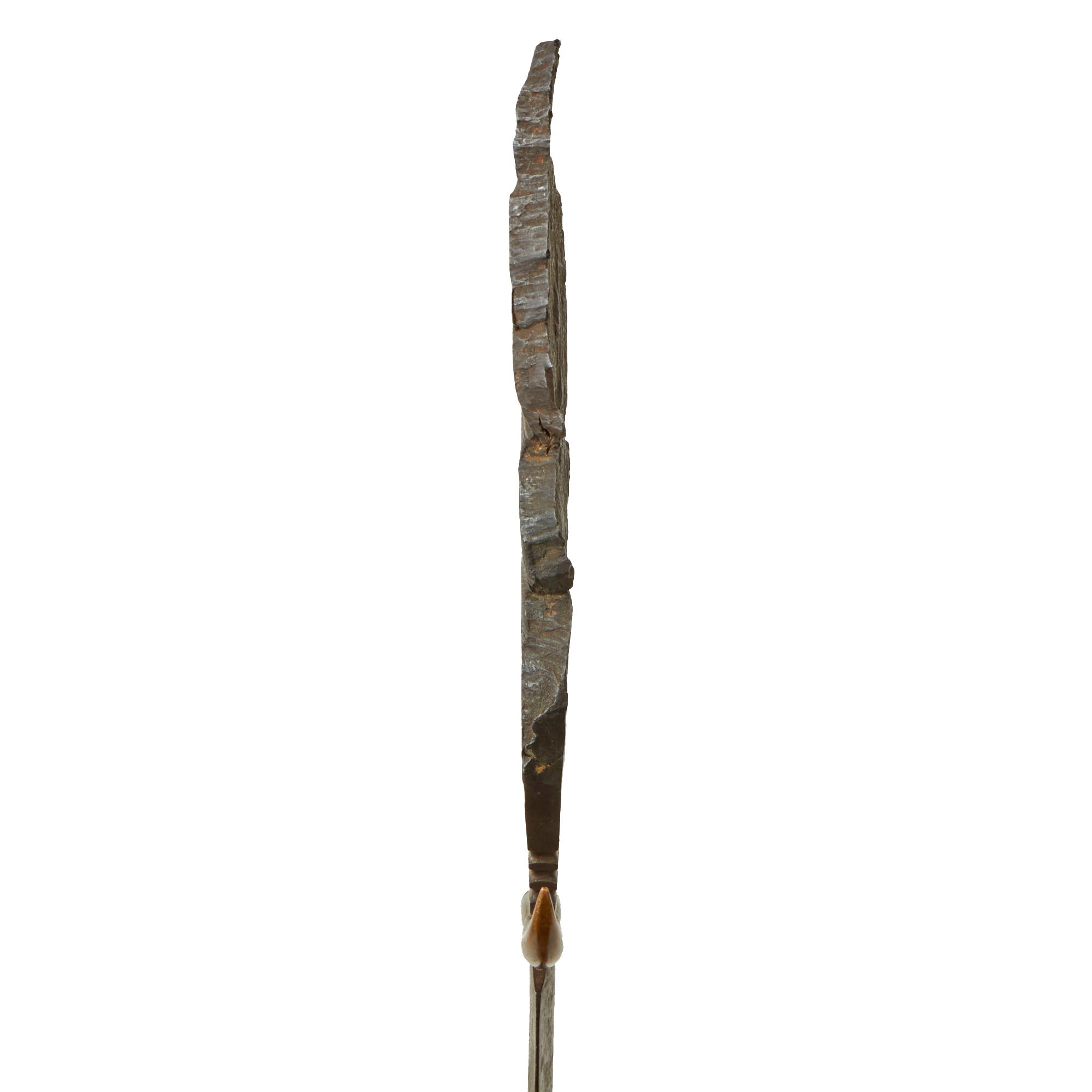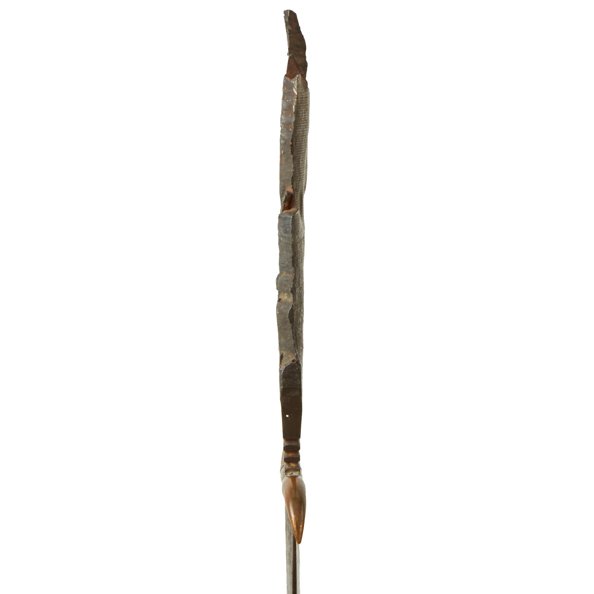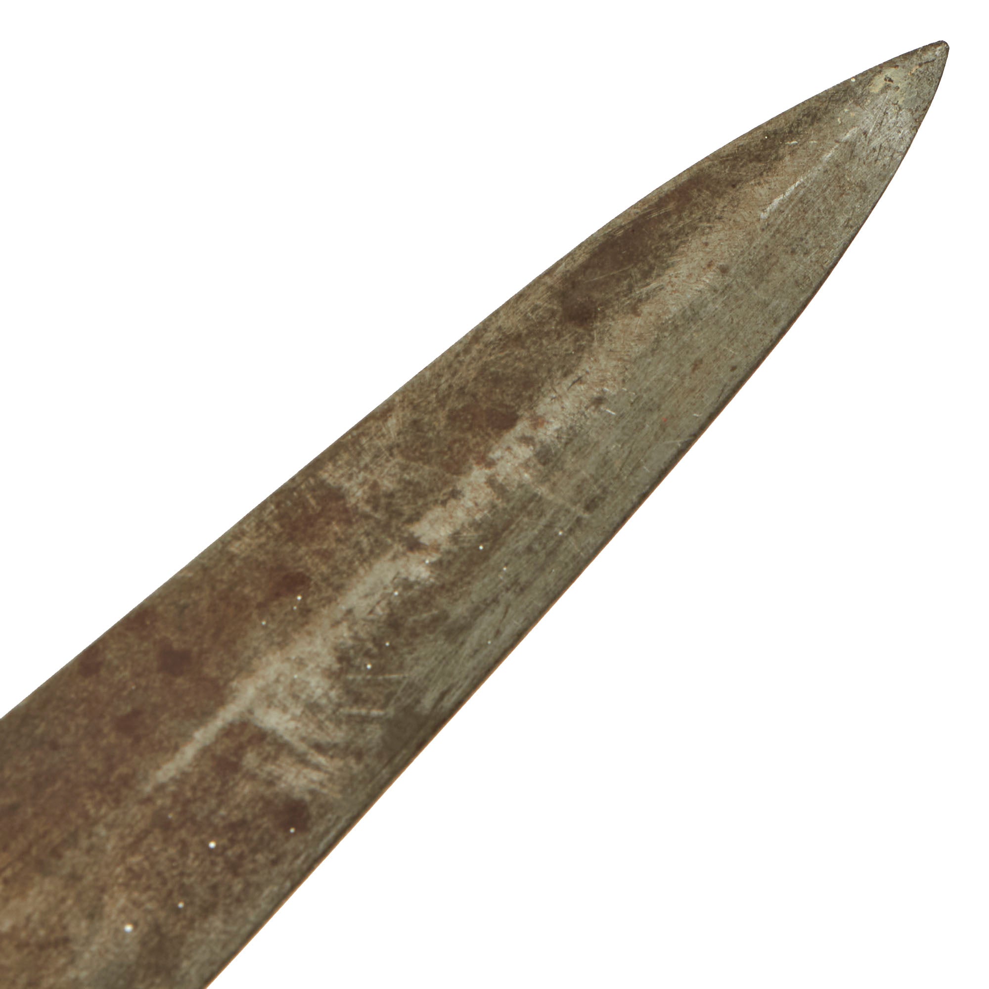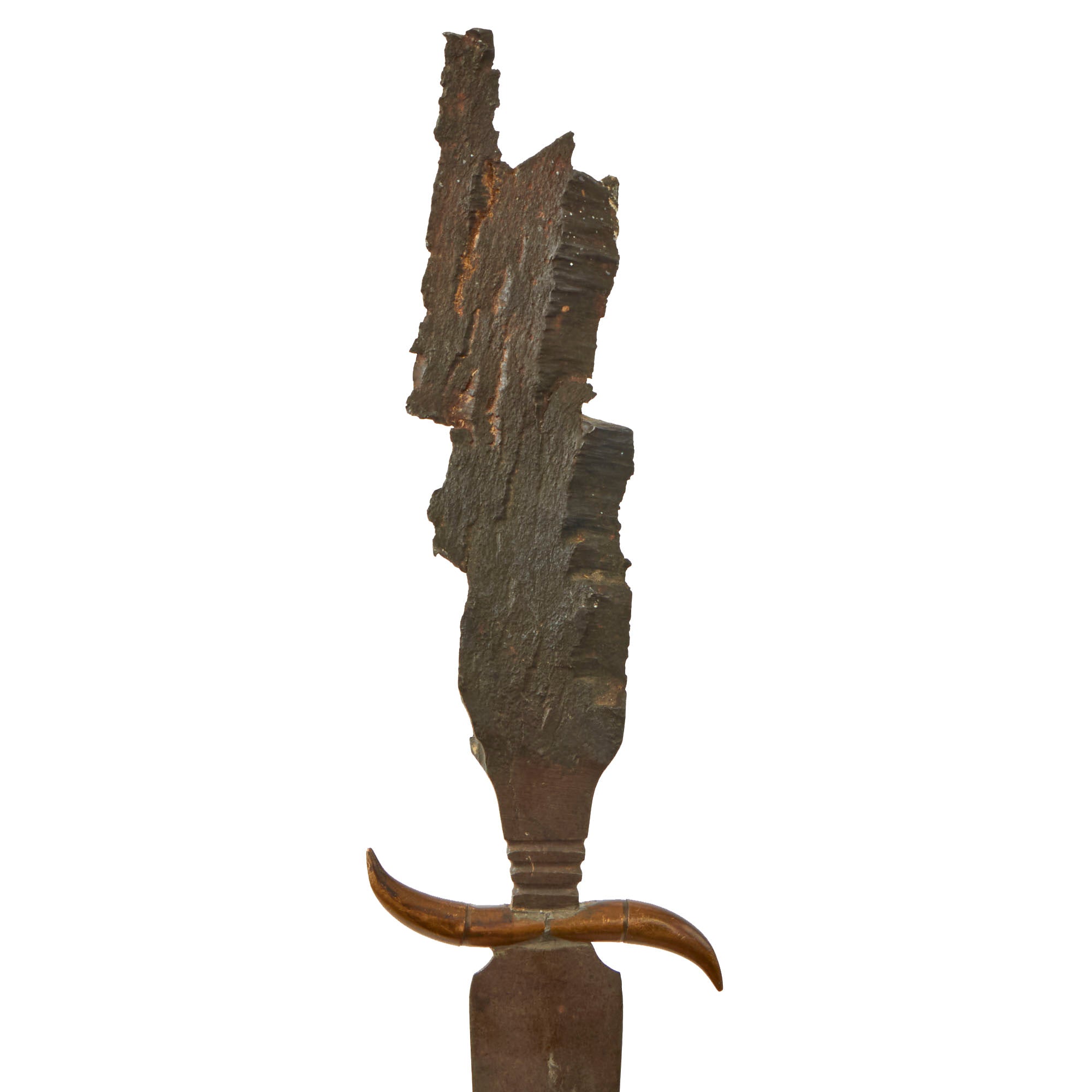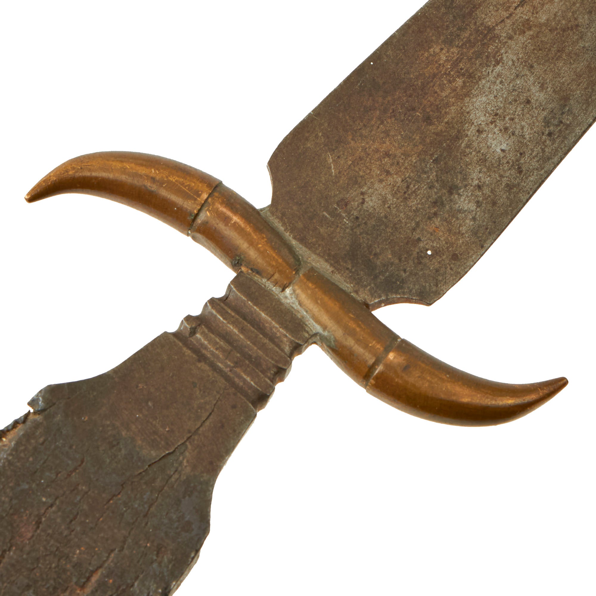 Original Item. Only One Available. This is a killer piece of WWI trench art, a long piece of an artillery shell fragment used as the grip for a fighting knife, with the crossguard made from two bullets bent to curve in a quillion style. The knife measures 12 ¾” long with a 6 ⅛” blade.