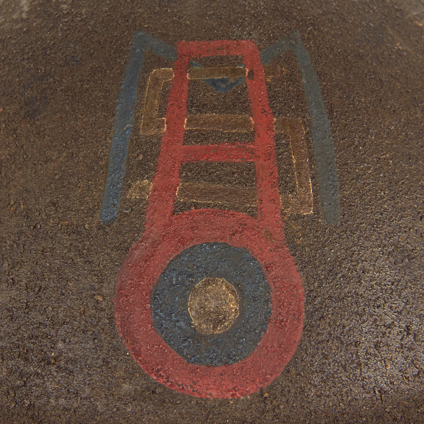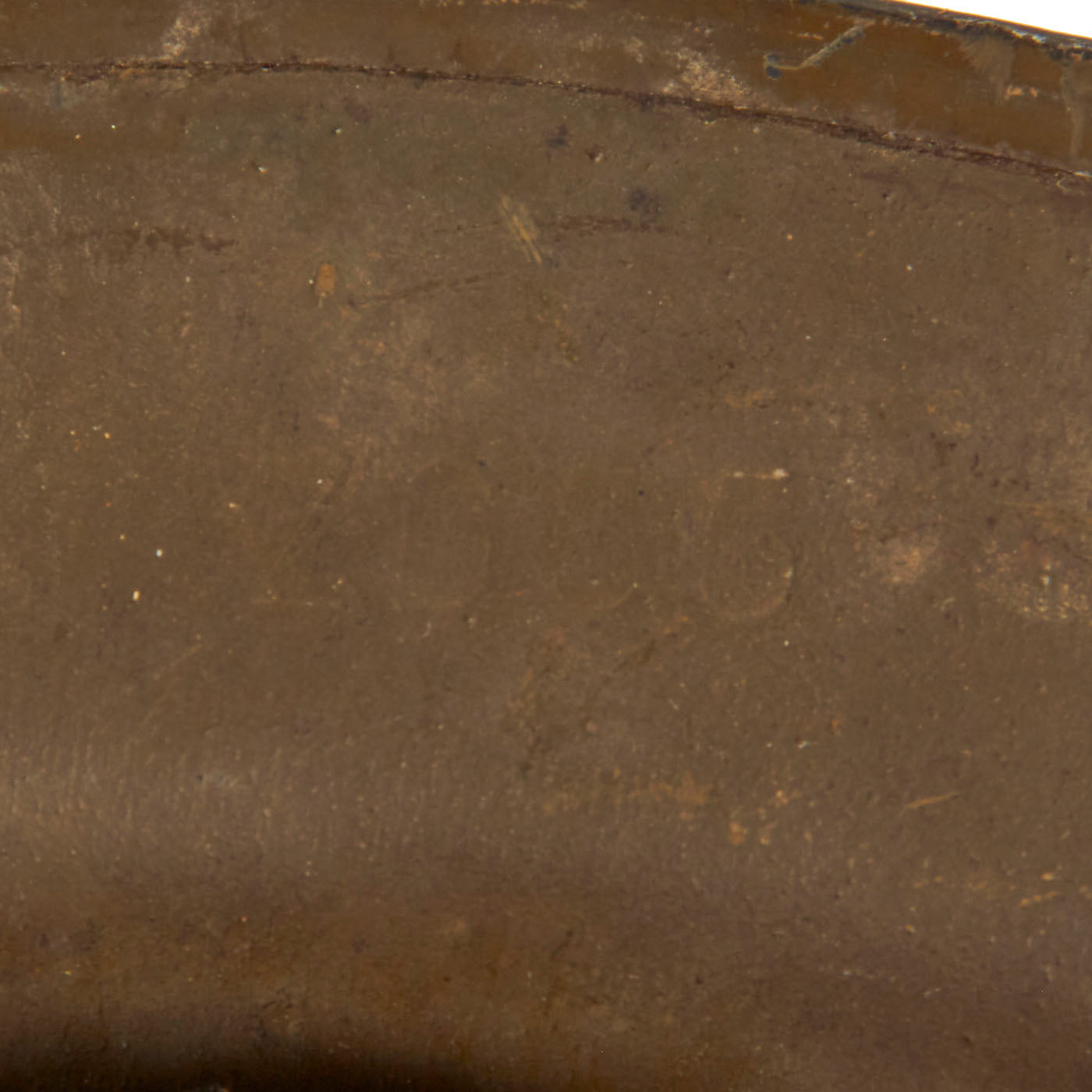 The Helmet is a U.S. Made M-1917 helmet which features a Red/White/Blue Air Service Roundel with the Letters “A.S.M” painted in Red, White, Blue. The helmet features original textured paint, with complete liner and unbroken chinstrap. The helmet even has its original instruction label affixed inside the liner. The helmet is heat lot number marked ZG53, indicating that it is of American manufacture. The liner is size marked 7 ¼ .
