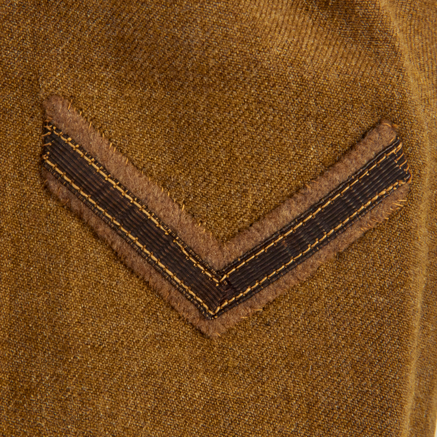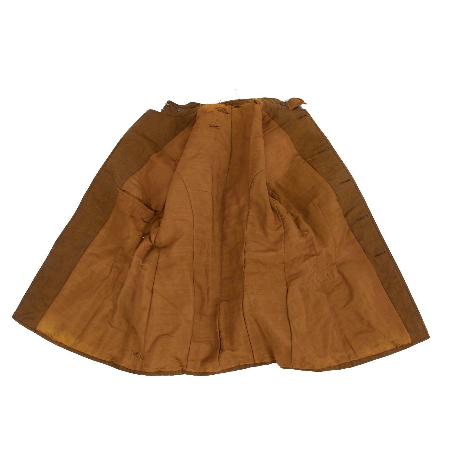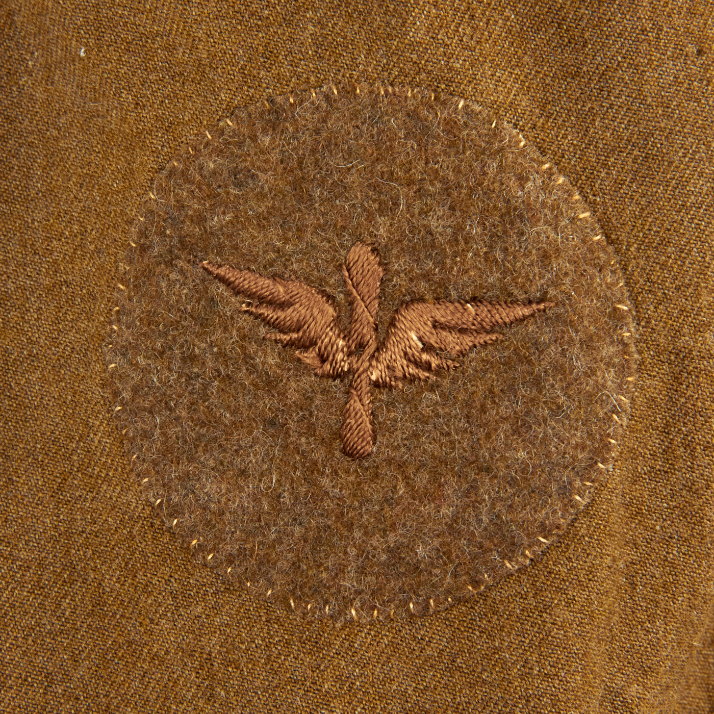 The Tunic with the group is of a private purchase variety being made of a finer, and lighter grade, wool than the standard issue example. The Coat features a beautiful French-Made 2nd Army Air Service Shoulder Sleeve Insignia with chain stitched Roundel. The left sleeve also has a discharge stripe and overseas chevron denoting six months overseas. The right sleeve has an aviation private first class device affixed to the upper sleeve. The collar features a US Device and a Winged Propeller Device. The coat, overall, is in good condition, with a few moth holes here and there and showing signs of honest period use and storage.