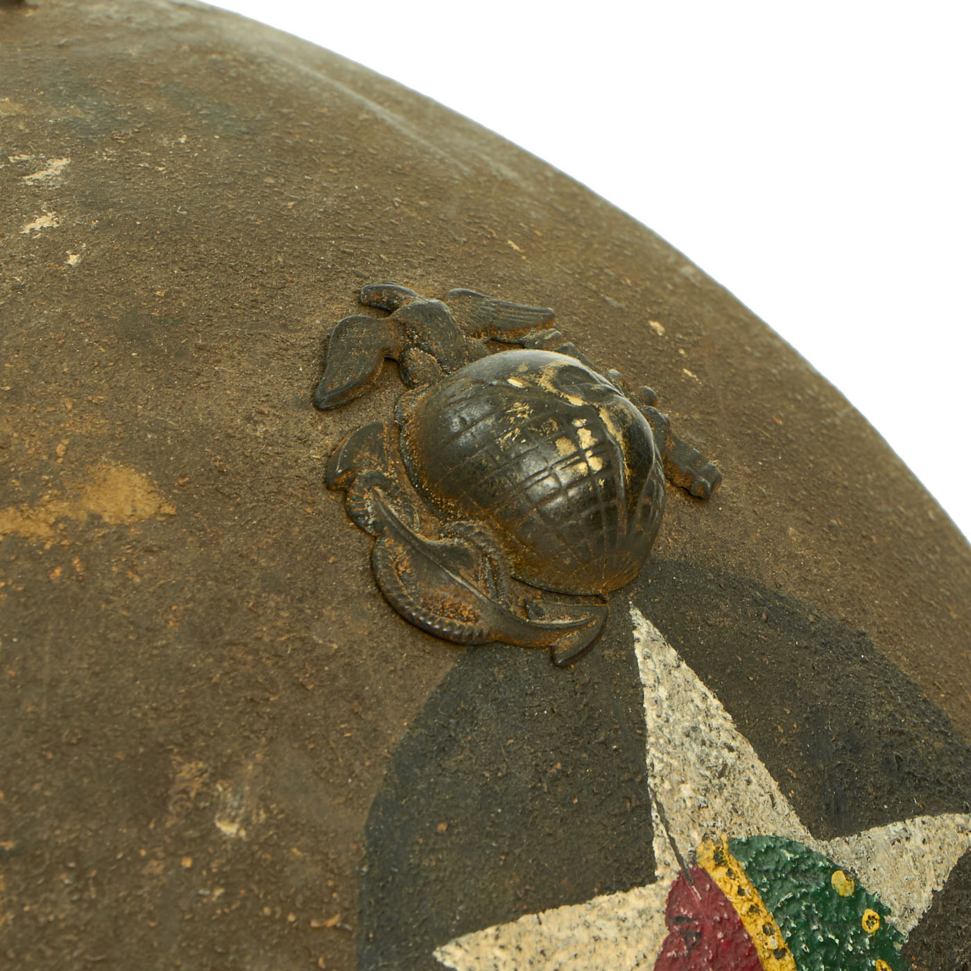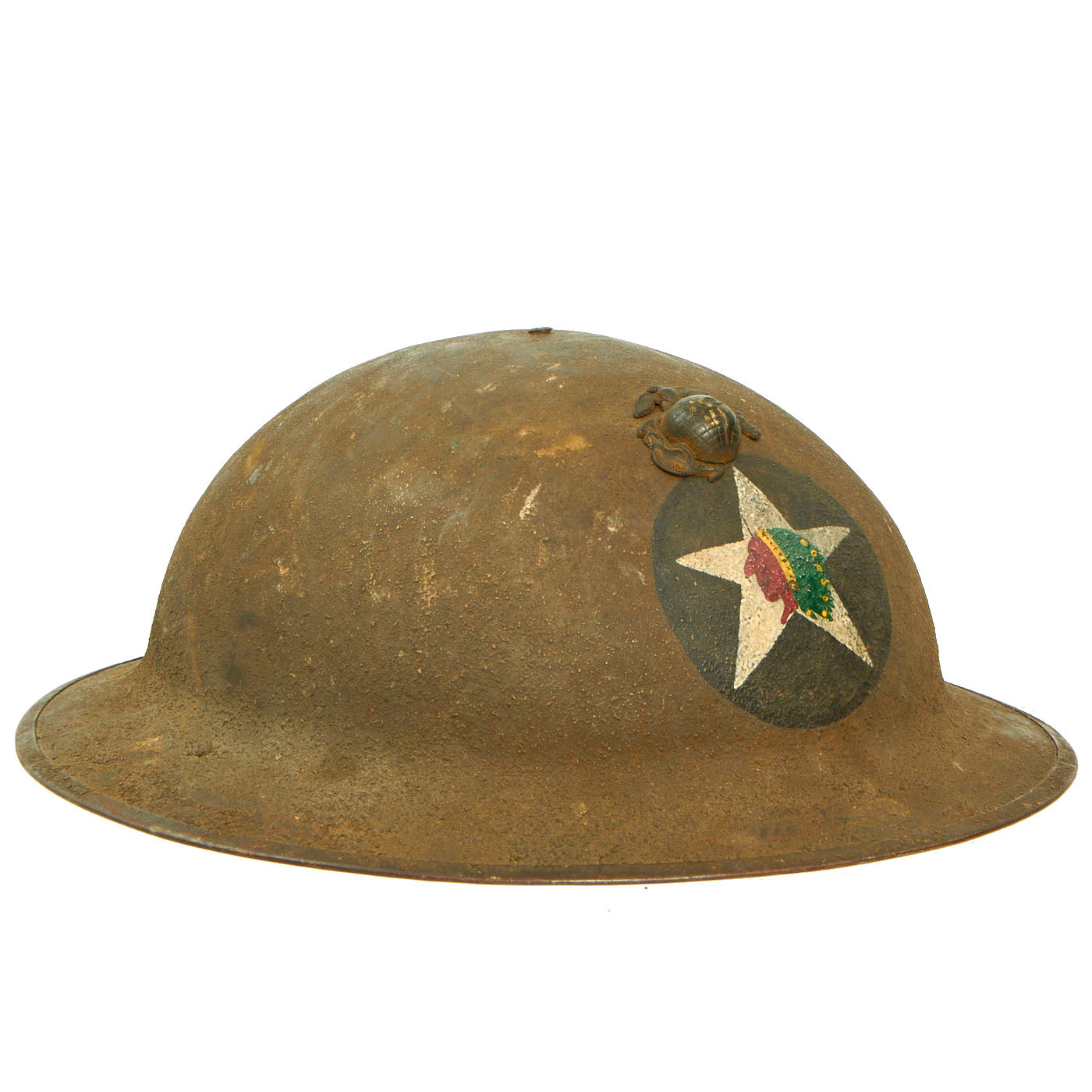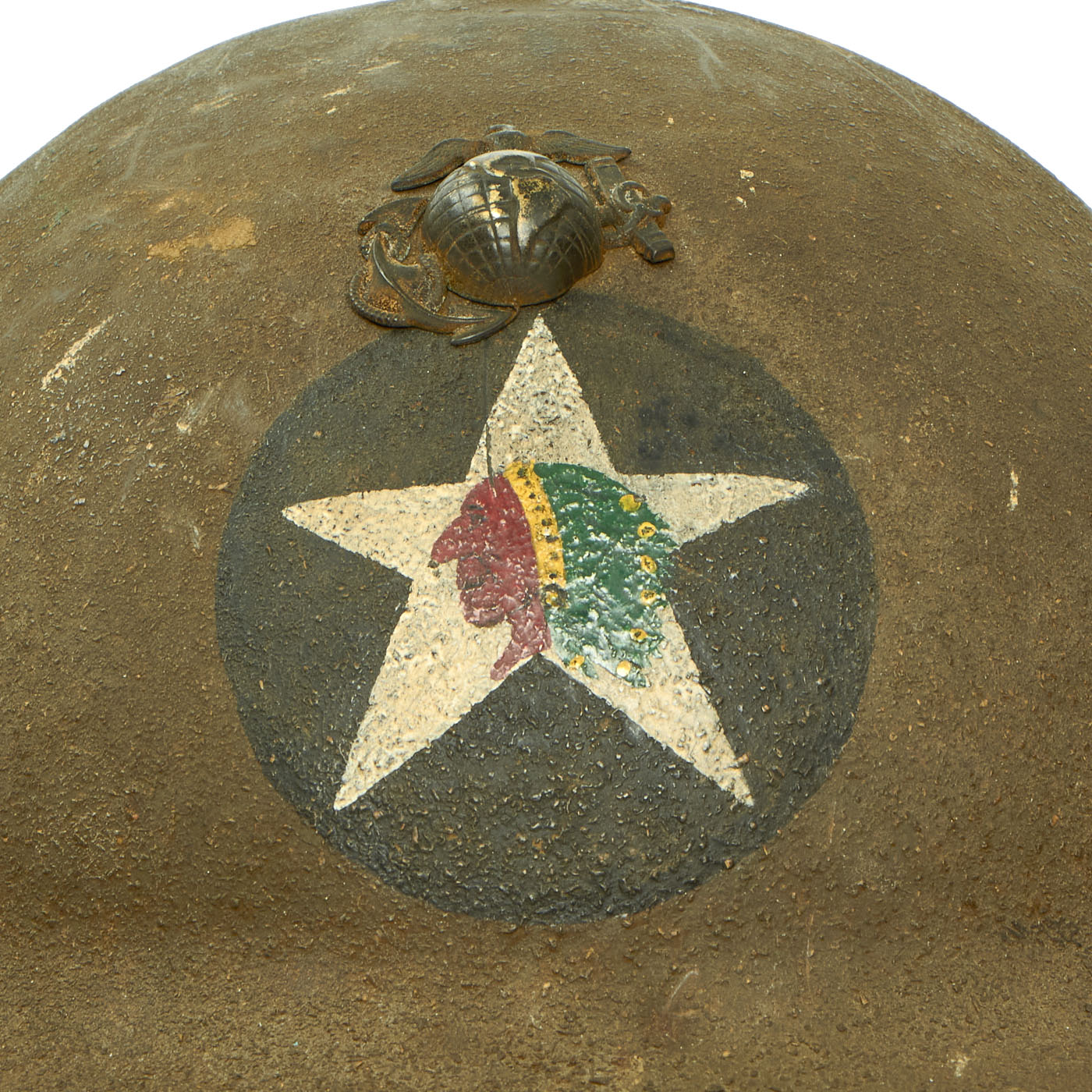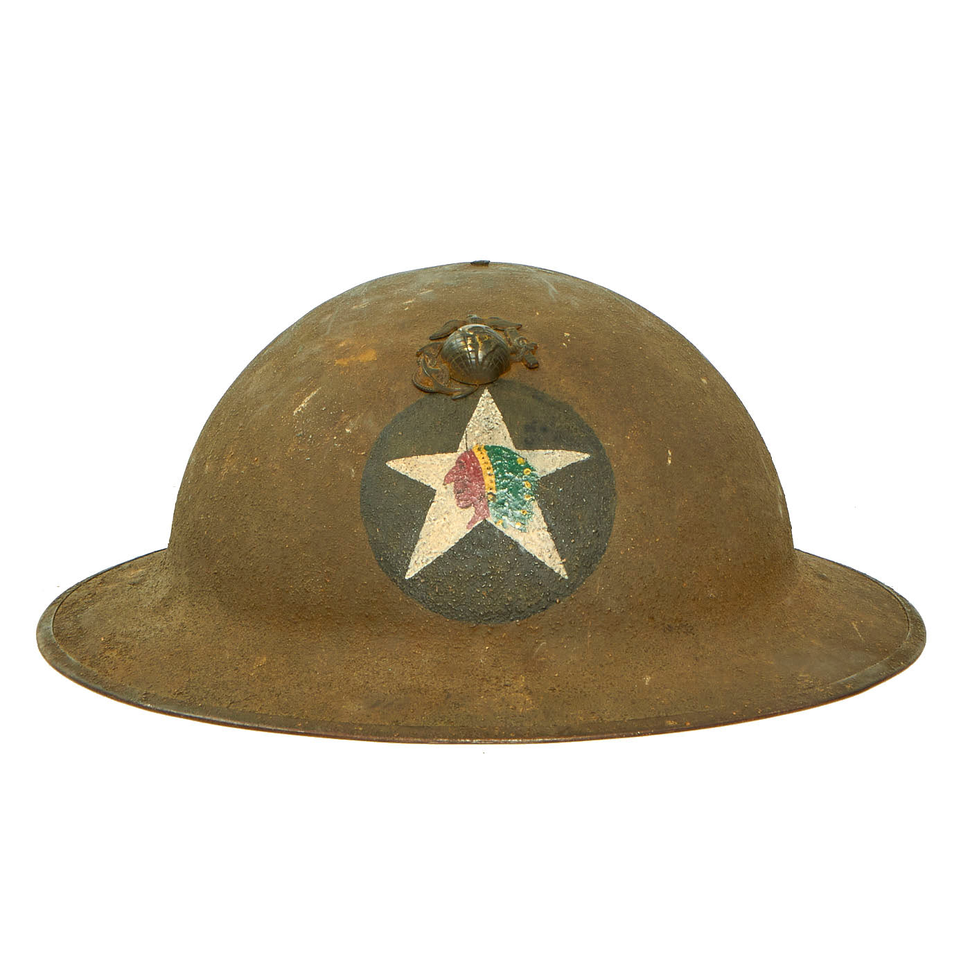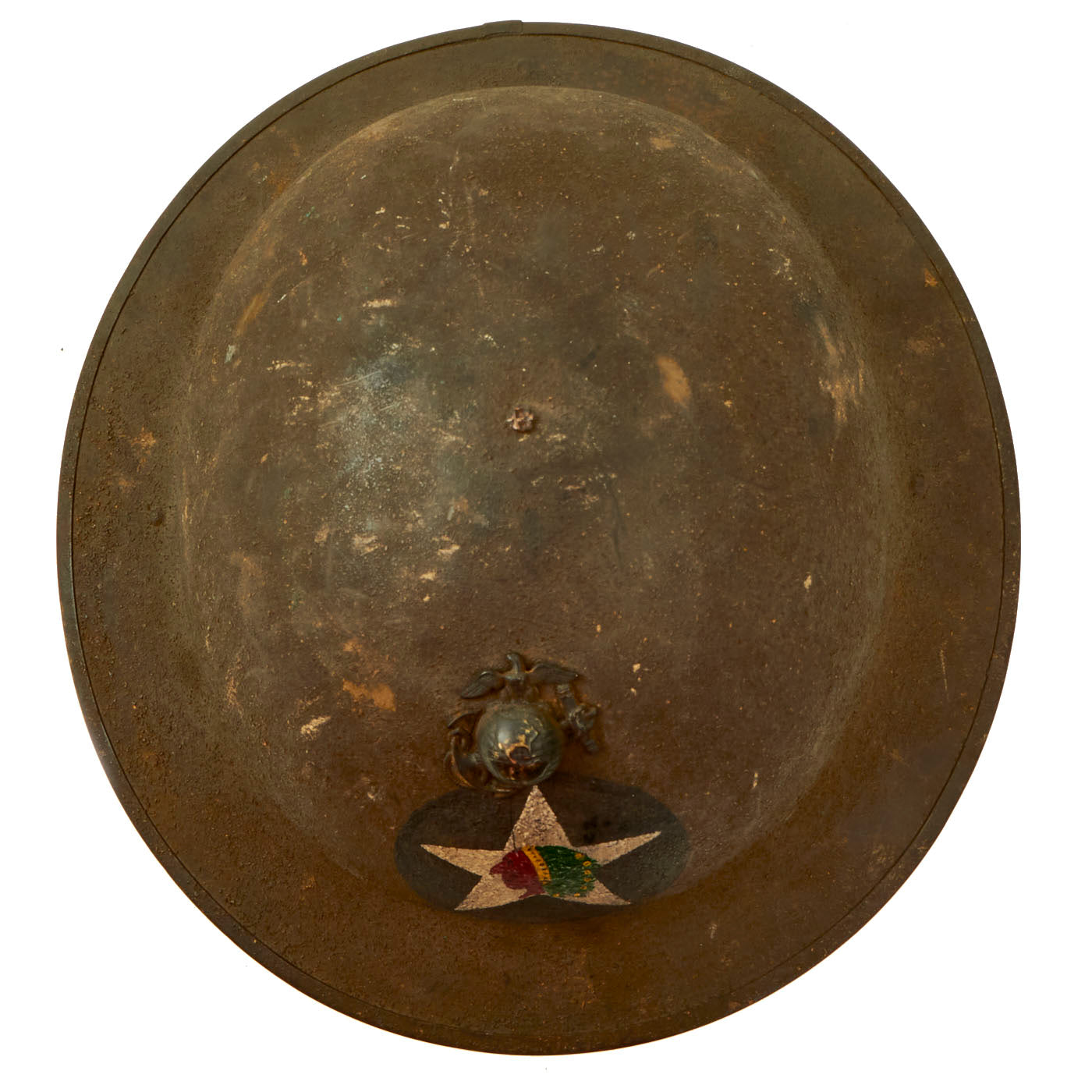 Strangely enough, there is a punch applied USMC eagle, globe and anchor present above the painted insignia. No Marine served in this regiment, unless he was an officer and was attached briefly to the unit. The Marines and the 23rd regiment fought alongside each other in various campaigns and relieved each other at these positions, so it is possible that the helmet was picked up as a replacement. The EGA was applied quite some time ago and was attached via a punched hole in the shell instead of the much later drilled hole.
