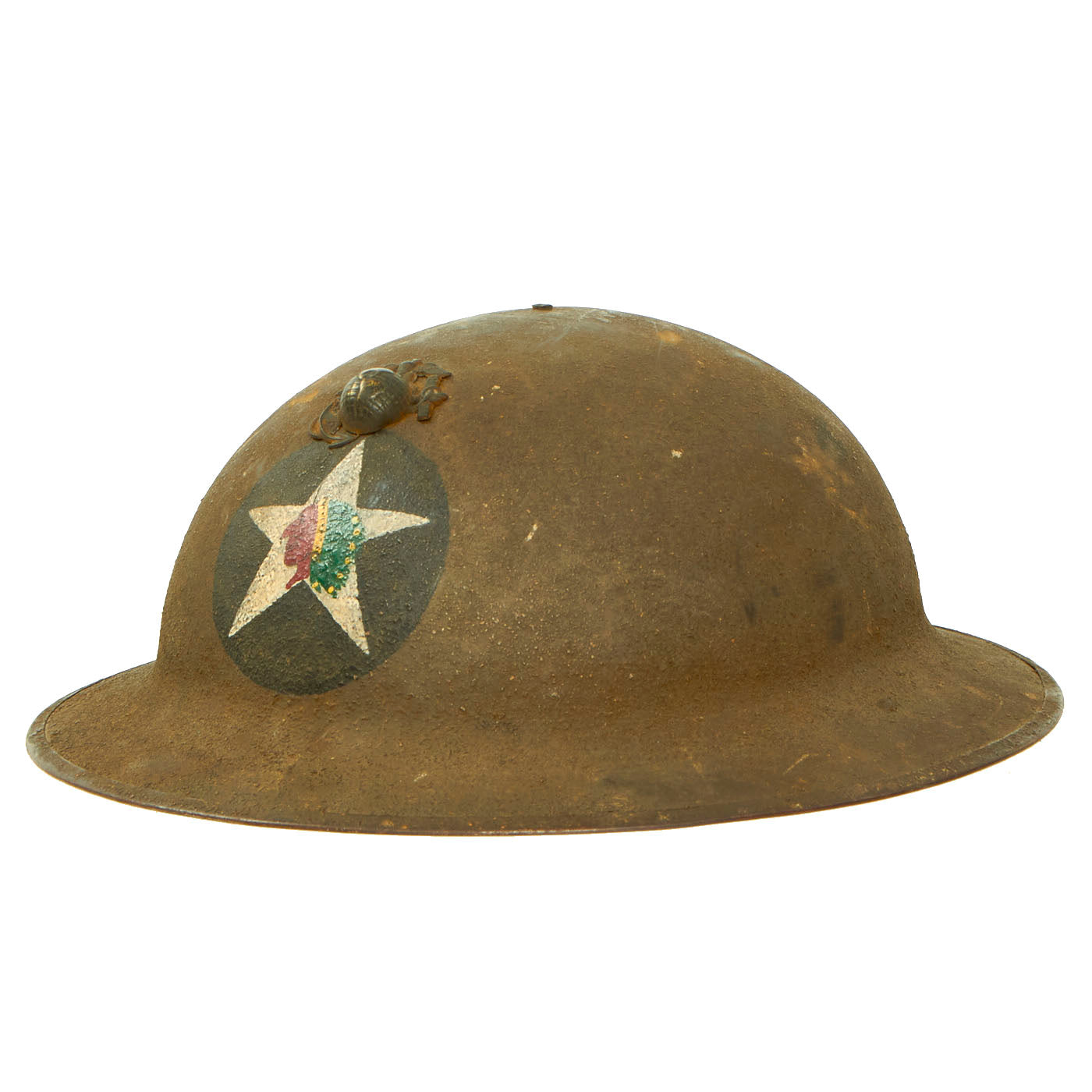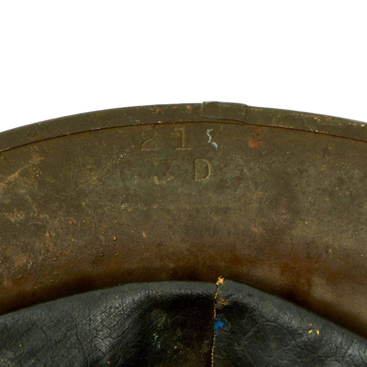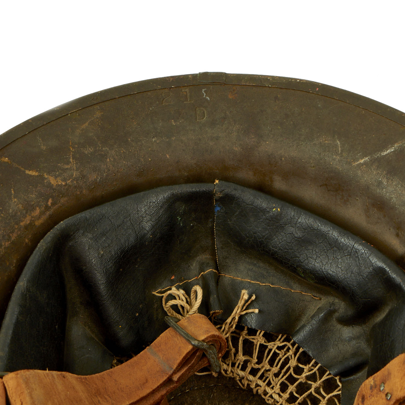 Original Item: Only One Available. This is a very nice example of an original U.S. Army M1917 "Doughboy" helmet shell, which is marked on the front with a 3rd Battalion, 23rd Infantry Regiment, 2nd Infantry Division insignia. The shell is maker marked with a stamping on the underside of the rim that reads ZD 214. This maker marking indicates that this is a U.S. produced shell, which is further indicated by the solid rivets used to retain the chin strap bales.