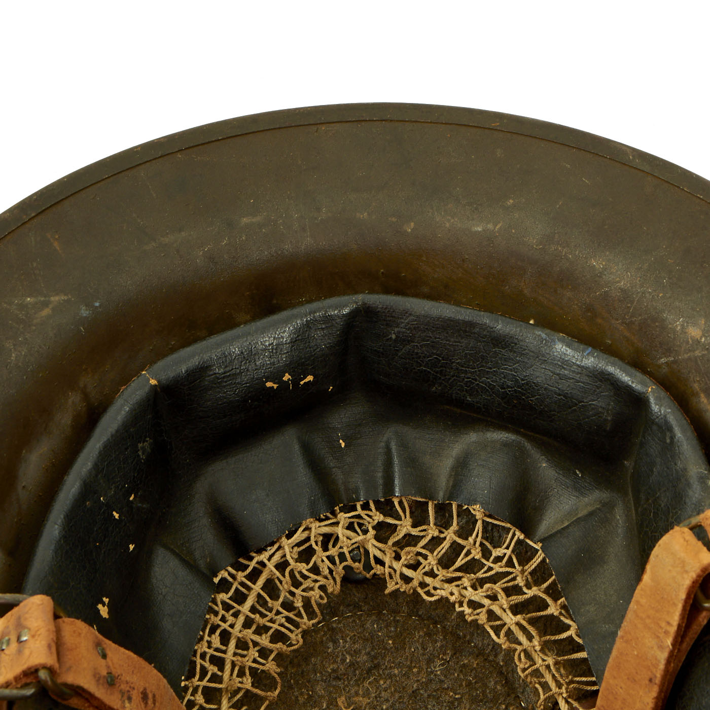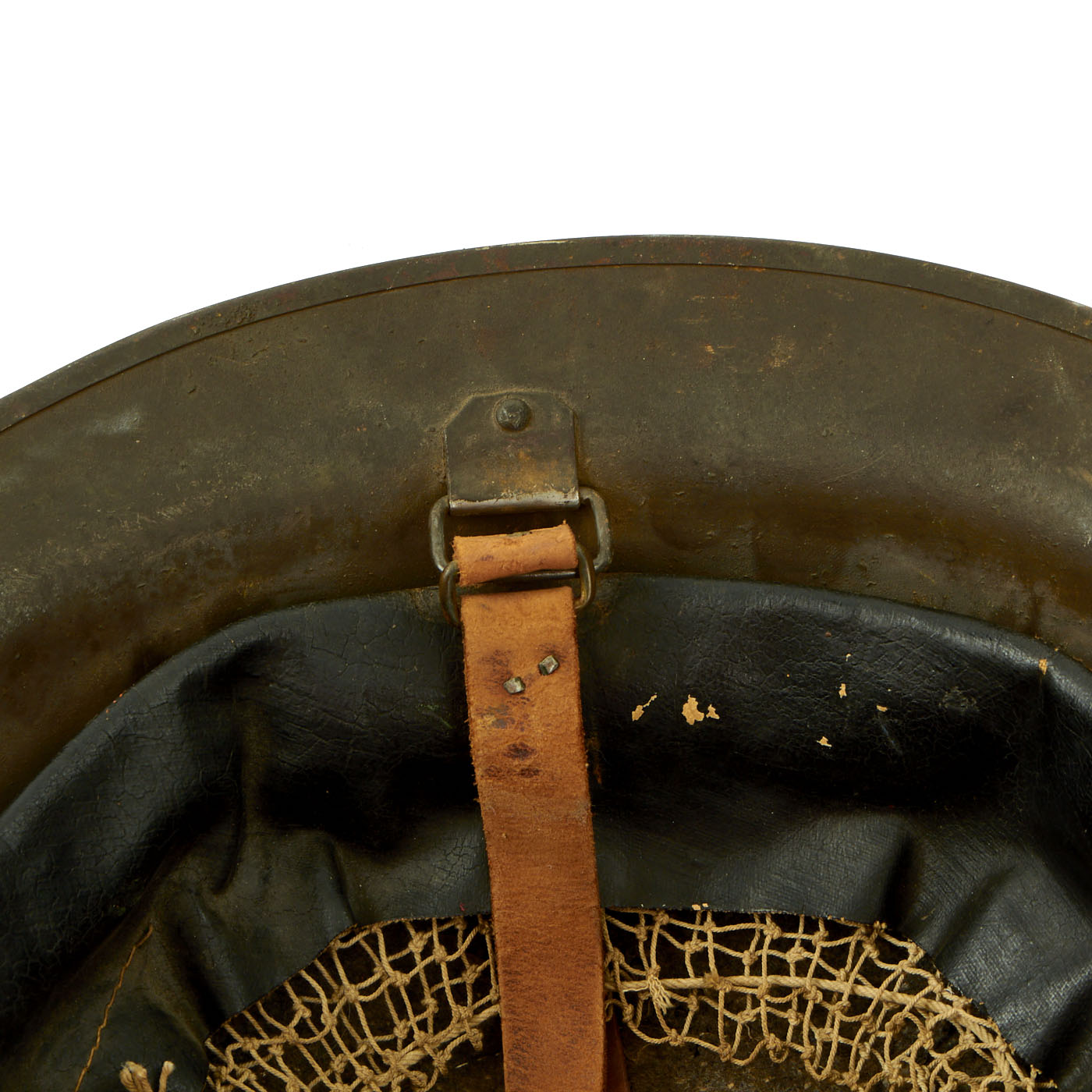 The outer shell still has about 75% or more of the original textured finish, with the interior retained at about half. There is some dirt and rust on the shell, which we left in place to preserve the patina. The liner is in wonderful condition with the size being 7 ⅜. The chinstrap is complete and present, however it is quite worn and delicate in areas.