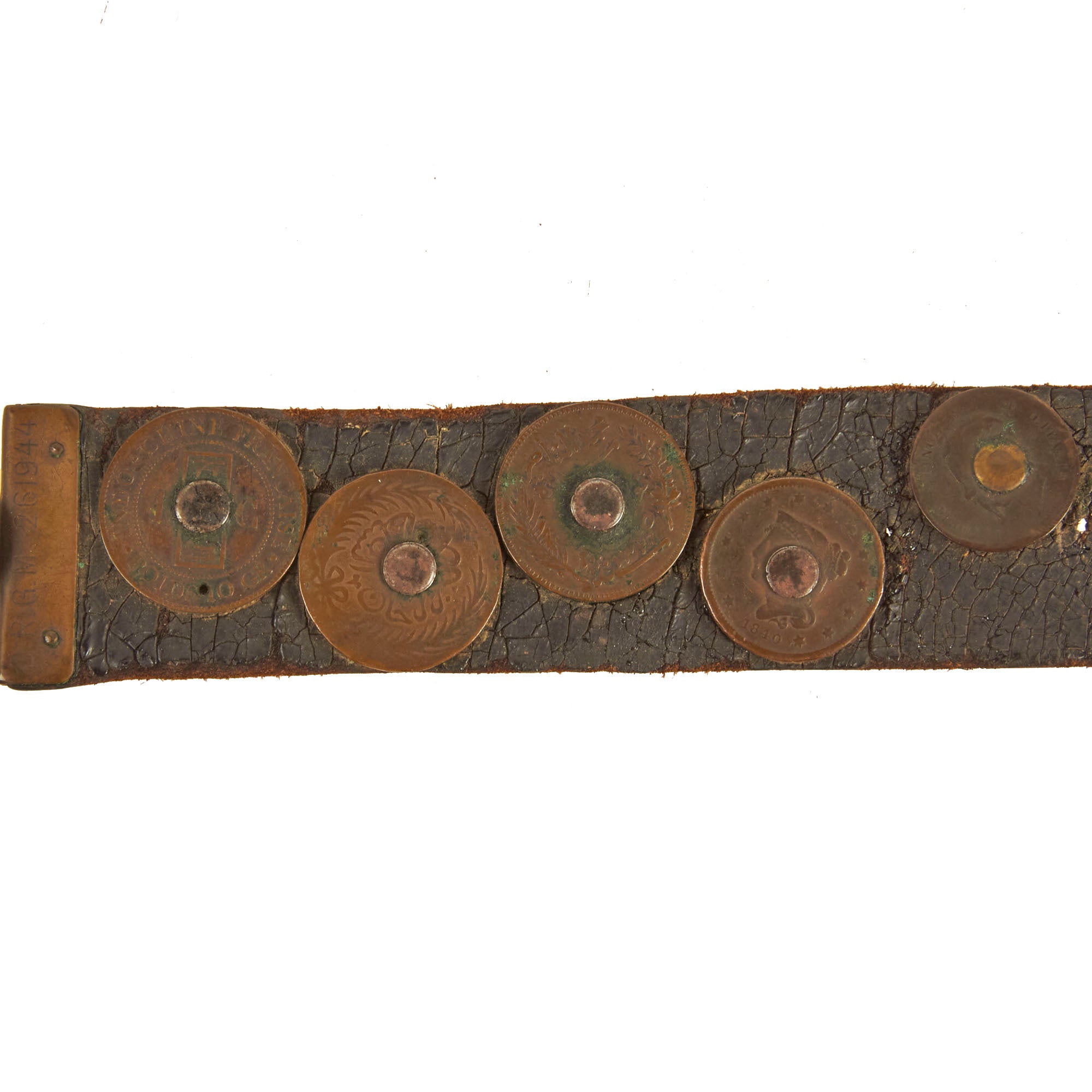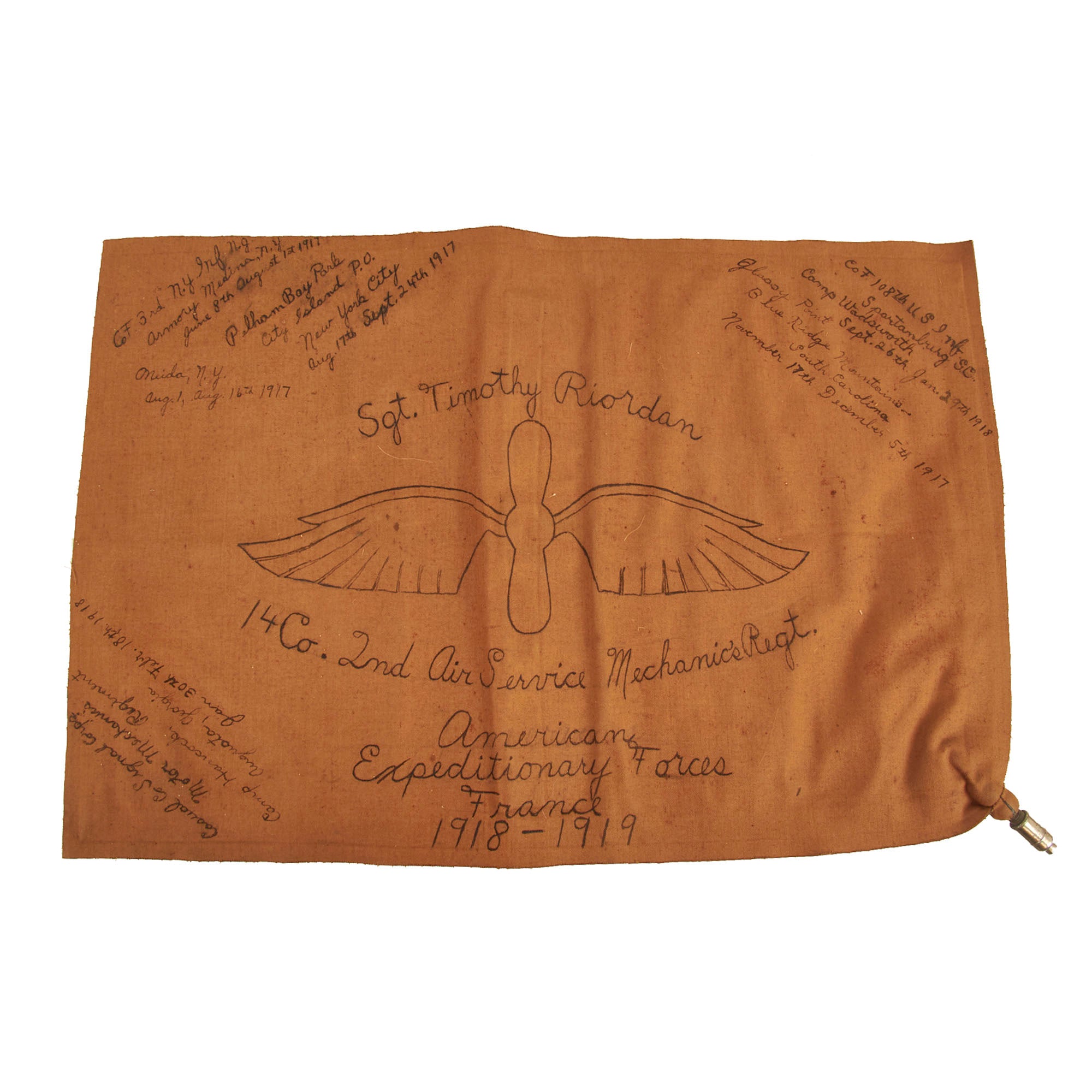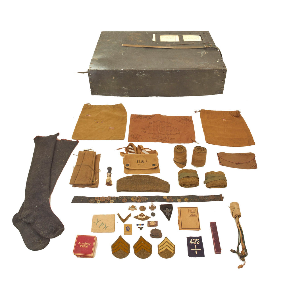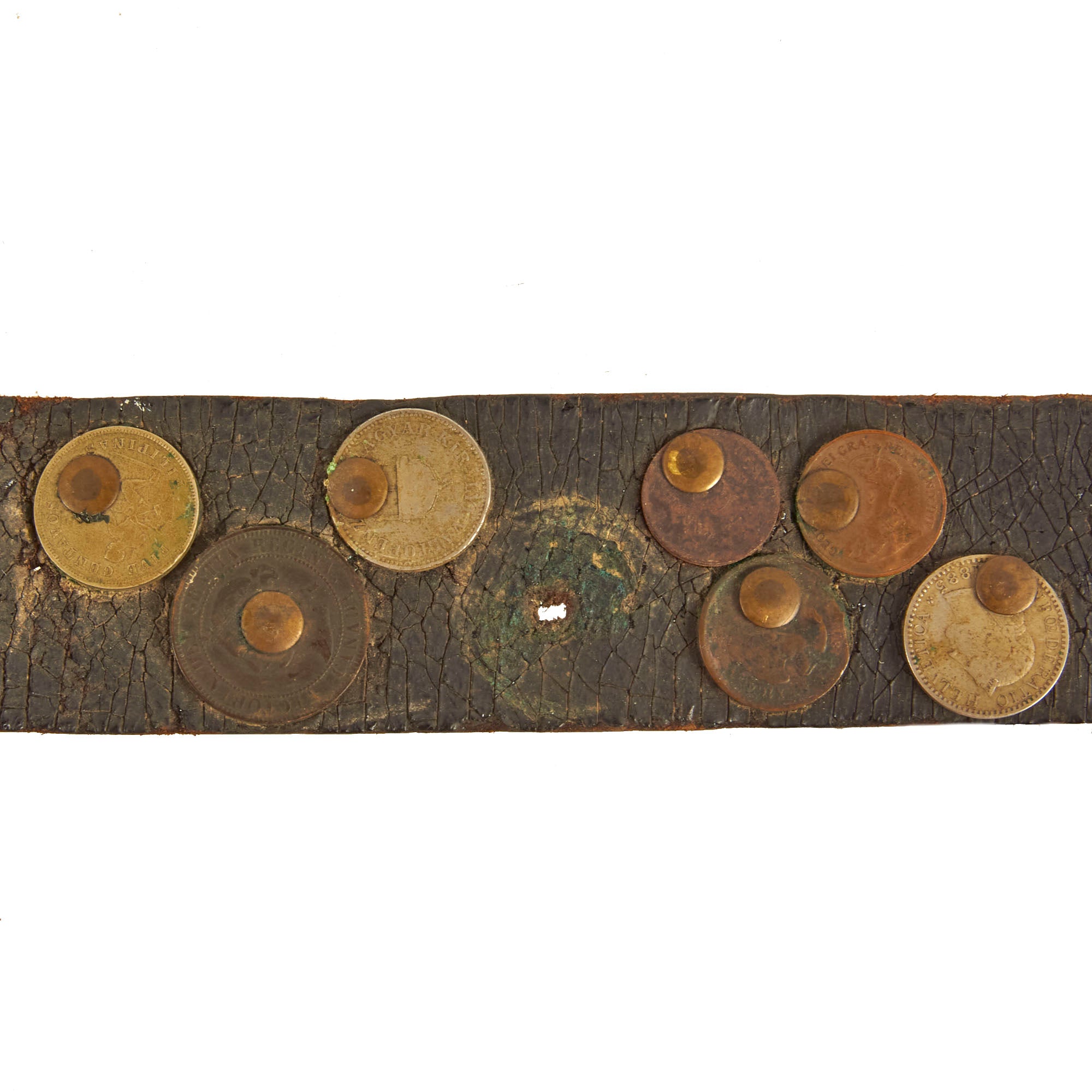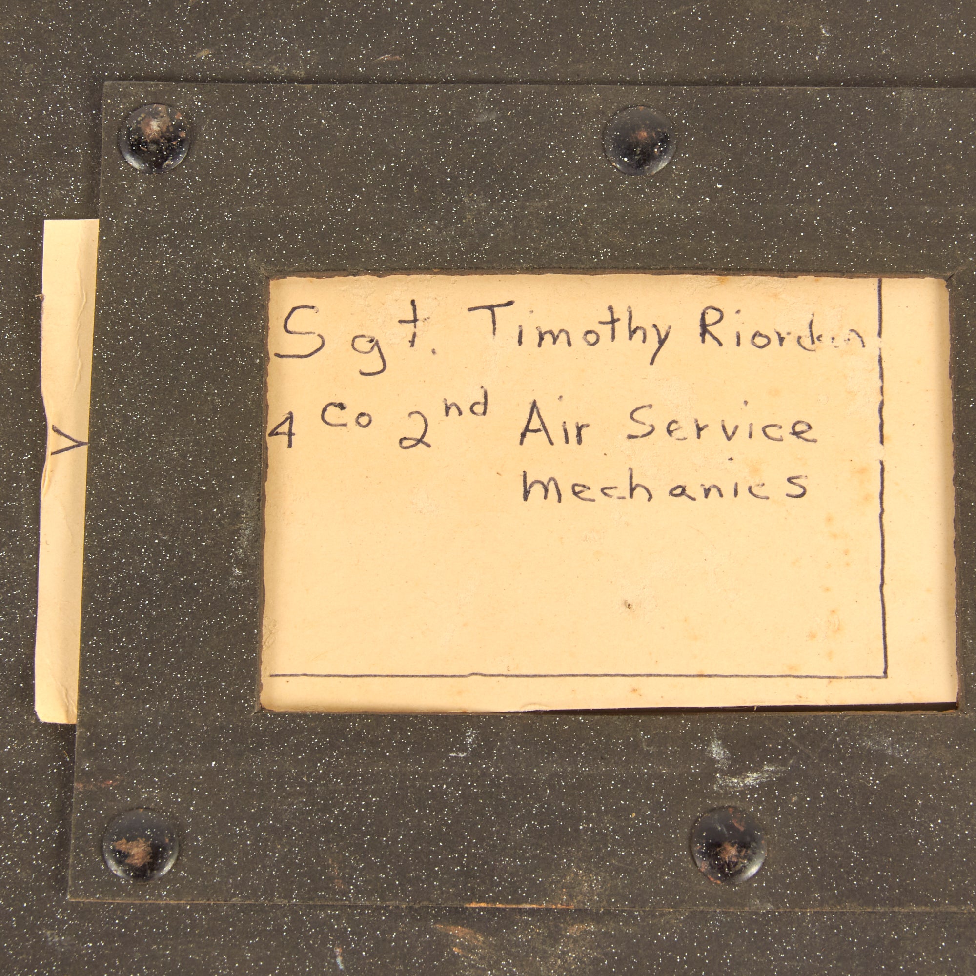 The “trunk grouping” belonged to Sergeant Timothy Riordan, a mechanic with the 2nd Army Air Service, an element established towards the end of the war. It comes in a very nice named and labeled case measuring 21" x 13" x 5". The grouping consists mainly of uniform items such as an overseas cap, leg protectors, chevrons, razors, French translation book, a red cross bag and a few pouches. There are a few items that stood out amongst the rest, one of which being a “hate belt”, but not like you are used to seeing. This leather belt is a German DRGM black leather belt without buckles and has 28 coins affixed to it via brass rivets. The coins vary in country and may have been souvenirs from countries traveled to or traded for.