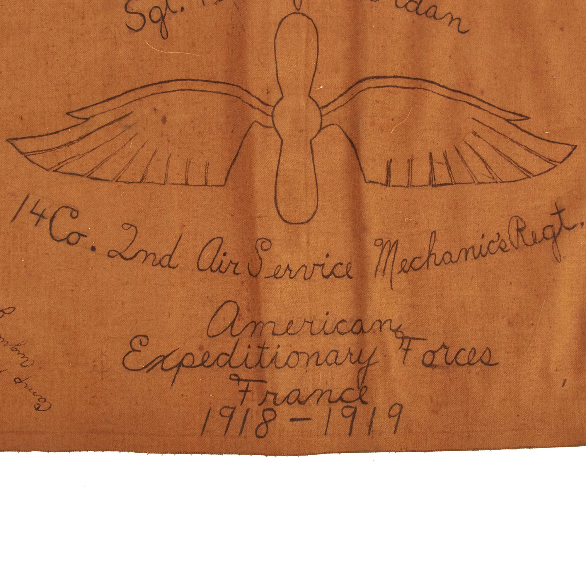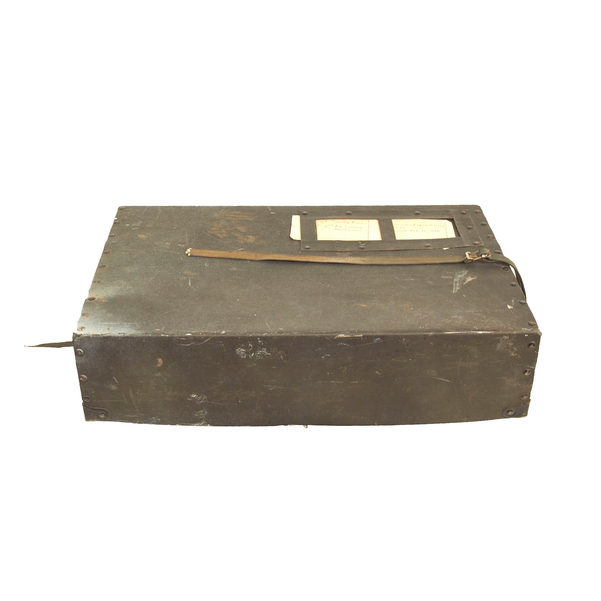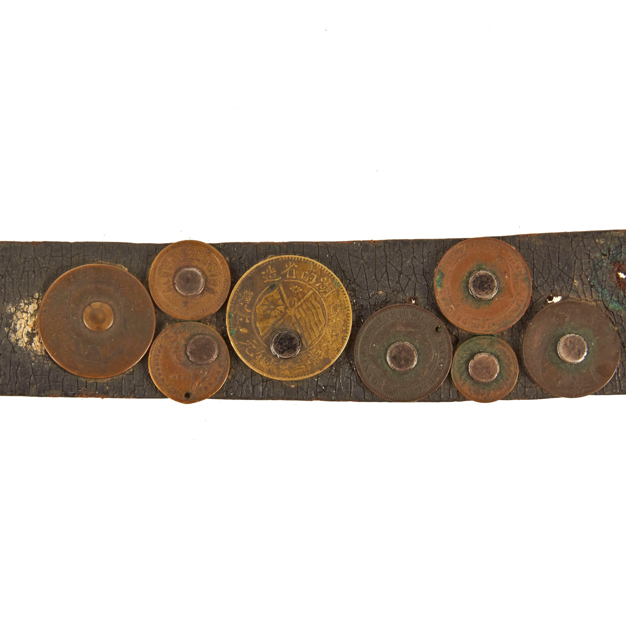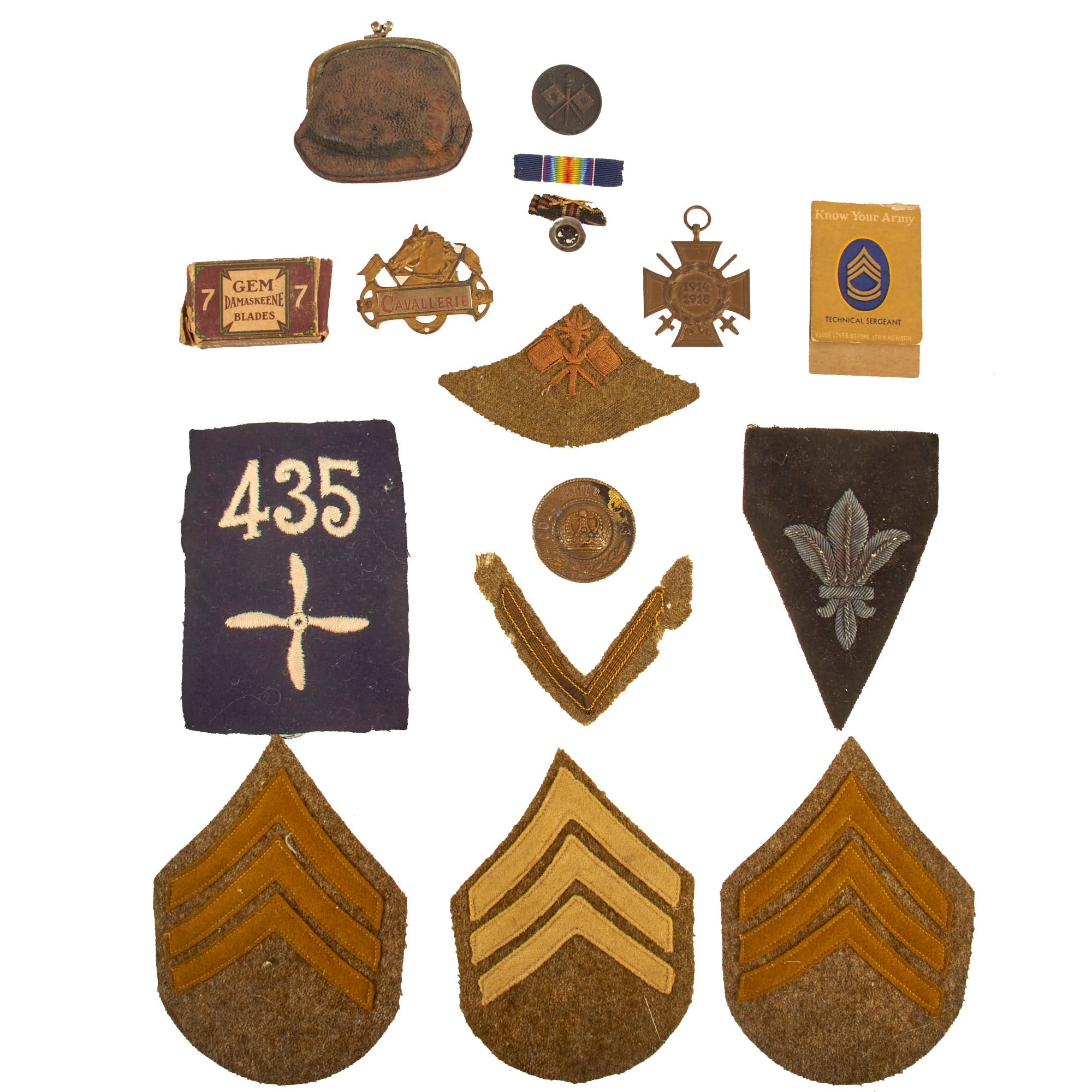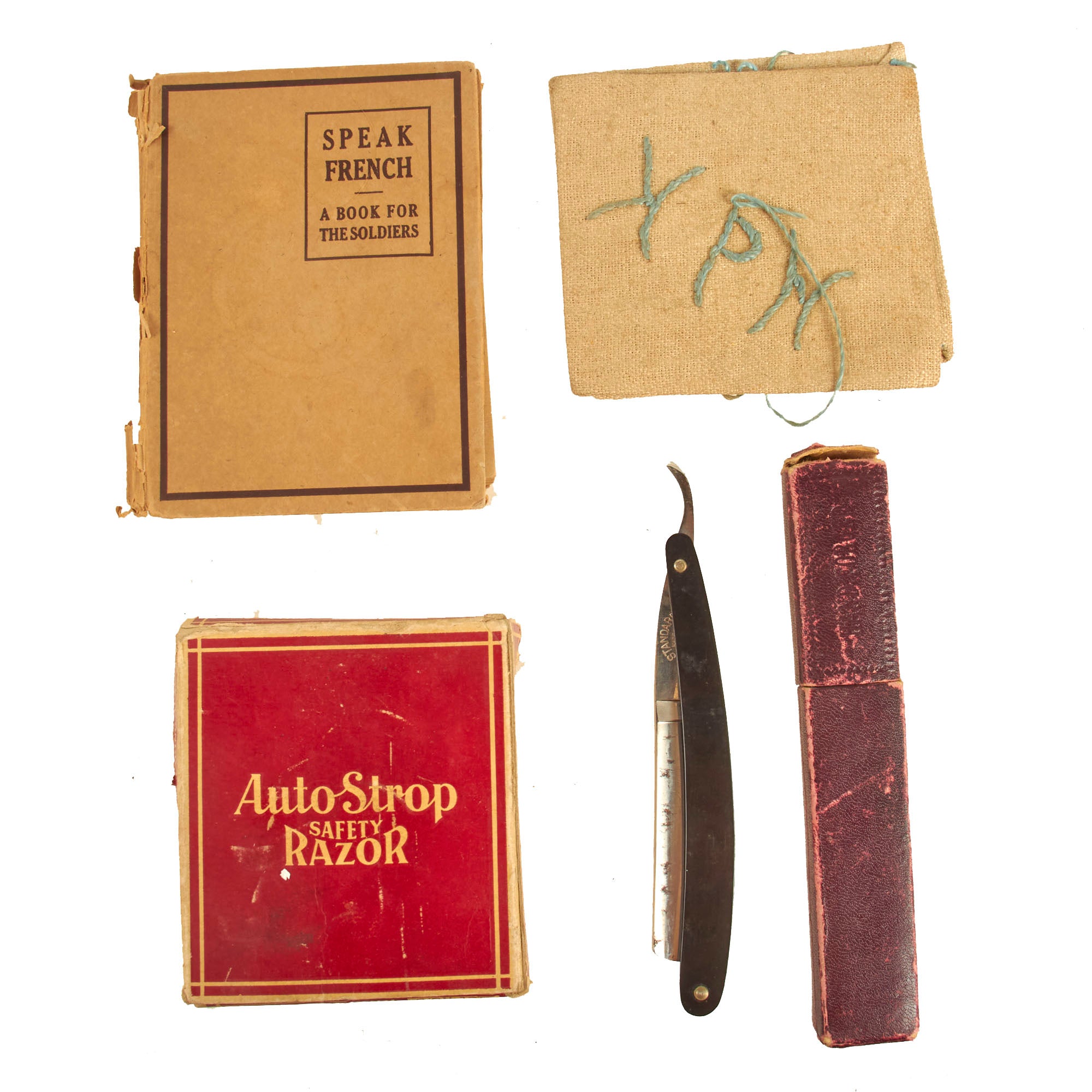 The “trunk grouping” belonged to Sergeant Timothy Riordan, a mechanic with the 2nd Army Air Service, an element established towards the end of the war. It comes in a very nice named and labeled case measuring 21" x 13" x 5". The grouping consists mainly of uniform items such as an overseas cap, leg protectors, chevrons, razors, French translation book, a red cross bag and a few pouches. There are a few items that stood out amongst the rest, one of which being a “hate belt”, but not like you are used to seeing. This leather belt is a German DRGM black leather belt without buckles and has 28 coins affixed to it via brass rivets. The coins vary in country and may have been souvenirs from countries traveled to or traded for.