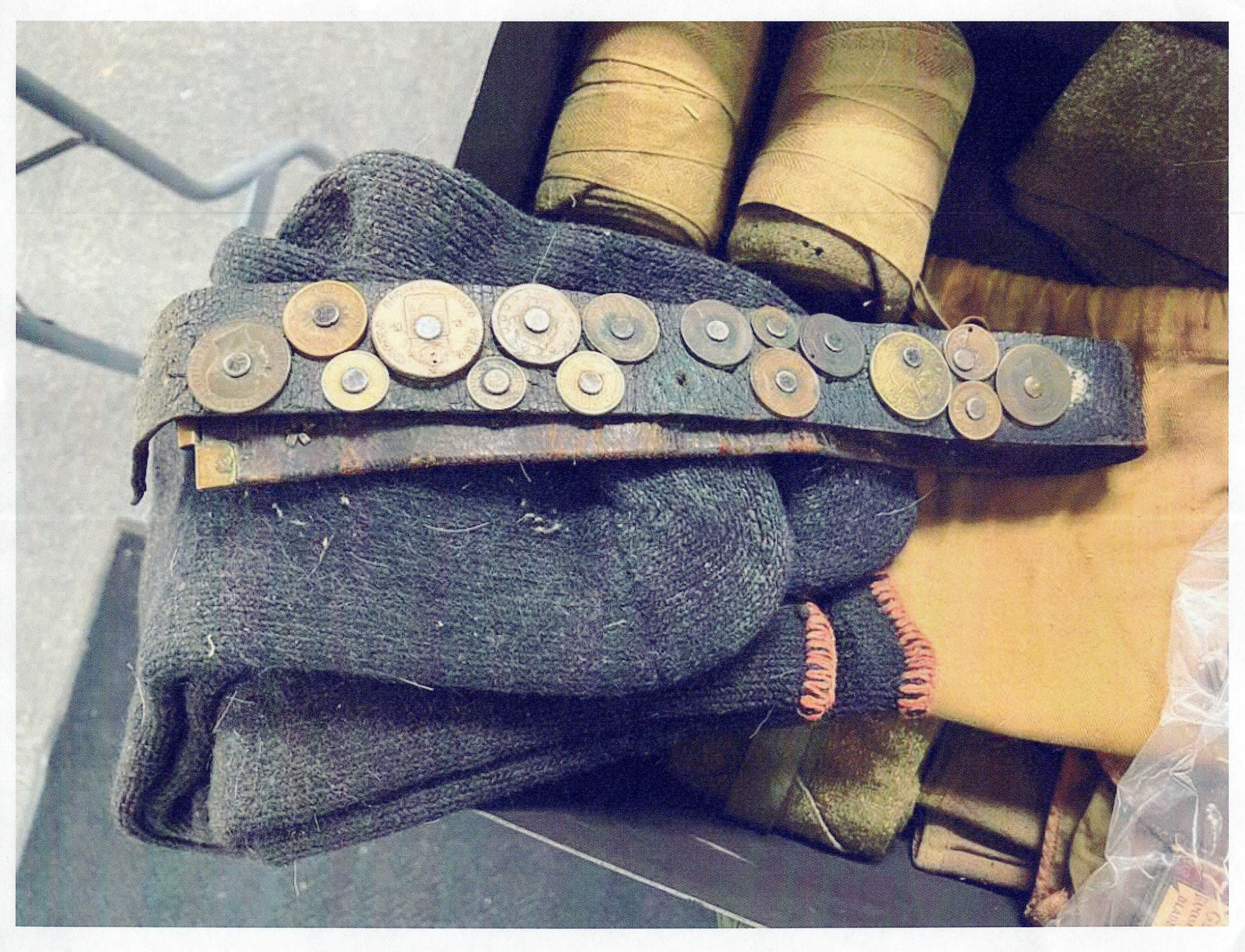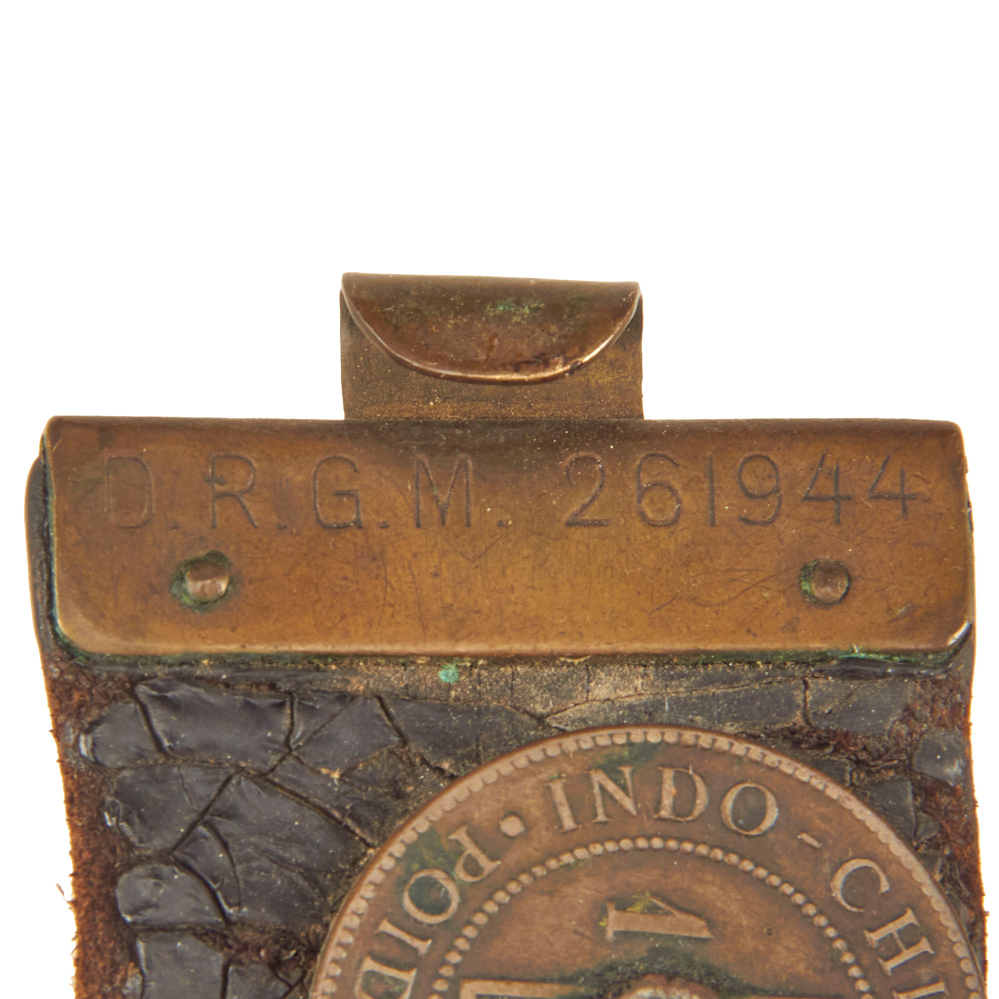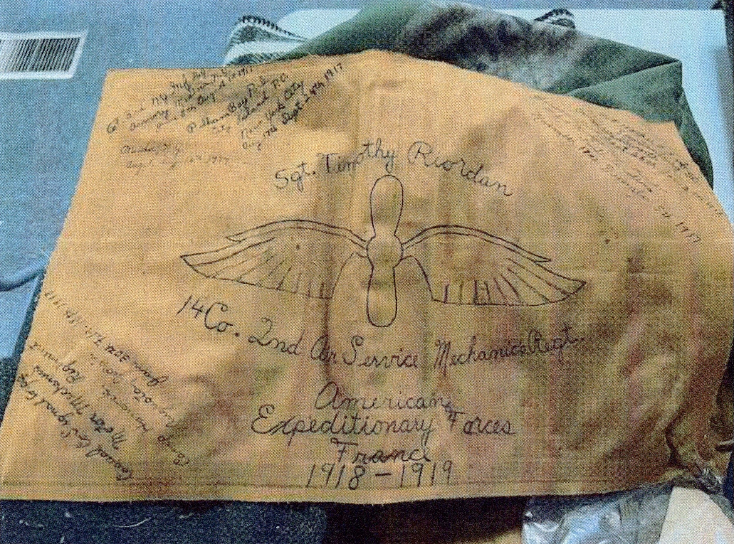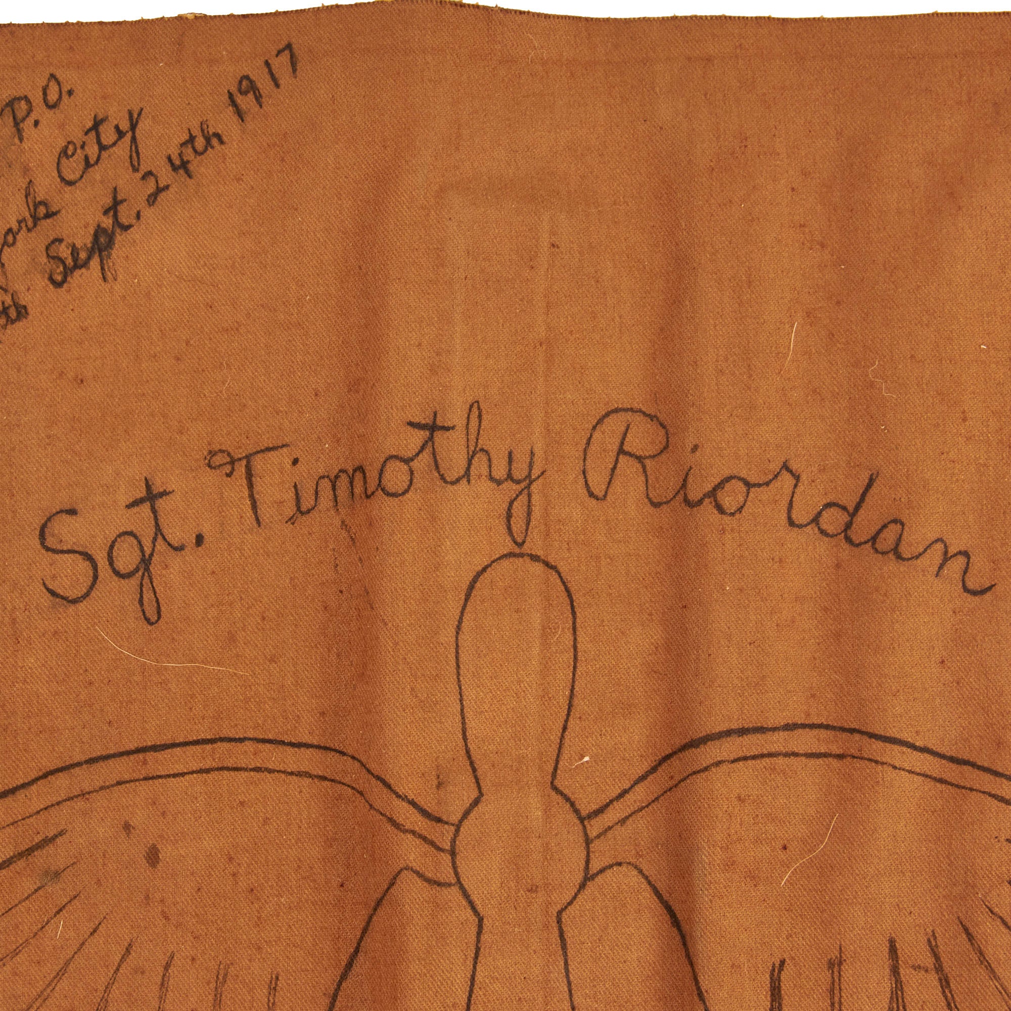The “trunk grouping” belonged to Sergeant Timothy Riordan, a mechanic with the 2nd Army Air Service, an element established towards the end of the war. It comes in a very nice named and labeled case measuring 21" x 13" x 5". The grouping consists mainly of uniform items such as an overseas cap, leg protectors, chevrons, razors, French translation book, a red cross bag and a few pouches. There are a few items that stood out amongst the rest, one of which being a “hate belt”, but not like you are used to seeing. This leather belt is a German DRGM black leather belt without buckles and has 28 coins affixed to it via brass rivets. The coins vary in country and may have been souvenirs from countries traveled to or traded for.