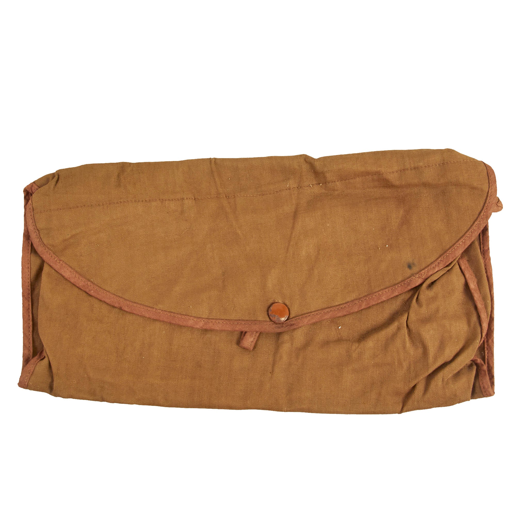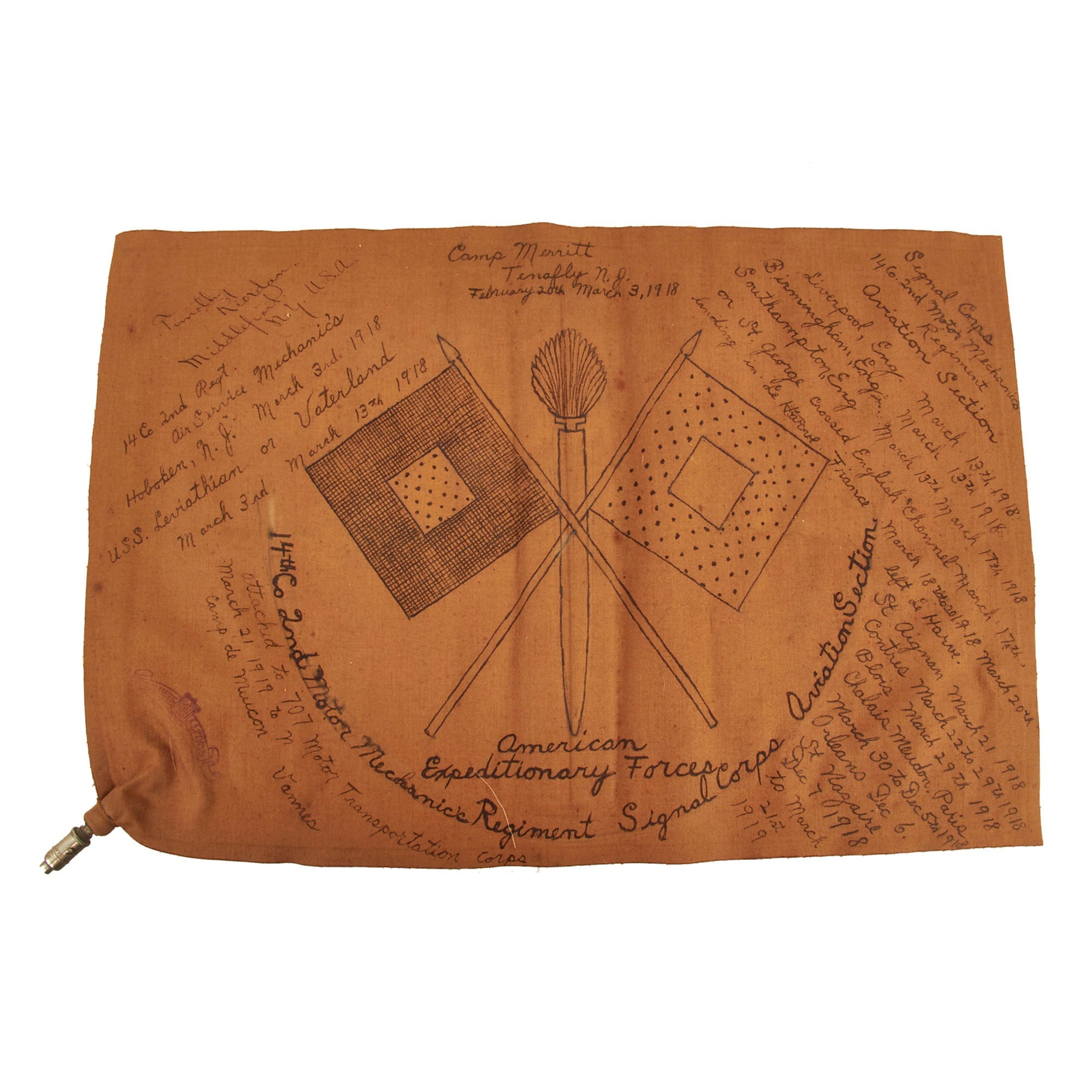The second item that stood out is a rather unique one. It is a personalized “Khaki Komfort Kushion” , an inflatable pillow. In the field or the trenches, soldiers were separated from the comfort of bedding. To help soldiers feel a bit more comfortable as they slept, companies began producing portable, inflatable pillows made out of rubber. They were compact, being stored in a rubberized pouch when not in use. To inflate the pillow, the soldier would remove the pillow from the pouch and blow into a valve stem to inflate.