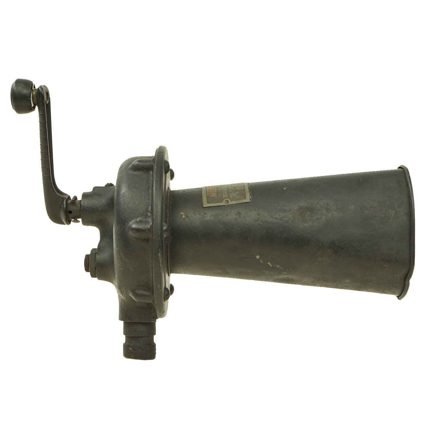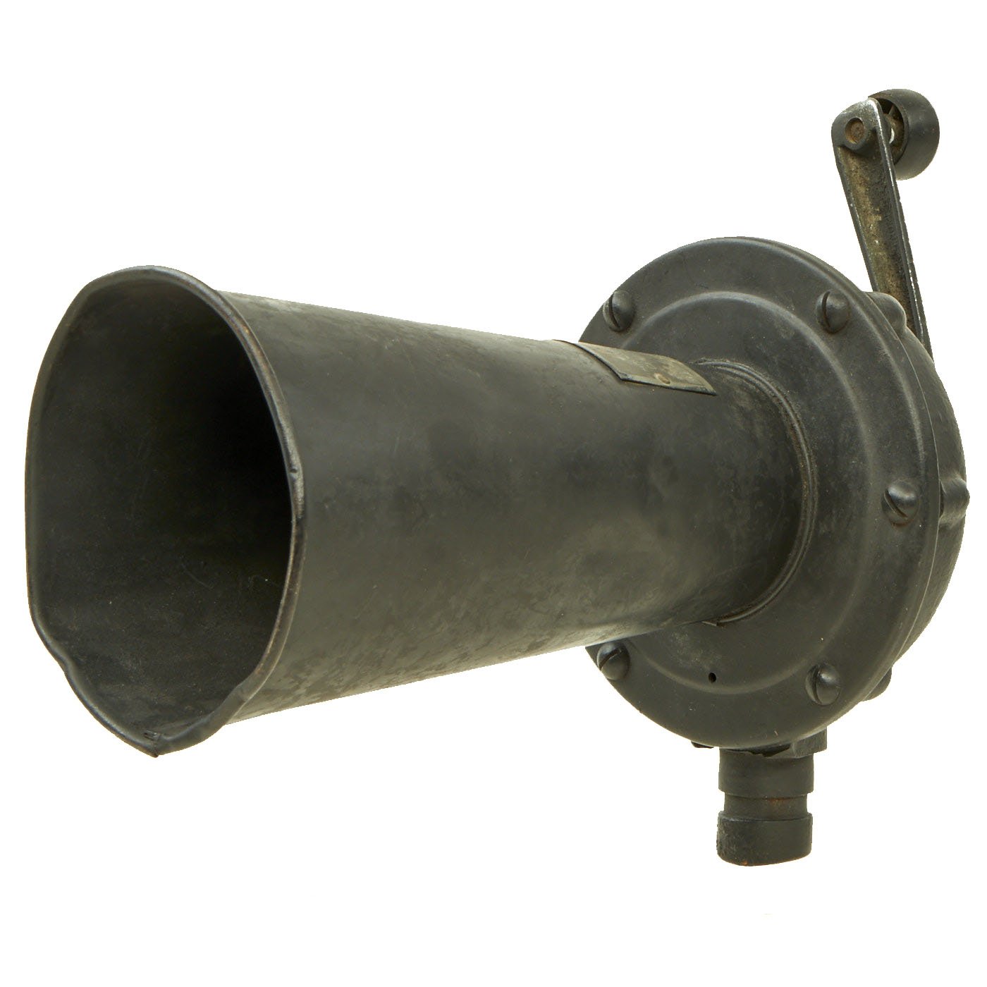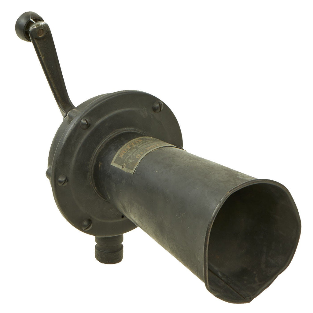 This is a great example of a U.S. WWI KLAXON brand gas alarm, which produces a very loud and jarring grating noise when turned. Often called a "cow scarer", as similar devices were used on early cars to get animals to move out of the way. It definitely looks like it is intended to mount to a vehicle, or possibly to a stand, which is unfortunately not present.