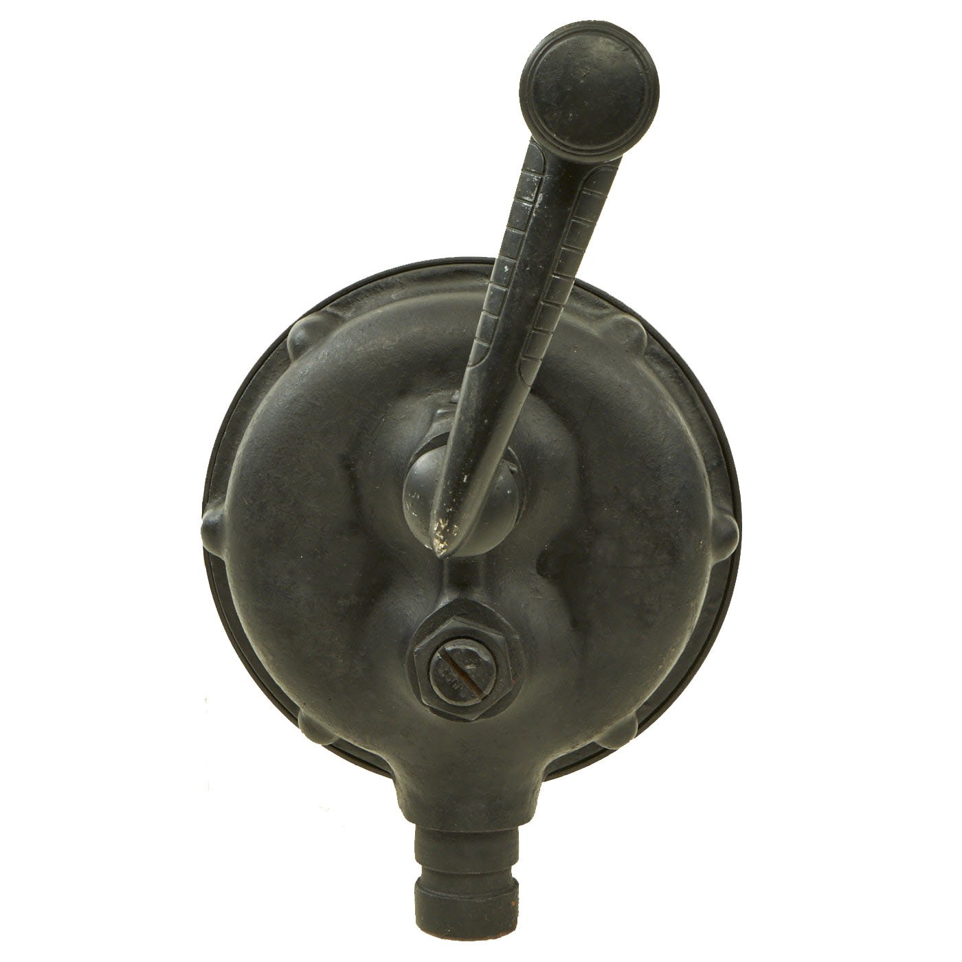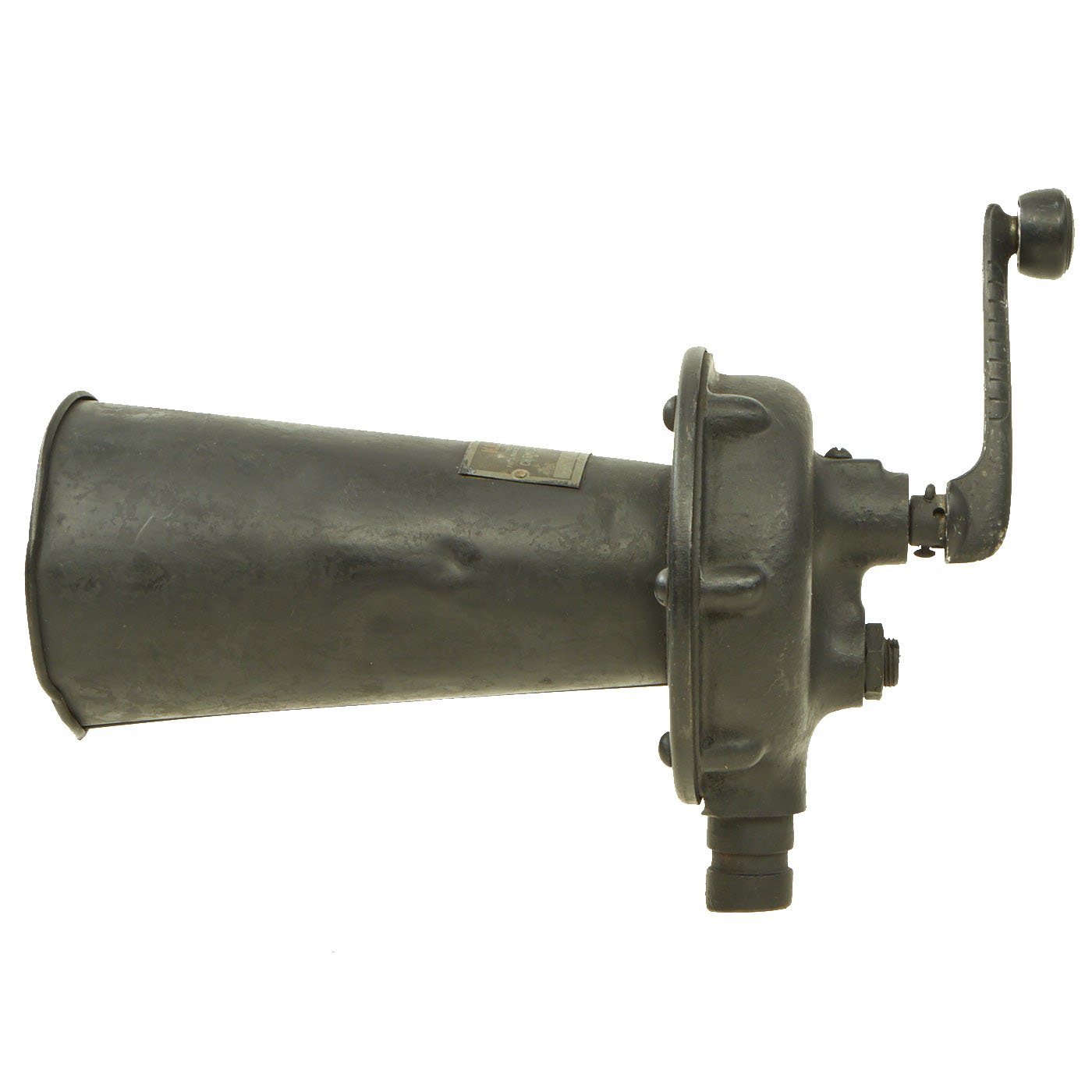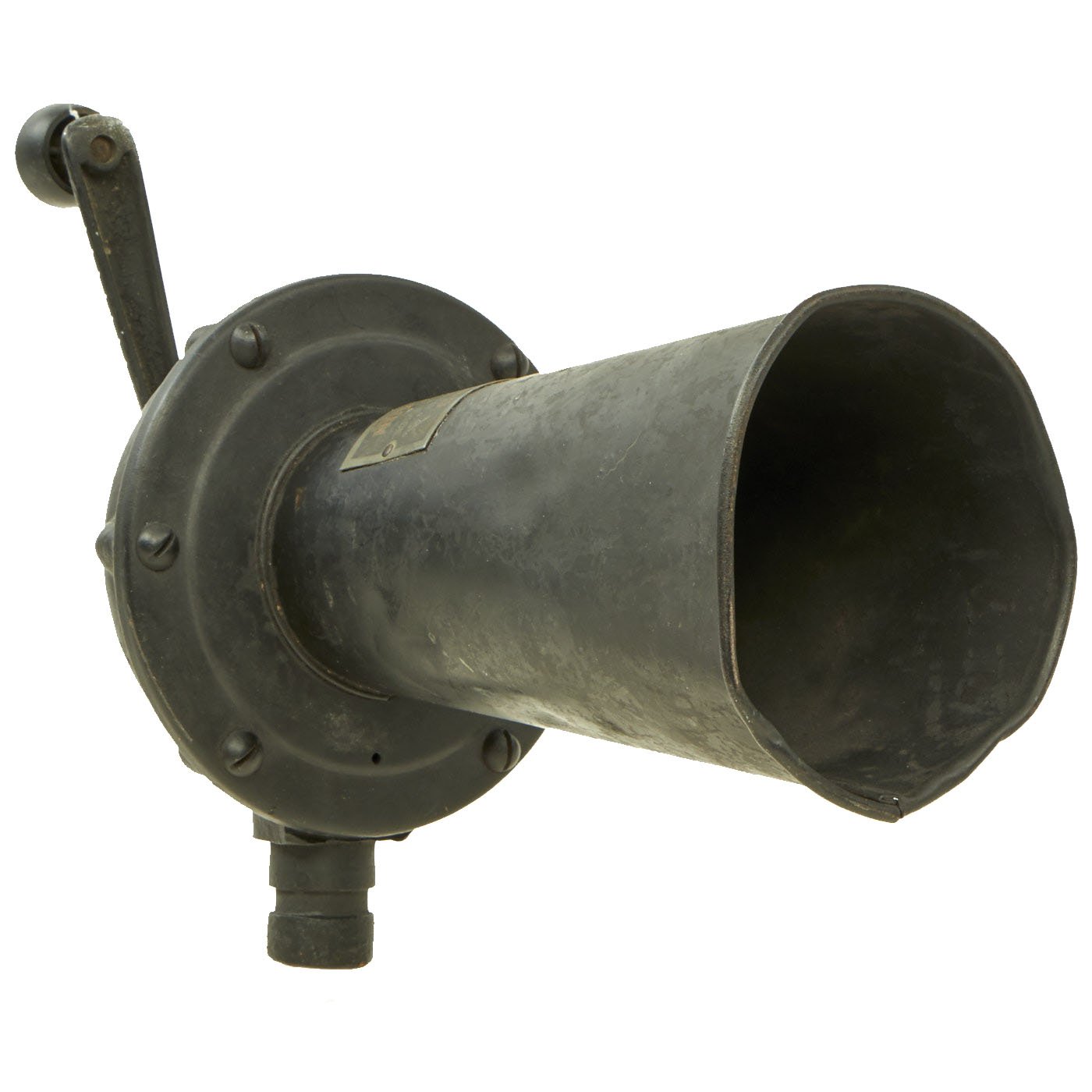 This is a great example of a U.S. WWI KLAXON brand gas alarm, which produces a very loud and jarring grating noise when turned. Often called a "cow scarer", as similar devices were used on early cars to get animals to move out of the way. It definitely looks like it is intended to mount to a vehicle, or possibly to a stand, which is unfortunately not present.