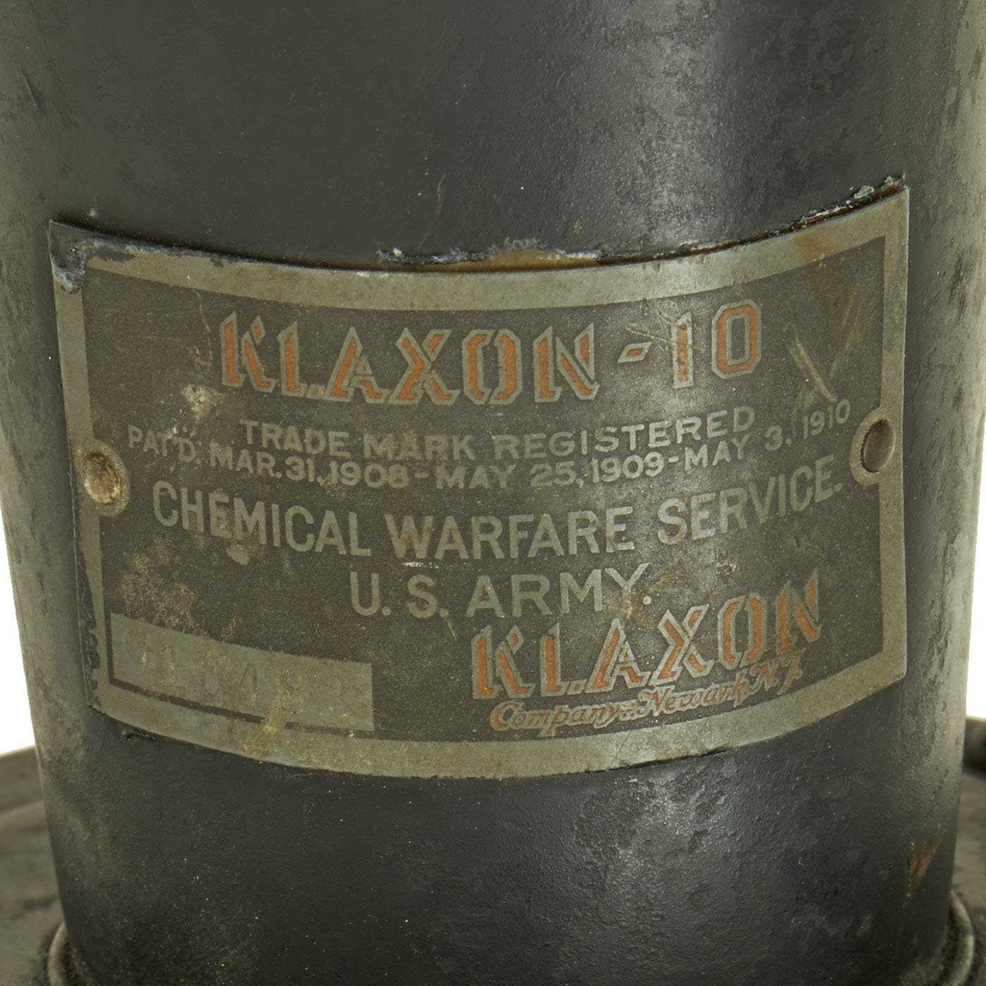 It also is marked with serial number G10488 on the lower left corner. Overall the Klaxon measures 11 1/2" long x 6" x 7".