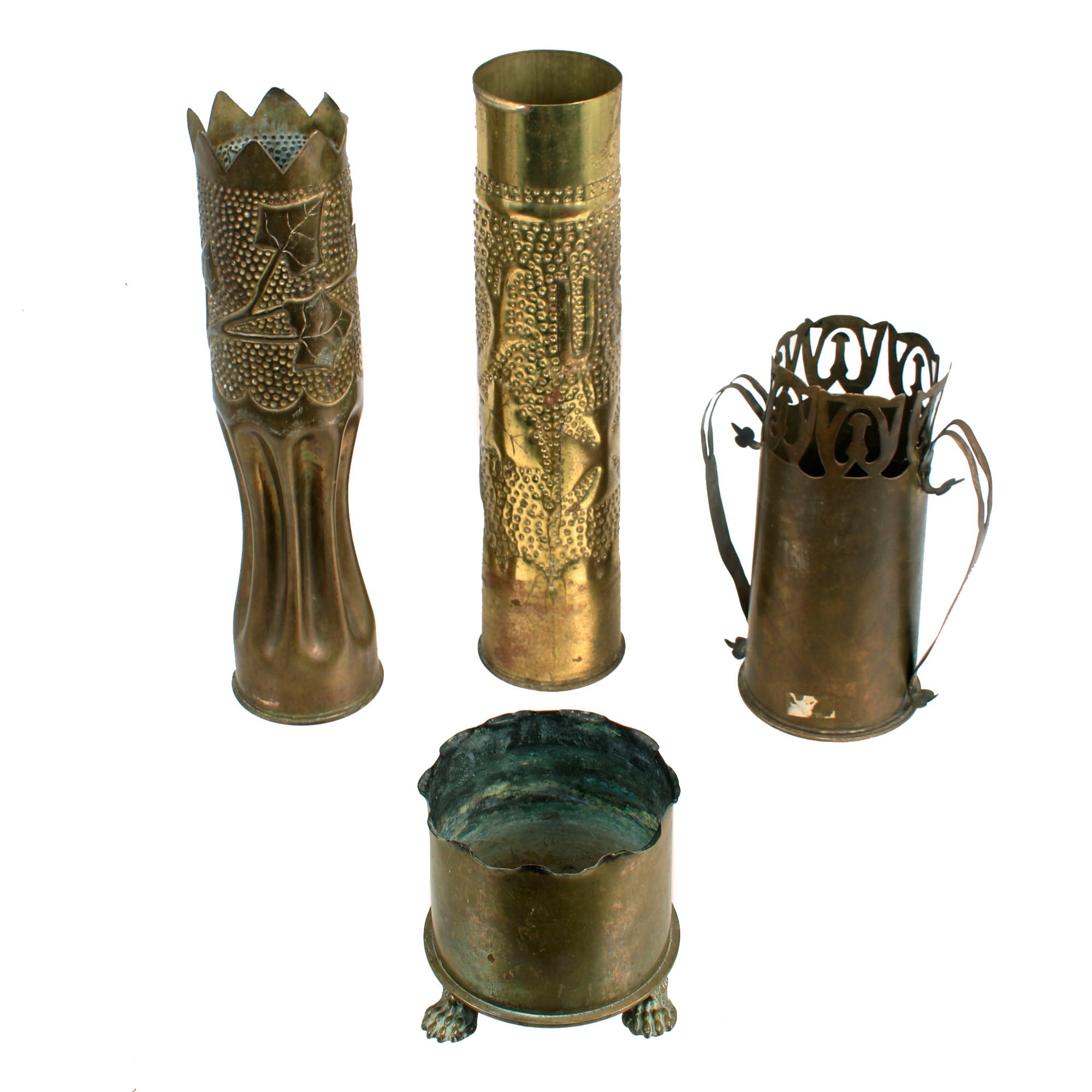 Original Items: Only One Lot of 4 Available. Here we have a lovely lot of four WWI Trench Art Brass Shell Casings, which really show the wide variety of different shapes and purposes that these could be turned into. The shells here still retain their markings on the base, and two of four exhibit clear WWI dates. This lot consists of three uniquely decorated and crafted shells, consisting of: