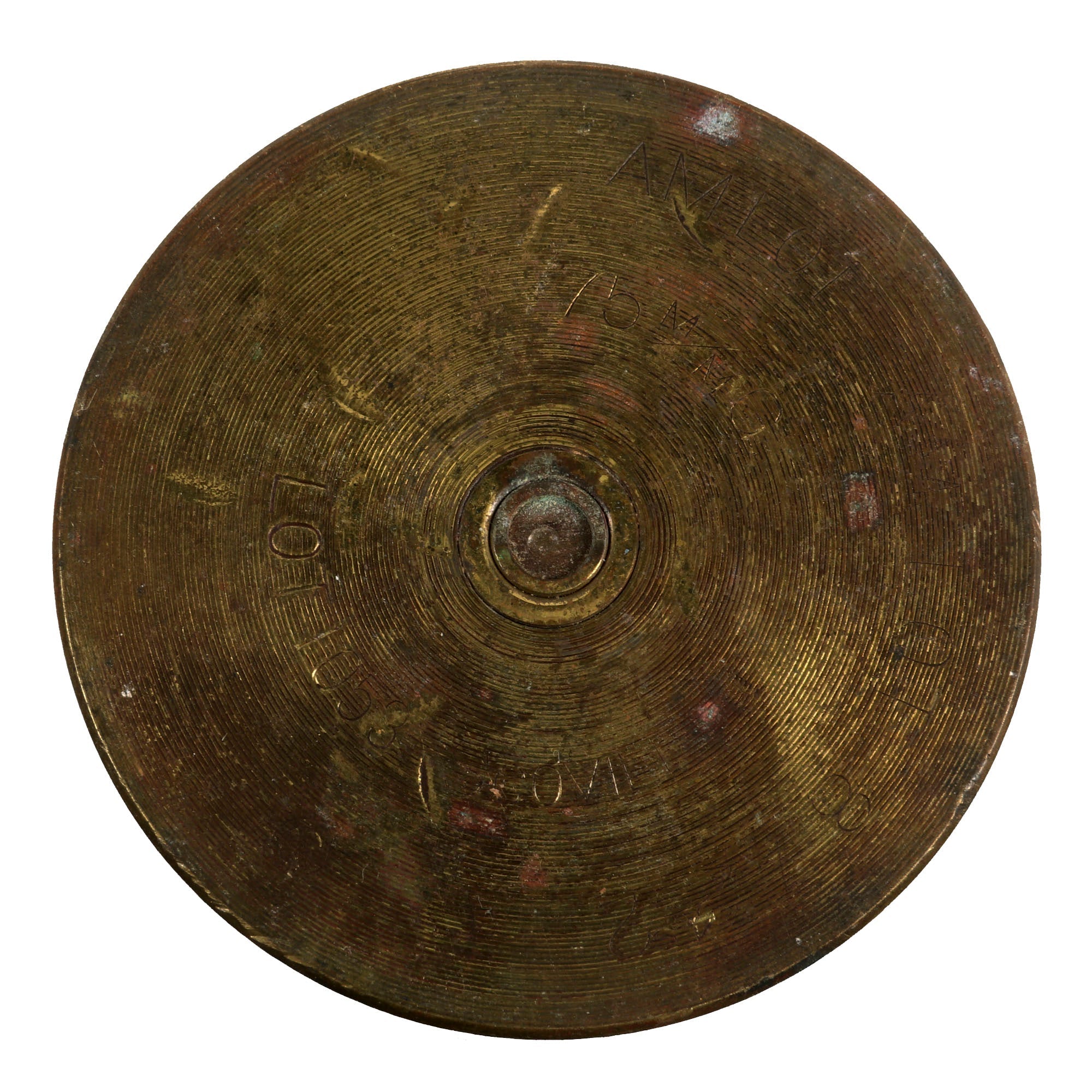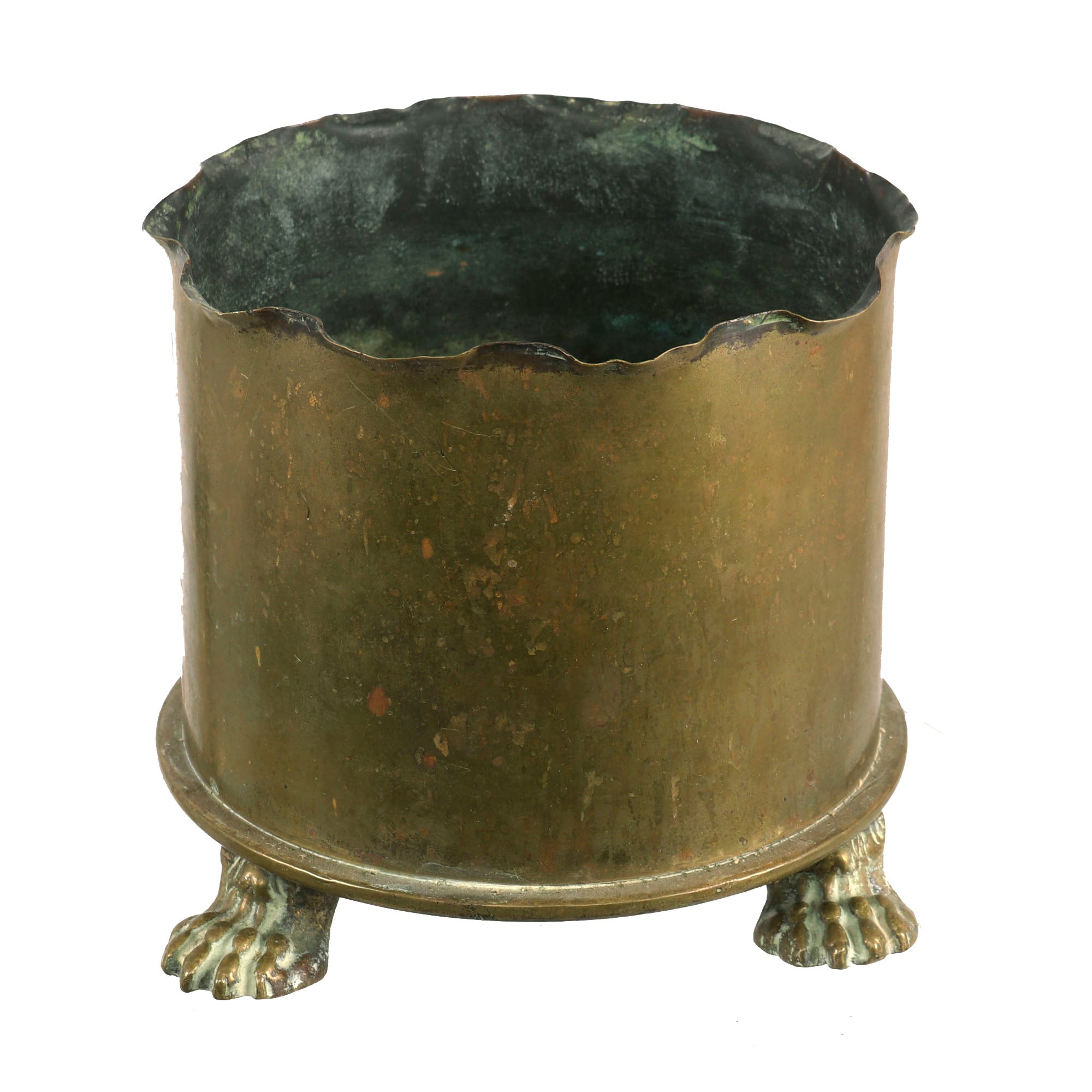 - German WWI 10.5 cm Feldhaubitze 98/09 Shell Casing, which looks to have been turned into possibly an ash tray, or maybe a candy bowl. The top edge of the casing has been fluted to give it a nice scalloped edge, and some brass "paws" were installed on the bottom, held in place by steel screws. The bottom of the casing bears the full maker information from PATRONENFABRIK KARLSRUHE along with a date of DEZ. 1915. There are the correct proof marks as well as the Sp255 inspection stamp, correct for this maker. Measures approximately 4 1/4 tall.