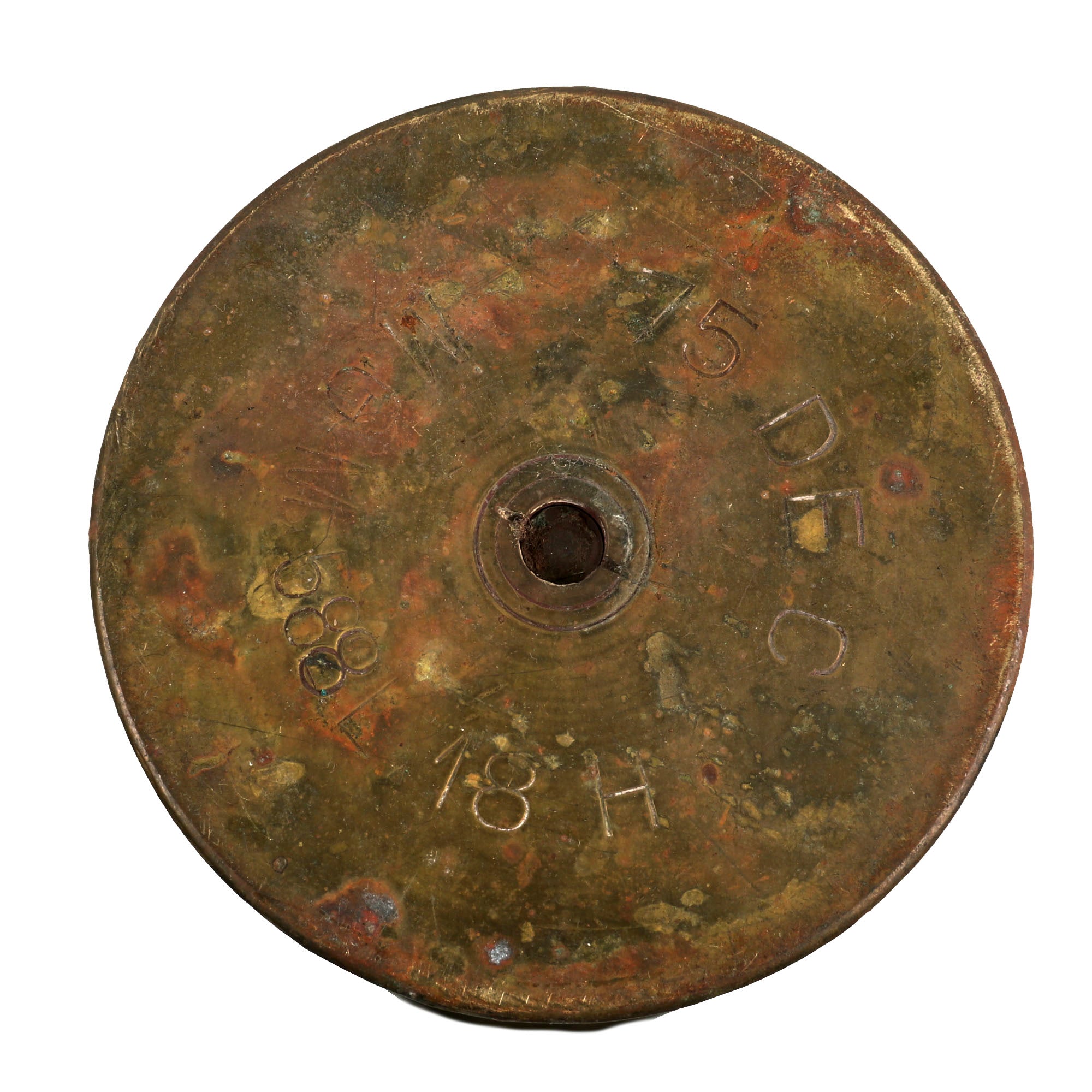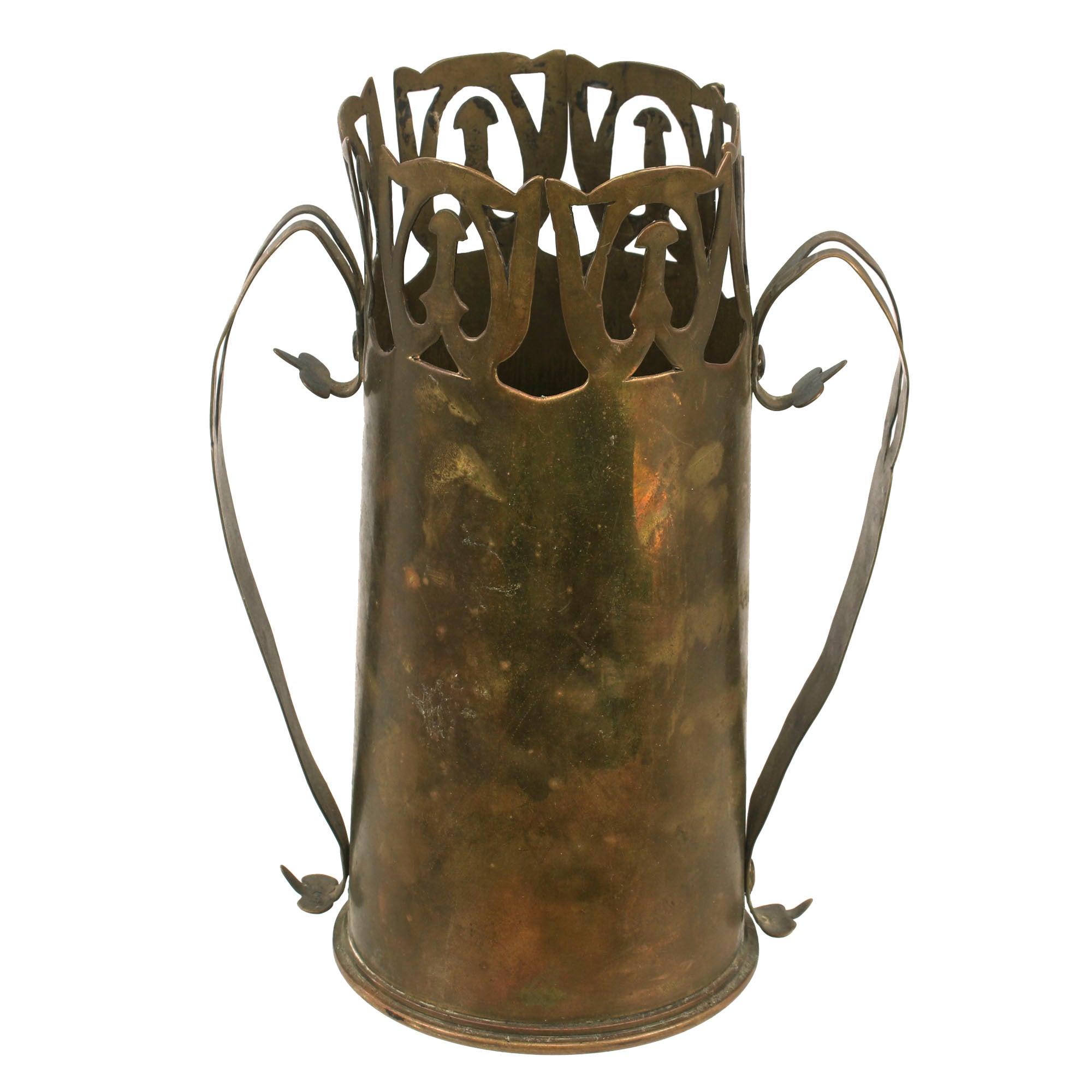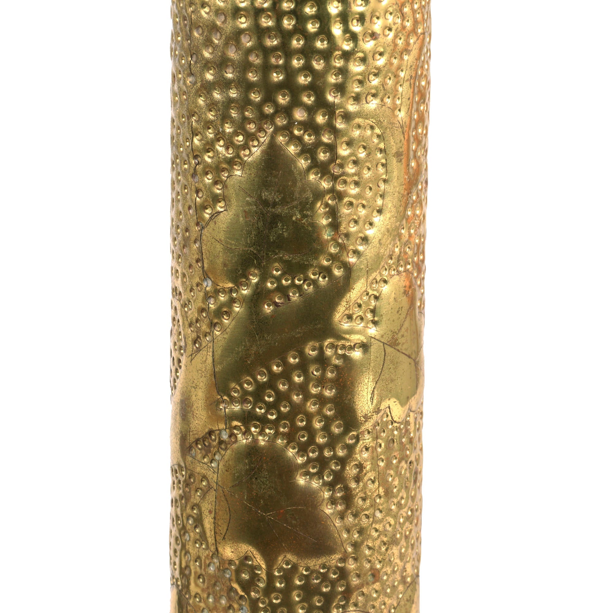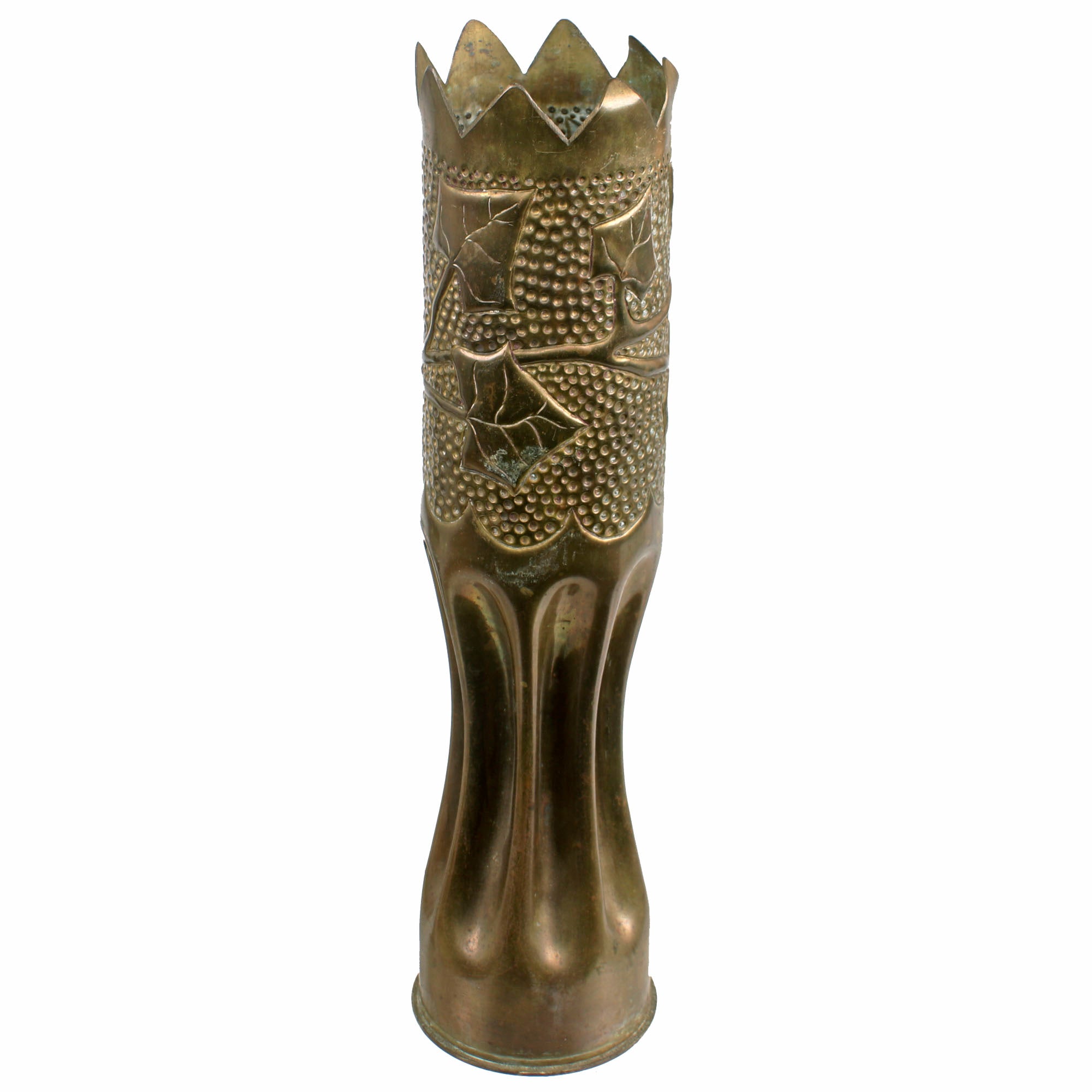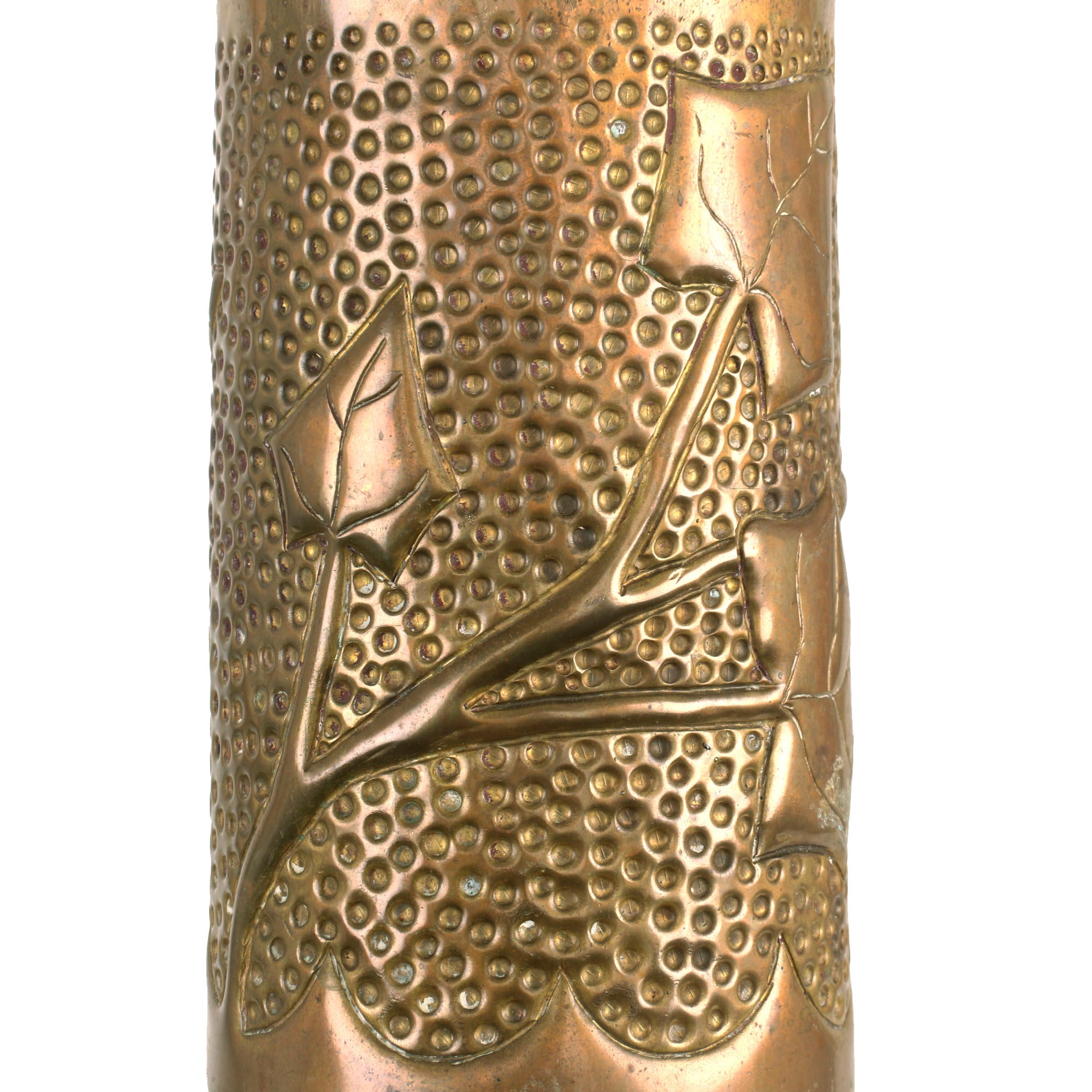 - U.S. WWI 75mm Shell casing which has had the bottom half pressed in so that it has 6 flutes, which also narrows the overall width a bit. We have seen this on many other trench art shell casings from the period. The top has some lovely ivy leaves on a vine, with a punched brass background. The top has has had a saw tooth motif added to the edge of the casing. The bottom is marked 75 DE C along with some lot number markings. We assume this was intended as some type of vase, and is approximately 13 5/8" tall.