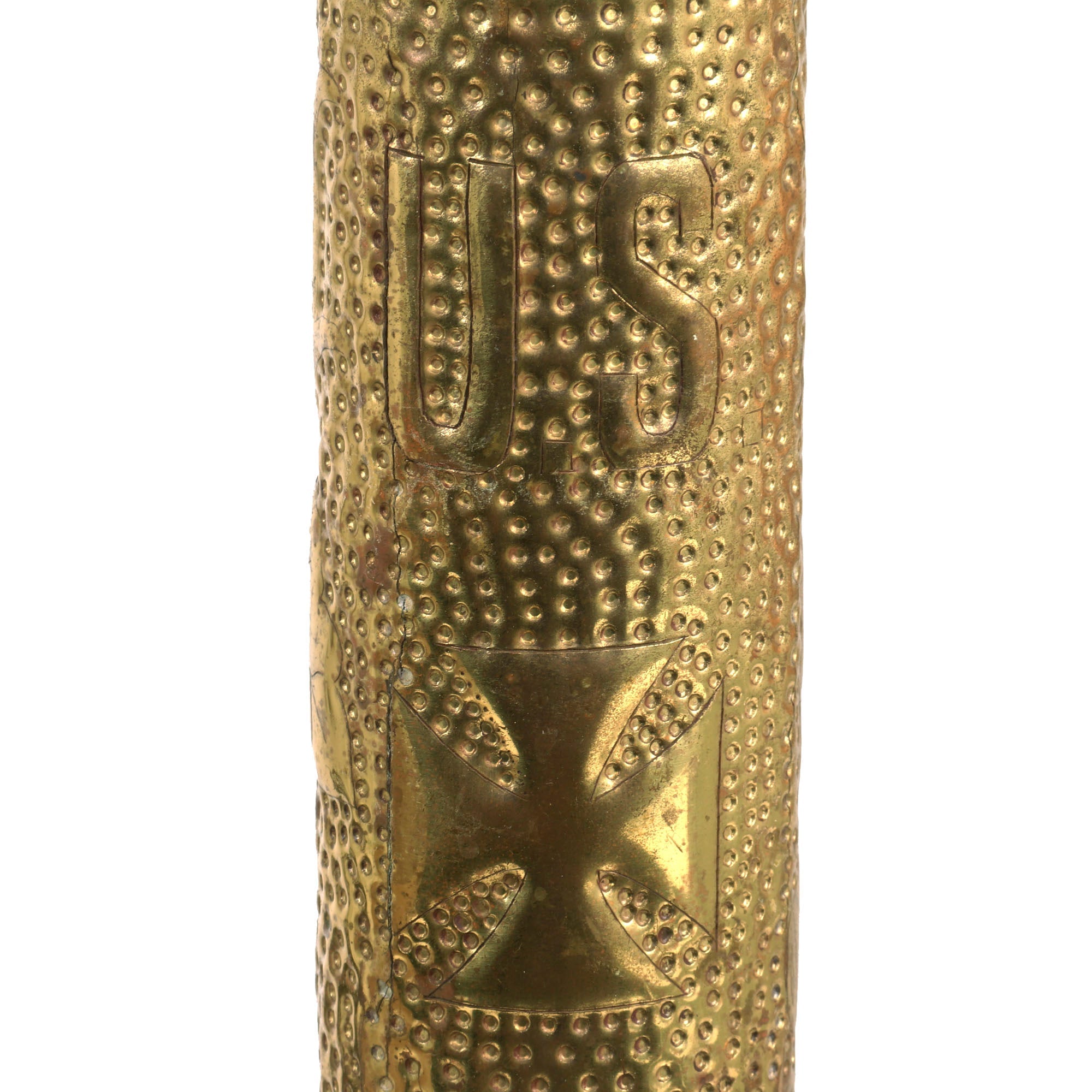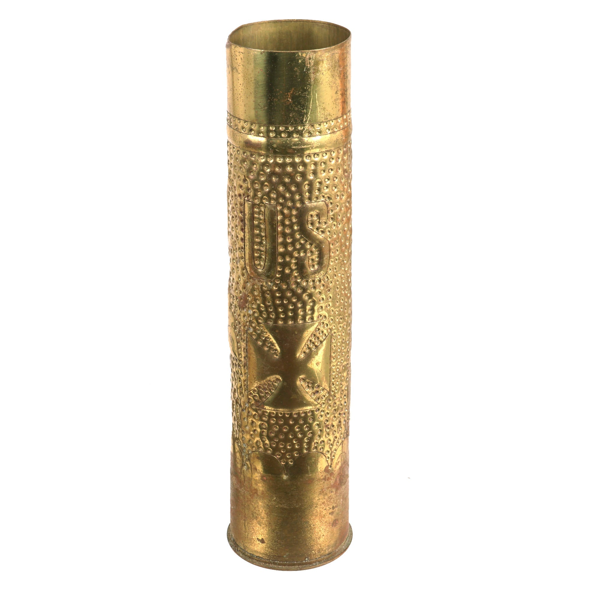 - U.S. WWI 75mm Shell casing decorated with what looks to be ivy or possibly an oak branch. One side has a clear U S marking over a cross pattée representing the German Iron Cross. There is a lot of hammer work with probably a punch over much of the exterior. The base is marked with 75 M/M G and lot numbers, but there is no clear date we can see. We assume this was intended as some type of vase, and is approximately 13 3/4" tall.
