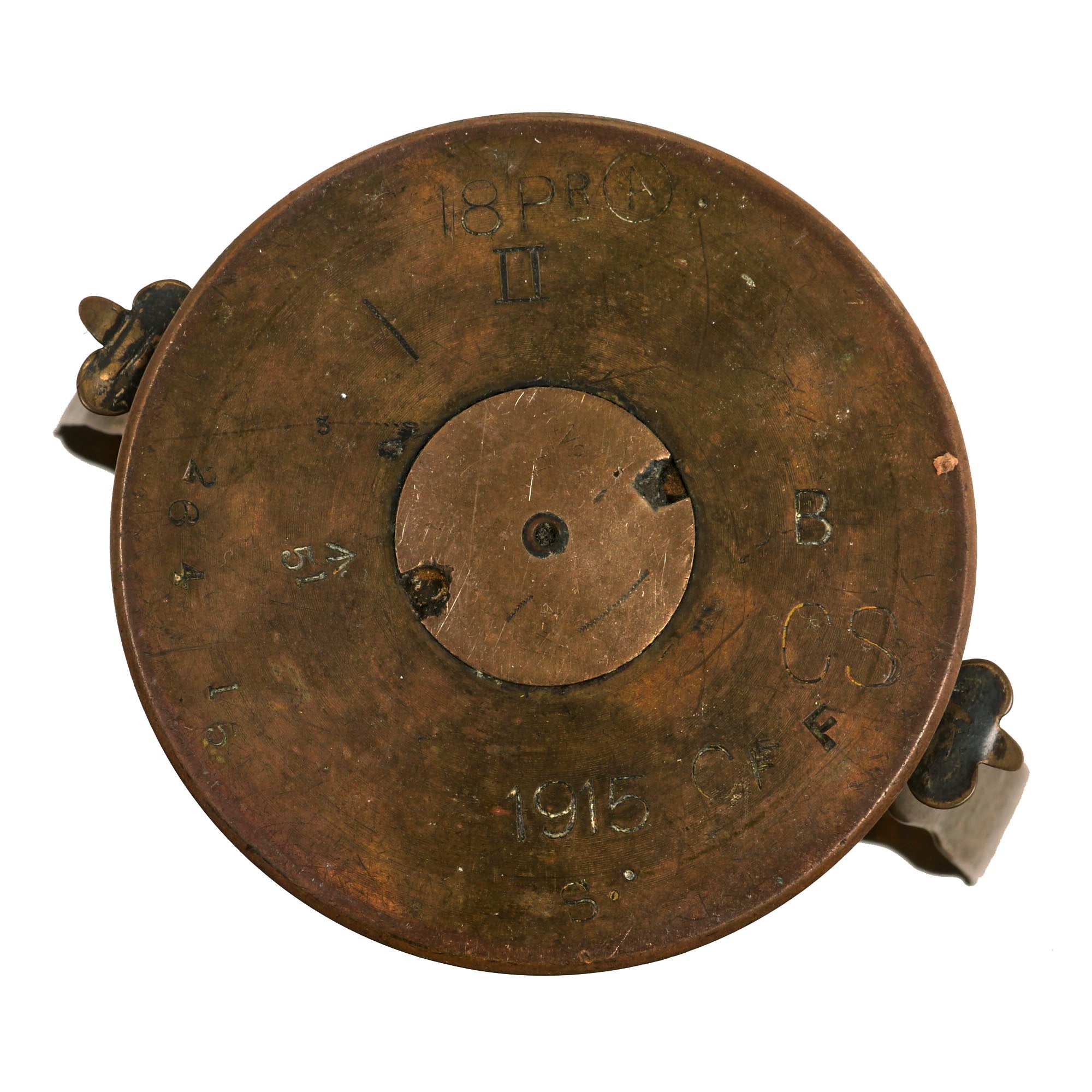- British WWI QF 18-pounder Shell casing, which has been turned into a two handled vase. The top of the shell has been cut down and then areas cut out to give a lovely perforated design. The handles are sheet steel, probably made from the top of the shell. The bottom is marked 18 PR / II, and has a clear 1915 date. There are also various proof marks visible. Measures approximately 8 3/8" tall.