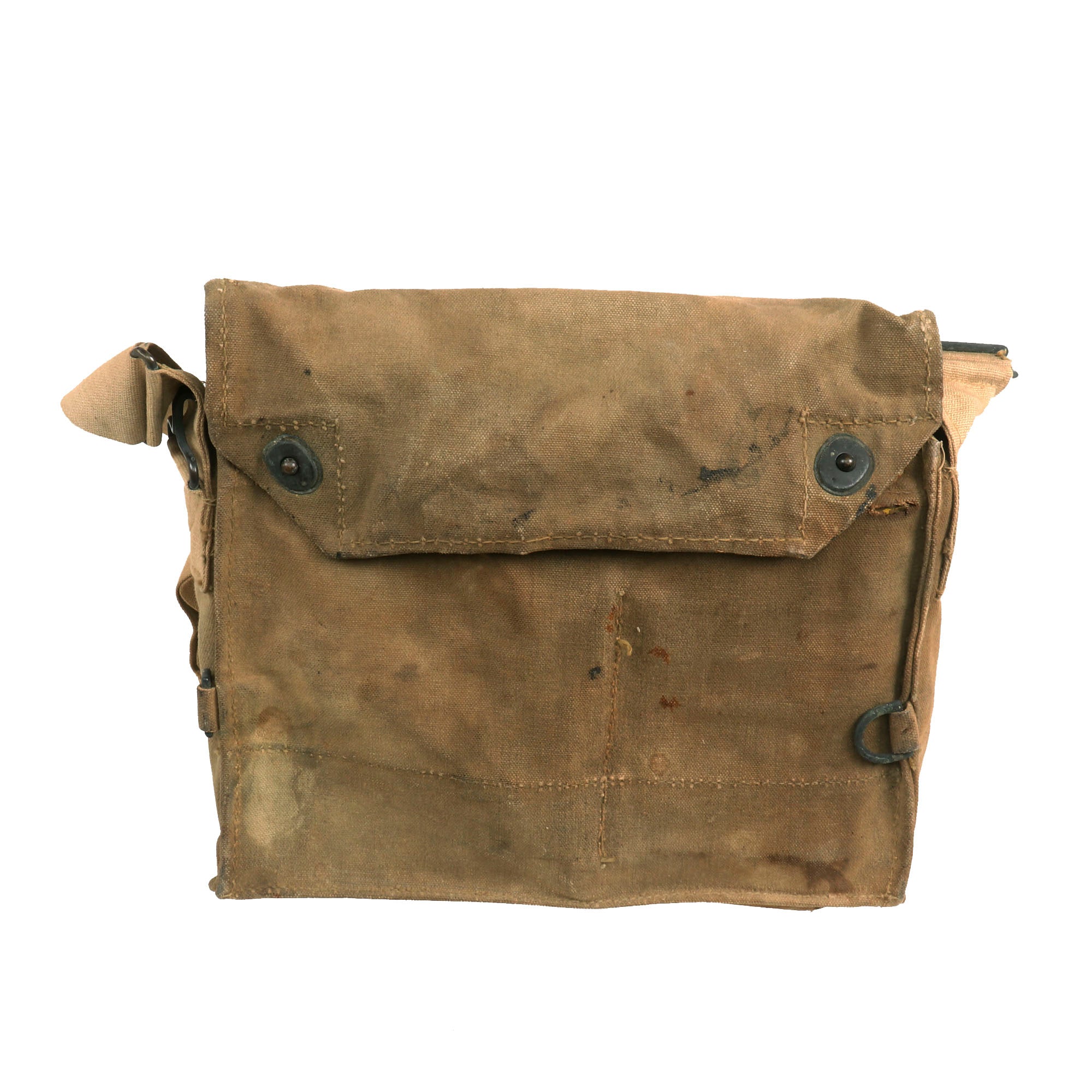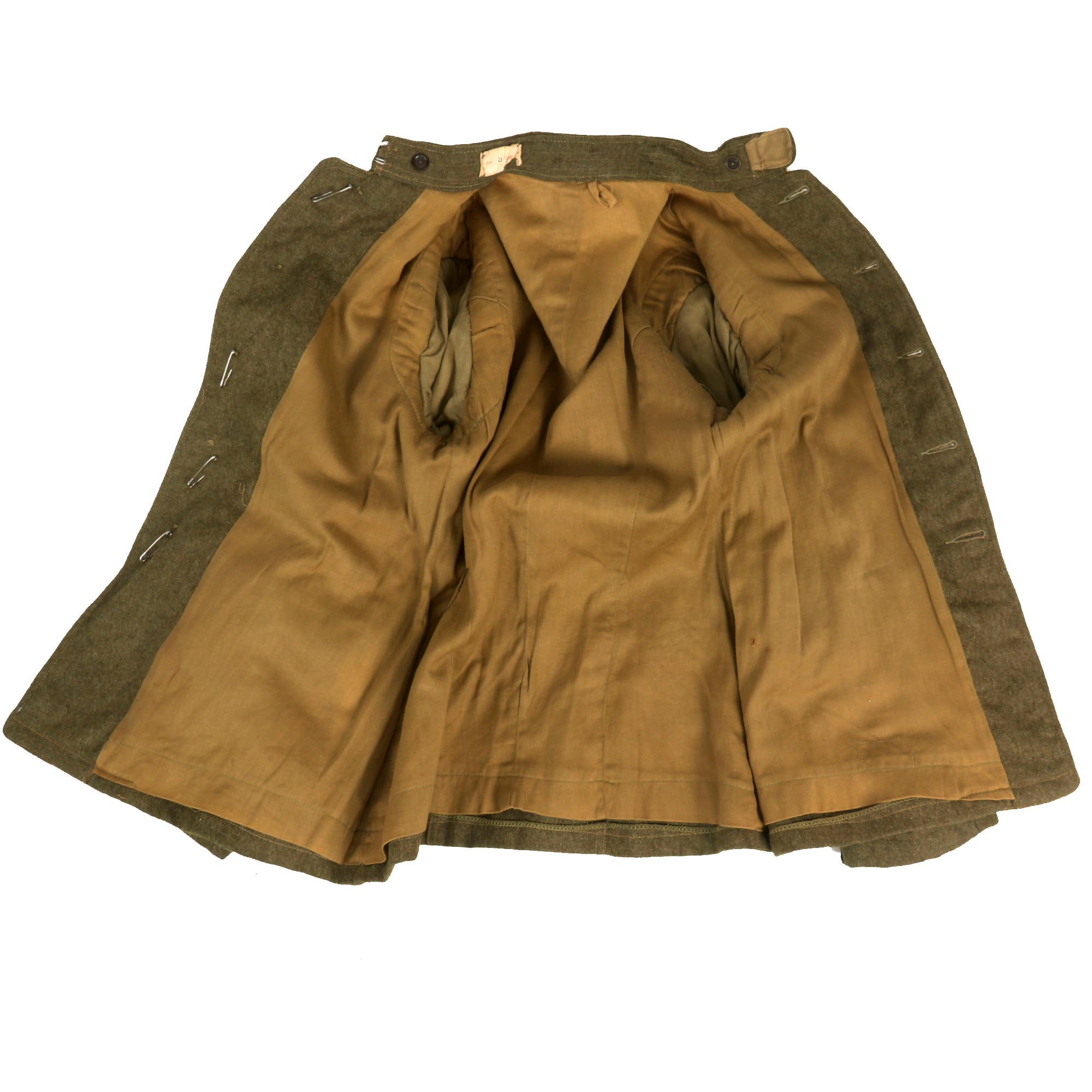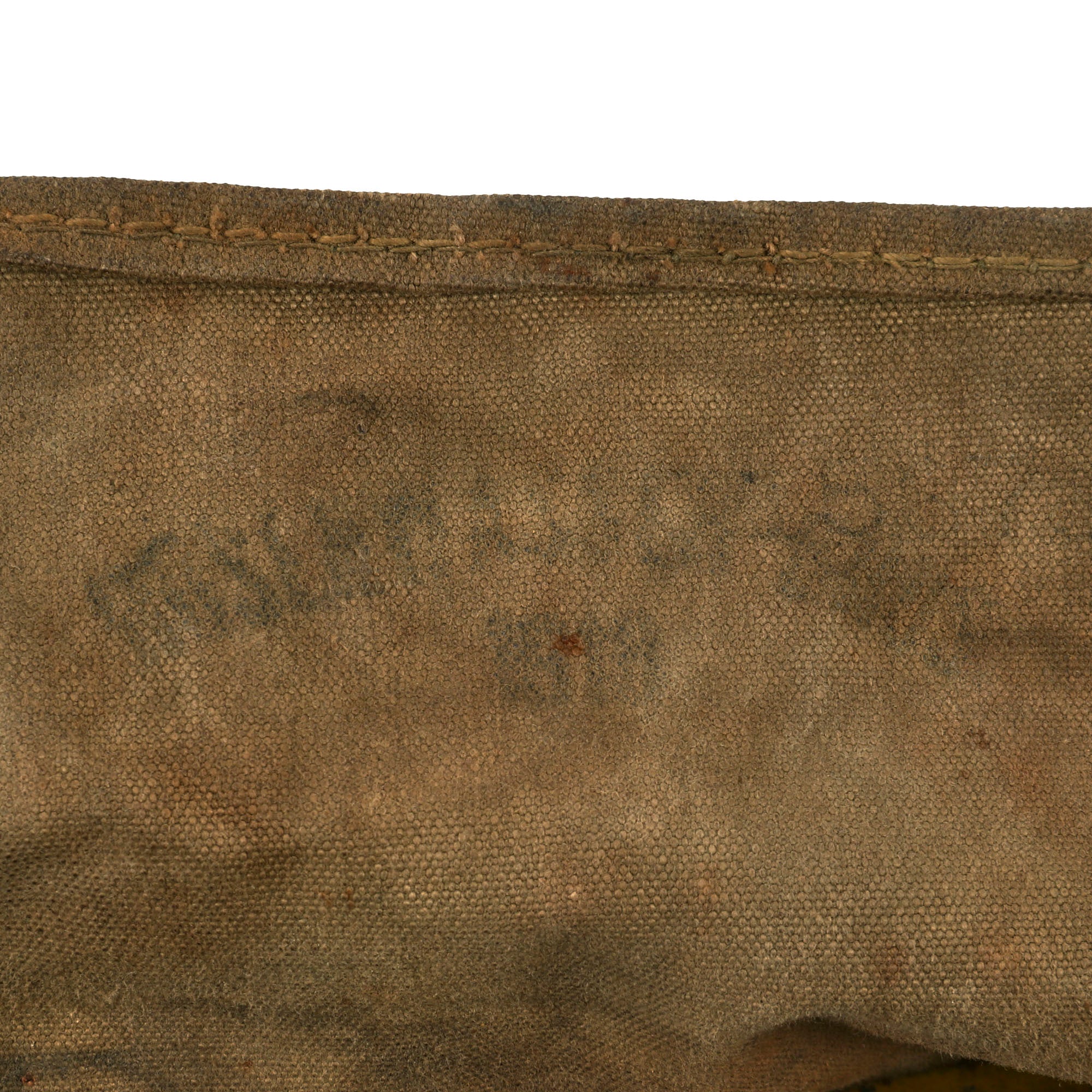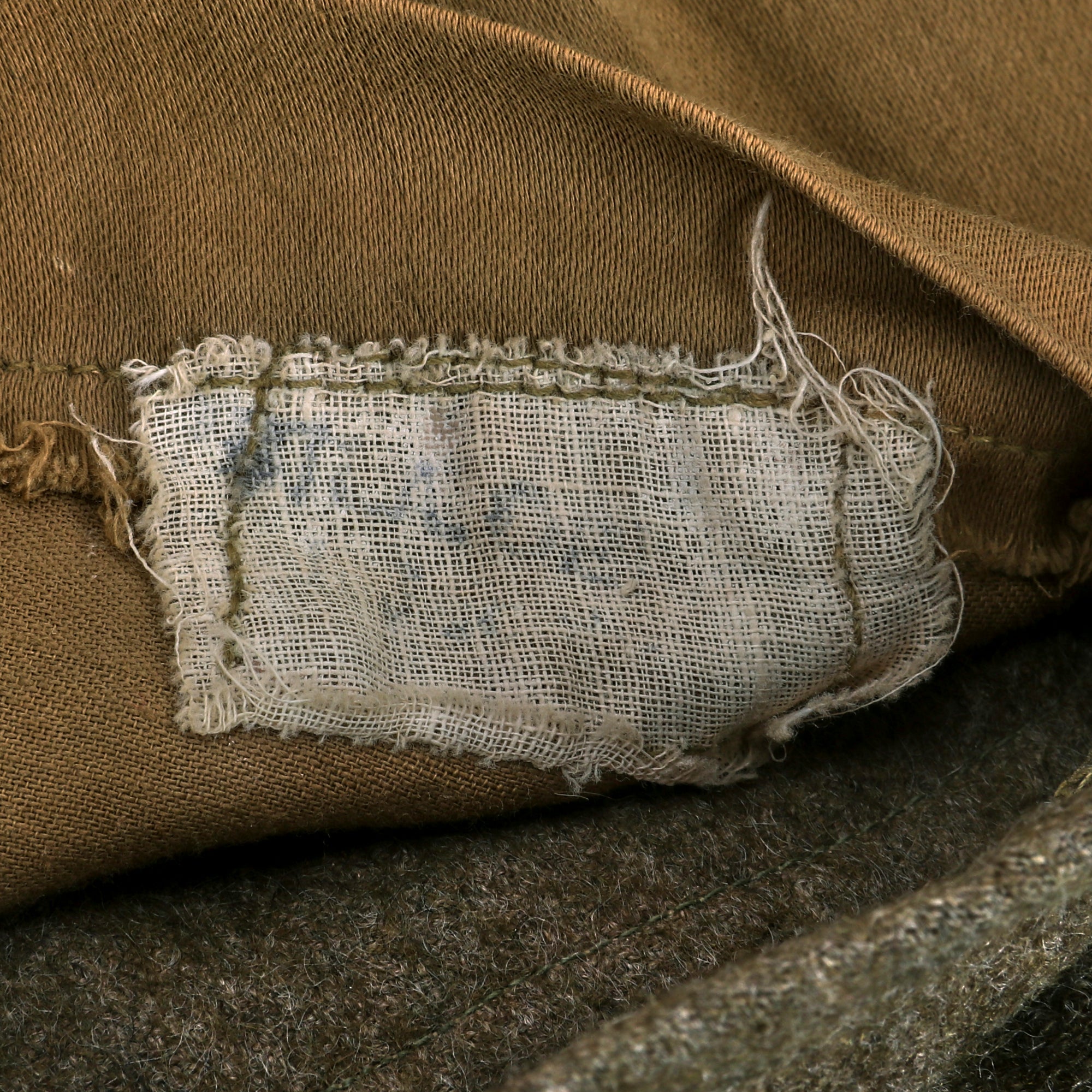 This is a uniform, helmet, and gas mask grouping to E. R. Pearson, a private in the medical department of the division. The uniform jacket has a beautiful hand-embroidered 42nd Division “full rainbow” patch, US & medical collar discs, and two overseas chevrons, denoting 12-15 months overseas during the war, meaning the soldier was likely a replacement for the 42nd Division. The uniform is in good shape and has little mothing. The gas mask is a full example with the mask and canister still remaining. The helmet is a plain example with no painted insignia, with a full liner and partial broken chinstrap. The helmet has the initials “E.R.P.” written on the chinstrap. Also included are his two overseas caps, one lacking an insignia and the other with a US collar disc.