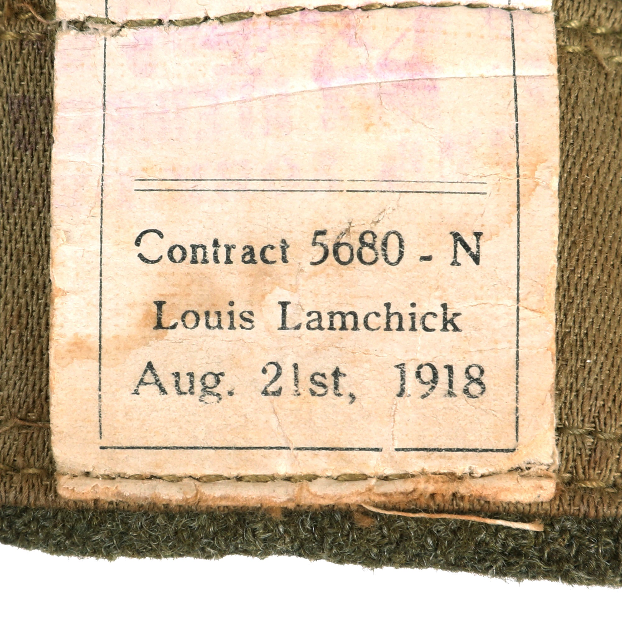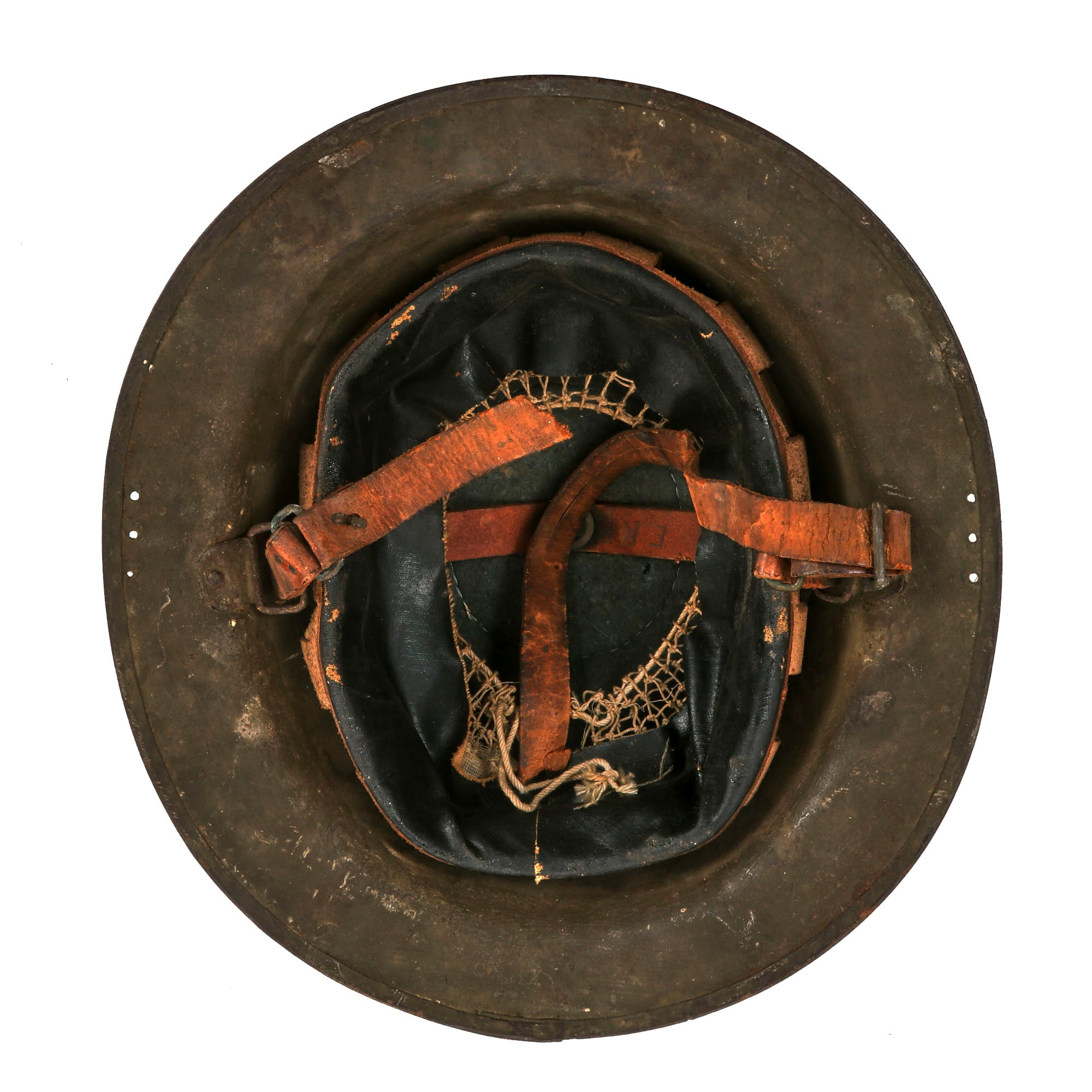 M1917 helmet liners typically show a paper label at the crown and the dome rivet head. The liner is set up as on the British versions, with an oilcloth band and net configuration, attached to a leather strap, riveted to the shell. The chinstrap is leather with a steel buckle.