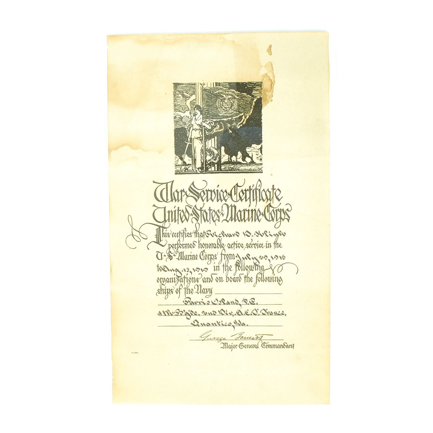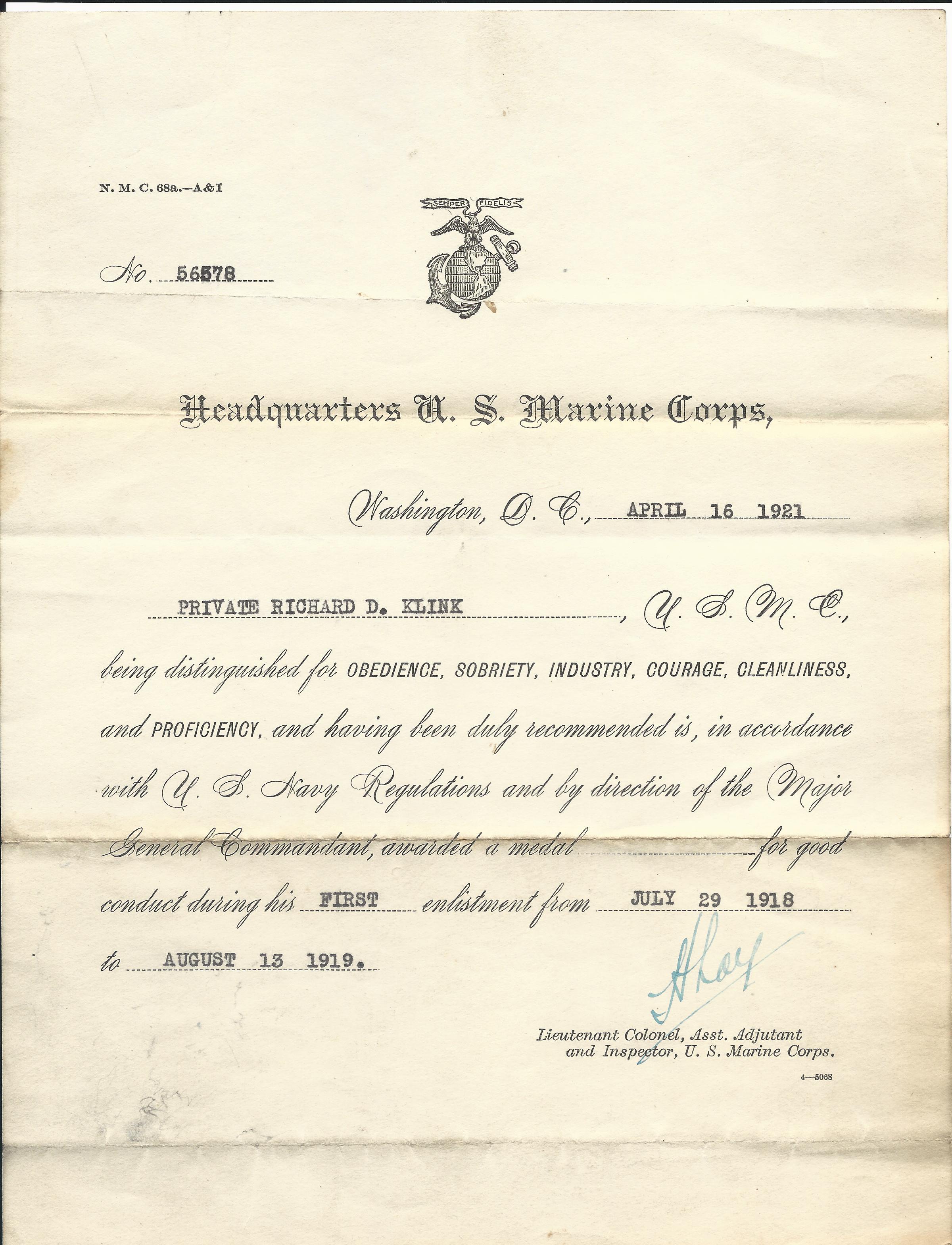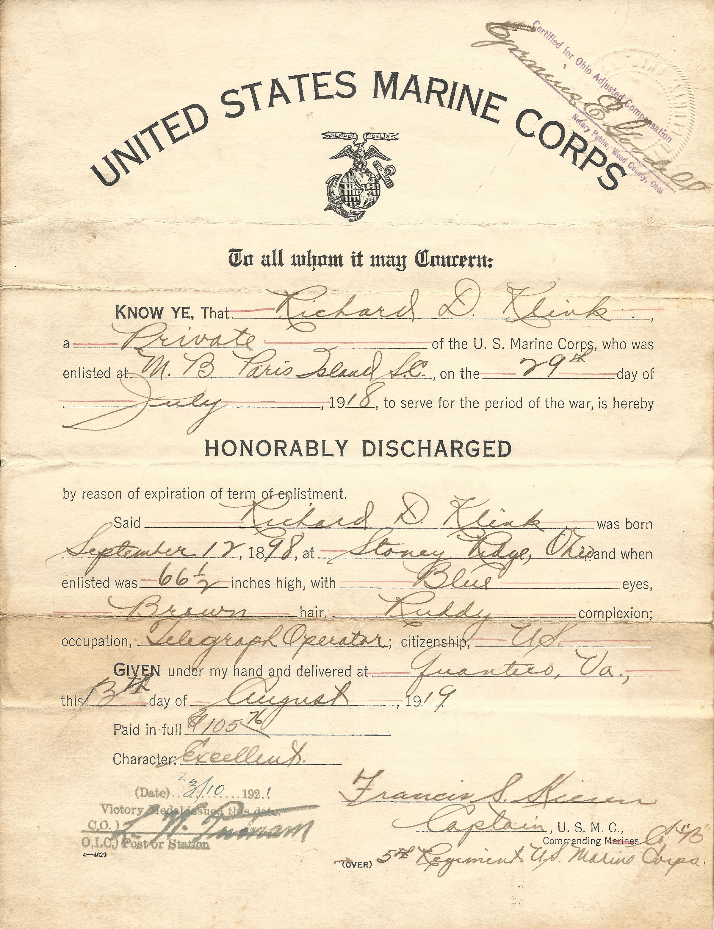 - Original USMC Service Certificate named to Richard Klink which specifies his dates of service and his deployment to France.