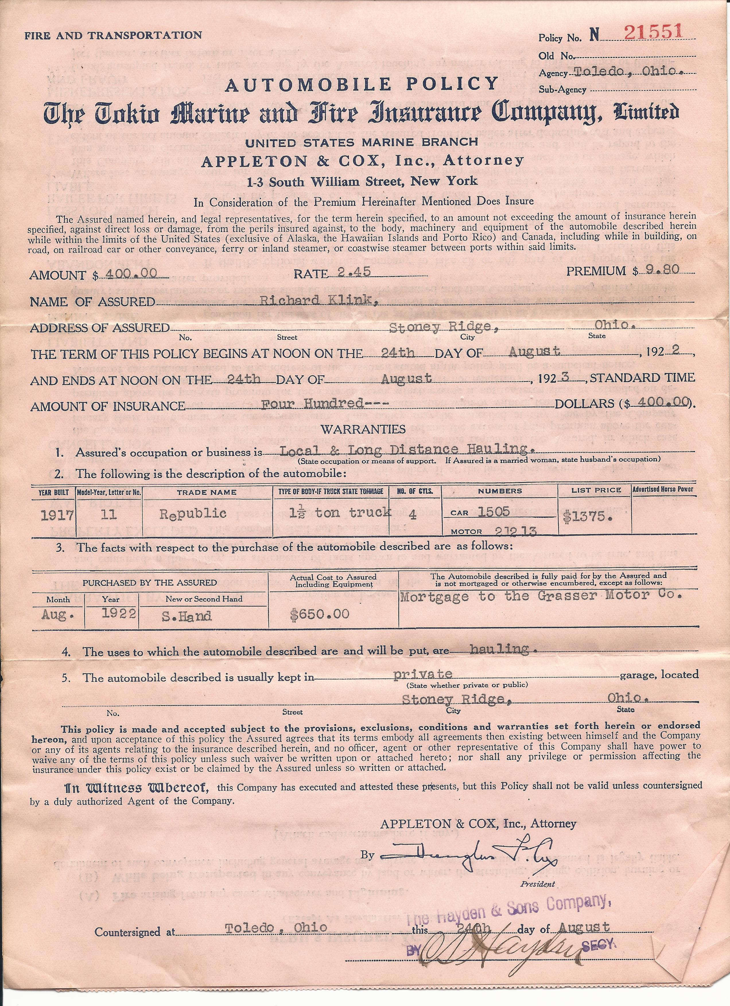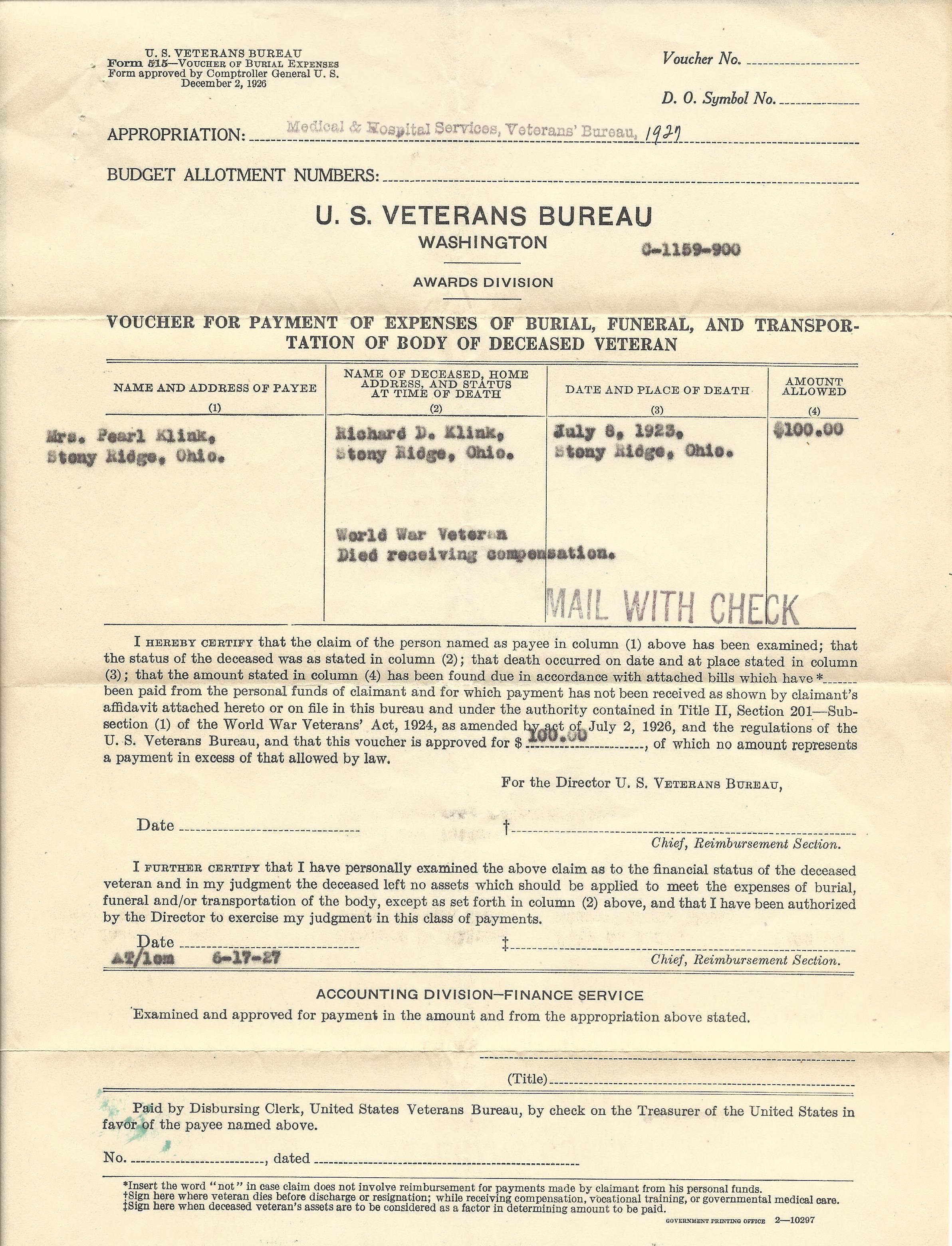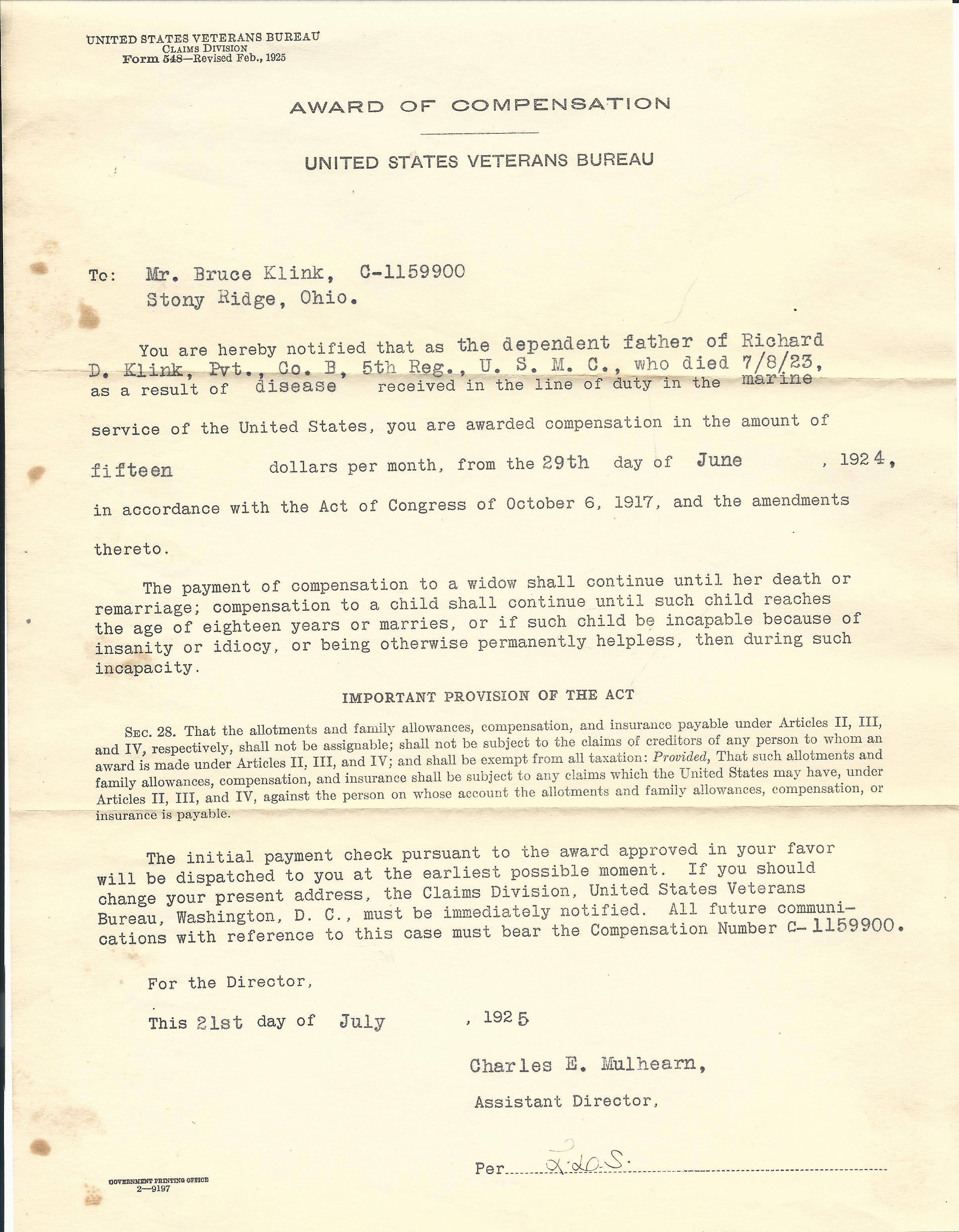 - Original USMC Service Certificate named to Richard Klink which specifies his dates of service and his deployment to France.