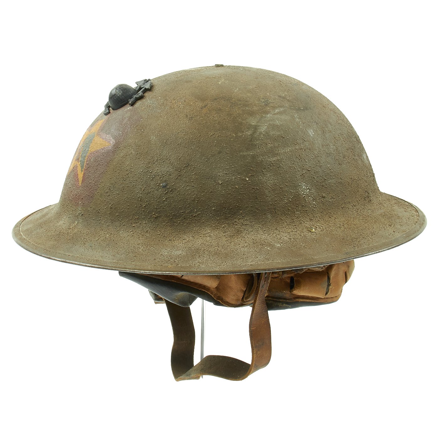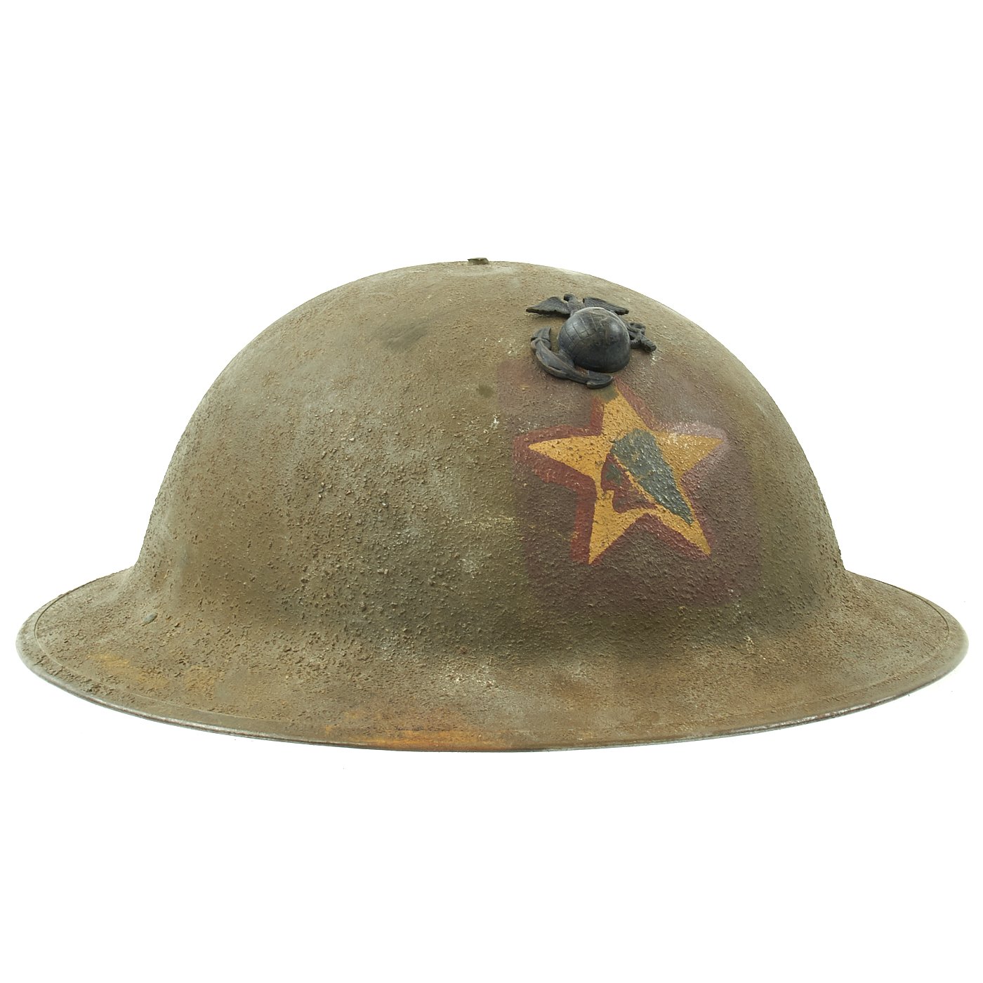 - An extremely rare example of an original U.S. Marine Corps M1917 "Doughboy" helmet, which is marked on the front with a 1st Battalion, 5th Marines, 2nd Infantry Division insignia. All U.S.M.C. WWI helmets are rare, but particularly those bearing specific unit insignia. This very nice example is complete with a liner and complete chinstrap, and still has original period textured paint on the outer shell. More importantly, the front still has a genuine blacked brass WWI USMC EGA Badge over the division insignia!
