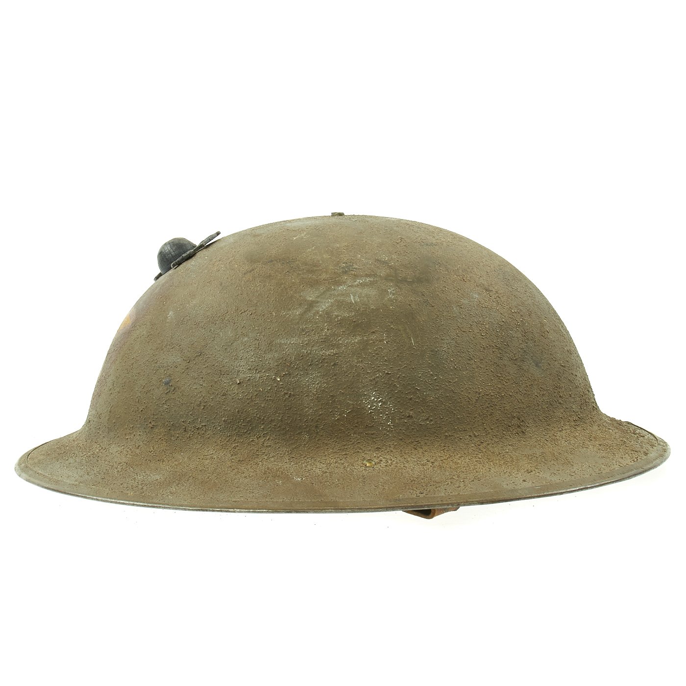 The best feature of this helmet is definitely the original hand painted 1st Battalion 5th Marine Regiment, 2nd Infantry Division - Indianhead Division emblem in the center of the front of the helmet. Marines under this division used specific colors and shapes behind the "Indianhead" to designate which unit they were in, and the "red square" indicates the 1st battalion of the 5th Marine Regiment, part of the 4th Marine Brigade. The Unit Insignia maintains almost all of the original paint and remains bold and easy to see, though it is a bit faded due to dirt, which we have left to preserve the authenticity.