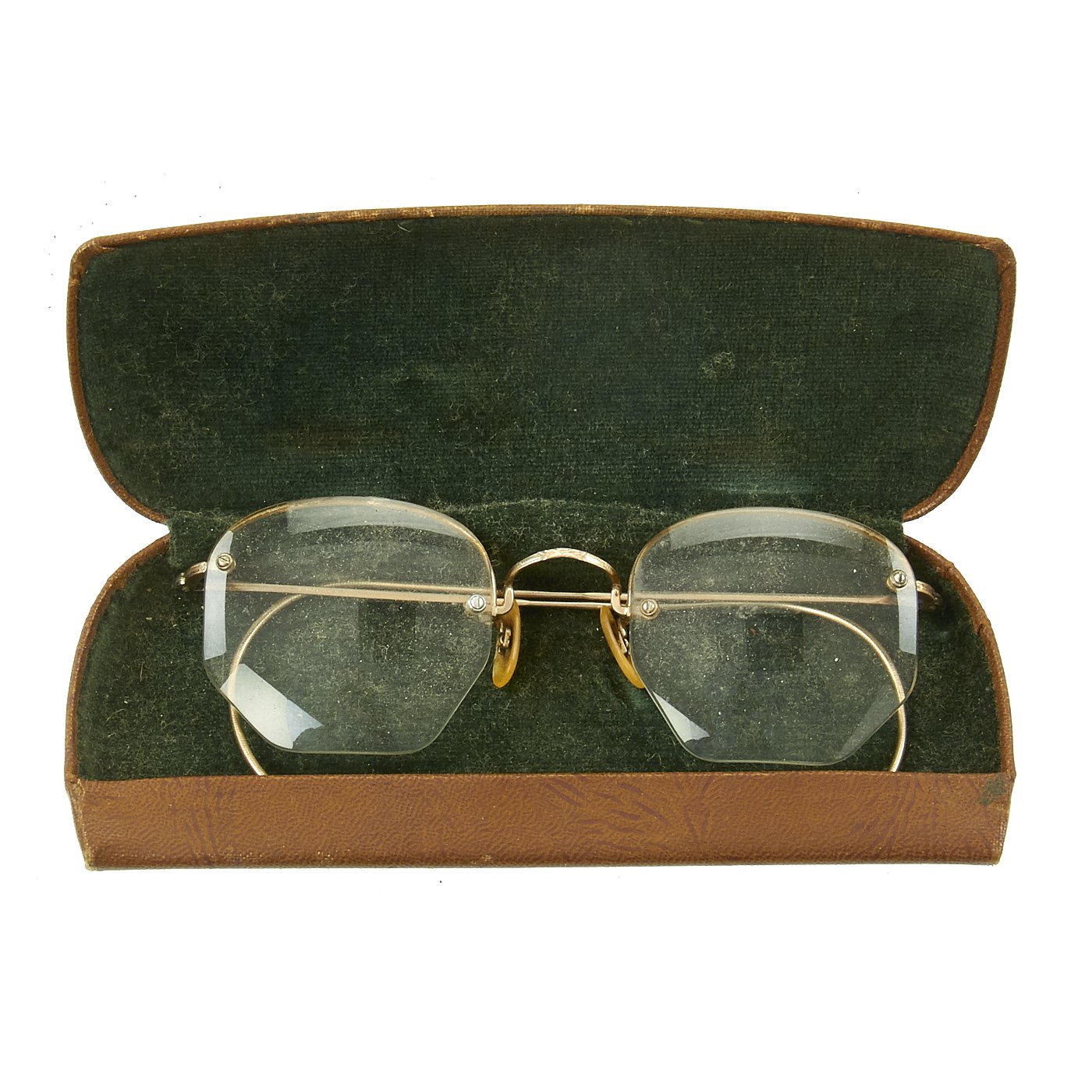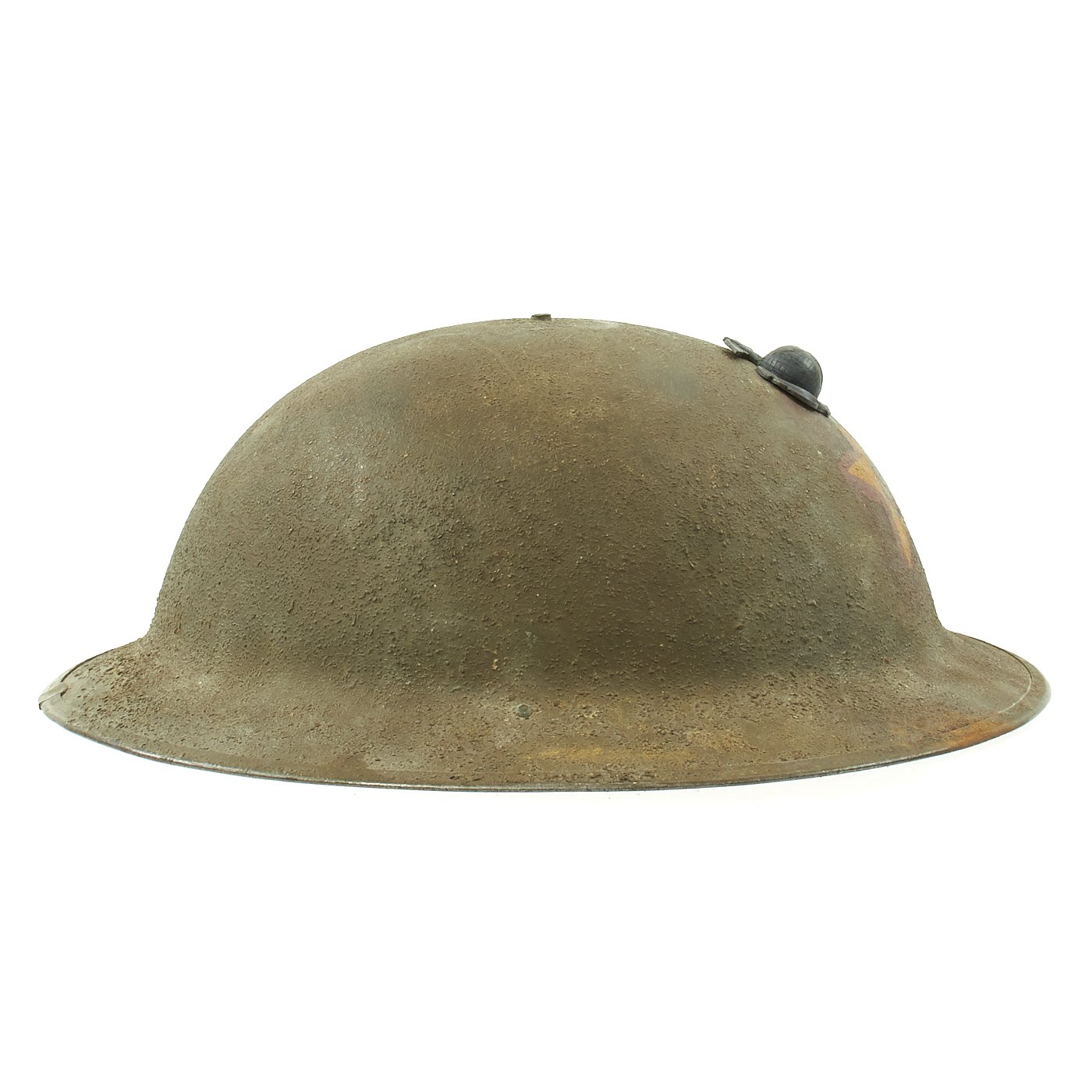 The outer shell still has 90% or more of the original textured finish, with the interior finish even better, close to 100%. There is some dirt and rust on the shell, which we left in place to preserve the patina. The liner is intact, and still has an intact felt top pad, as well as the original label on the crown. The oil cloth is in great shape, as is the netting, though the helmet is over 100 years old, so there is definitely some deterioration.