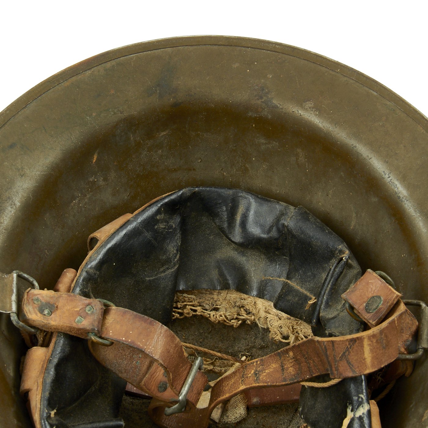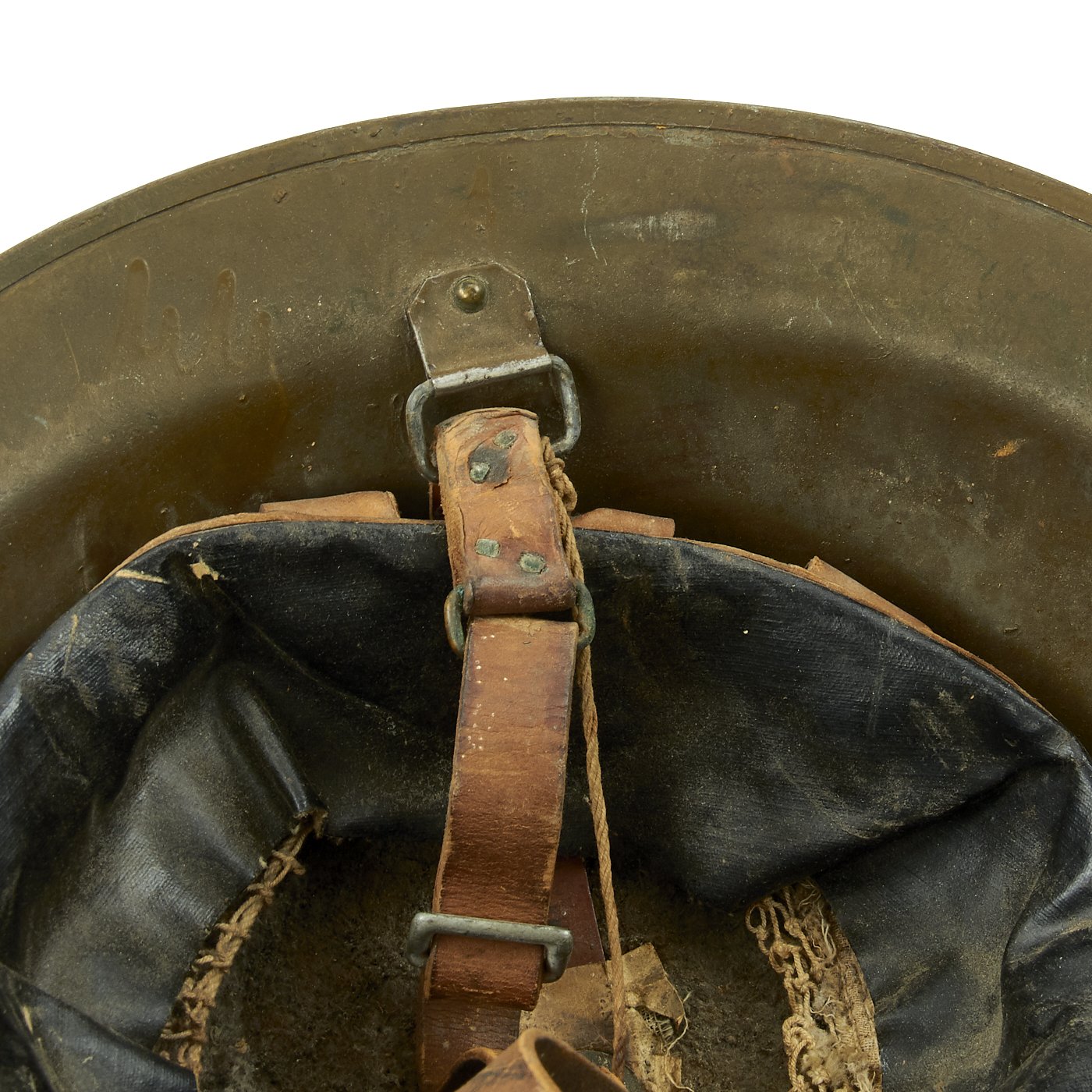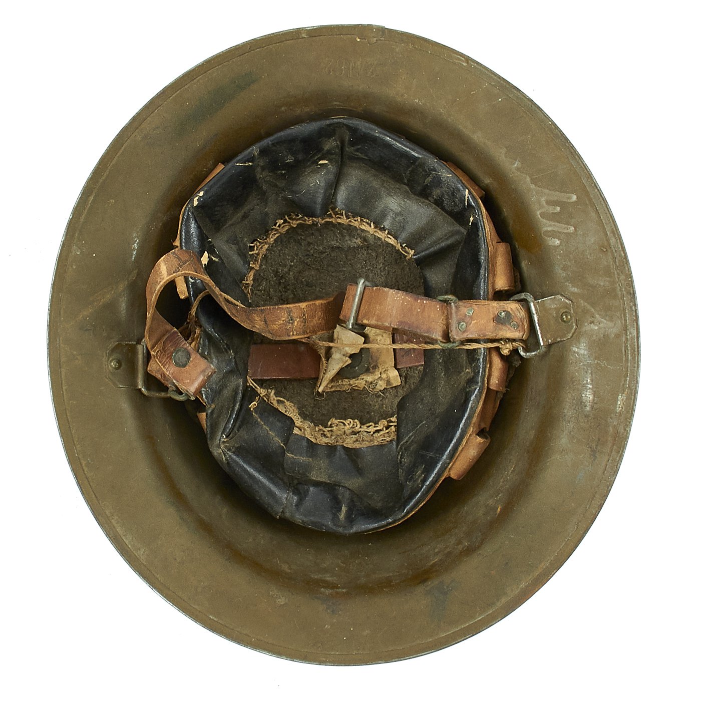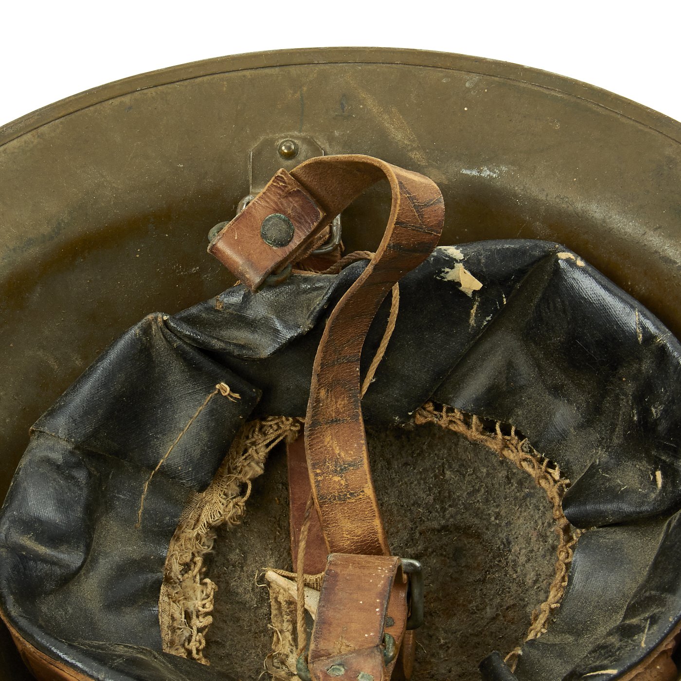 M1917 helmet liners typically show a paper label at the crown and the dome rivet head. The liner is set up as on the British versions, with an oilcloth band and net configuration, attached to a leather strap, riveted to the shell. The chinstrap is leather with steel buckle.