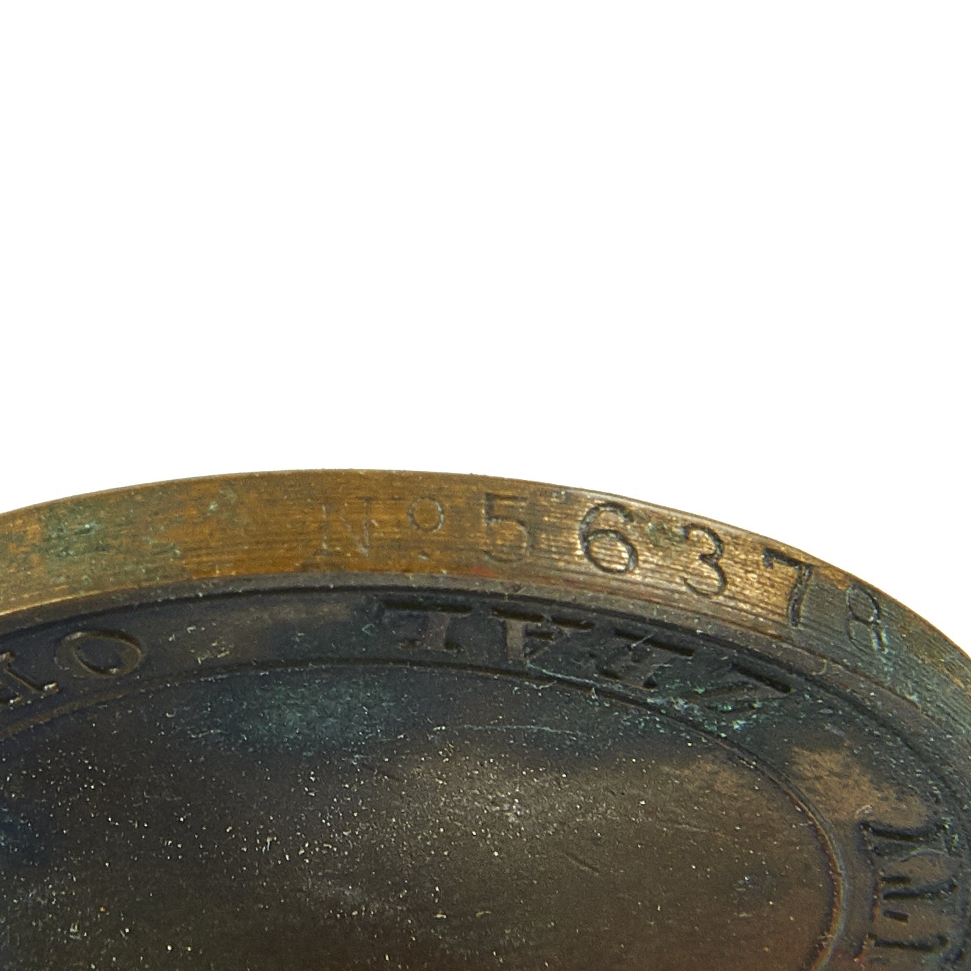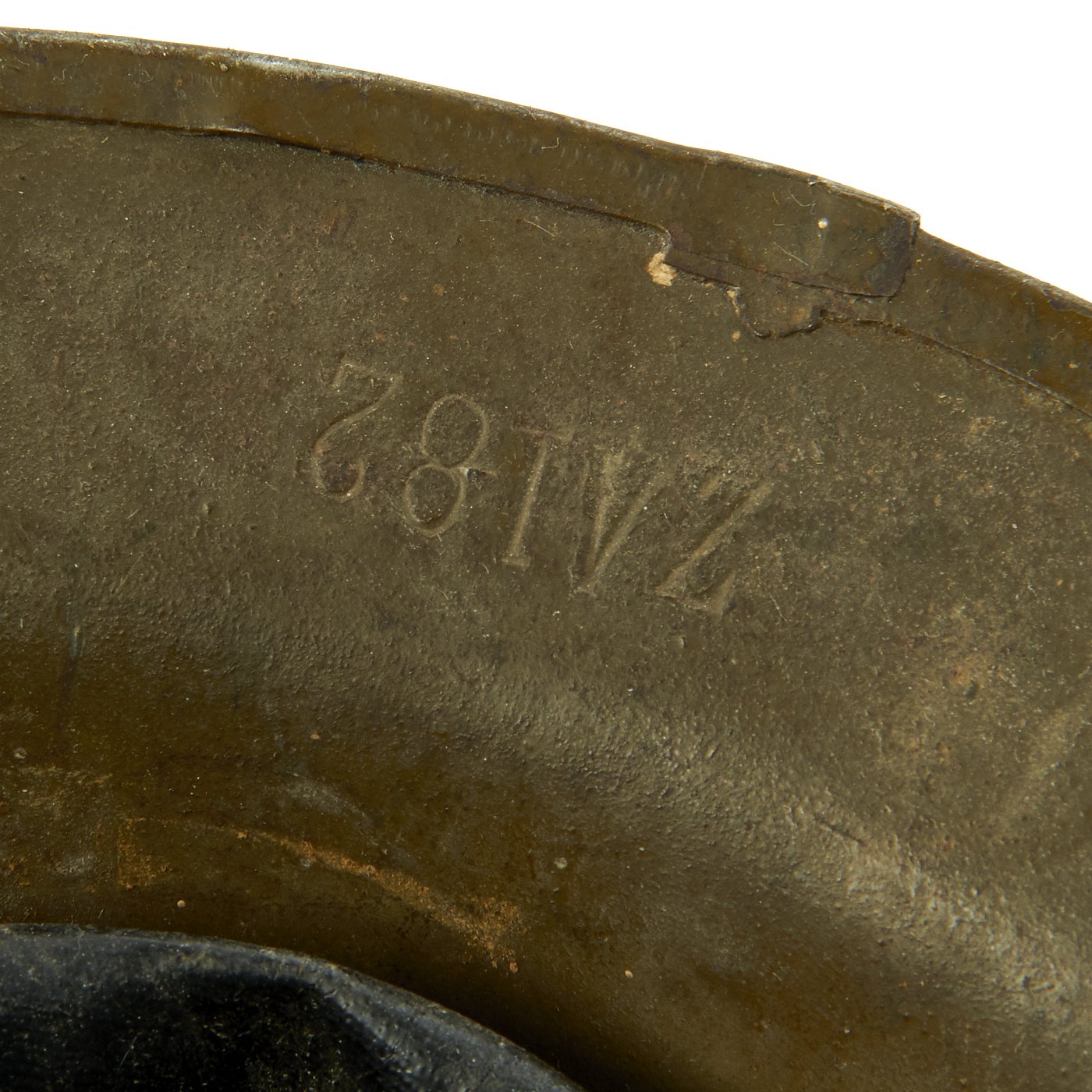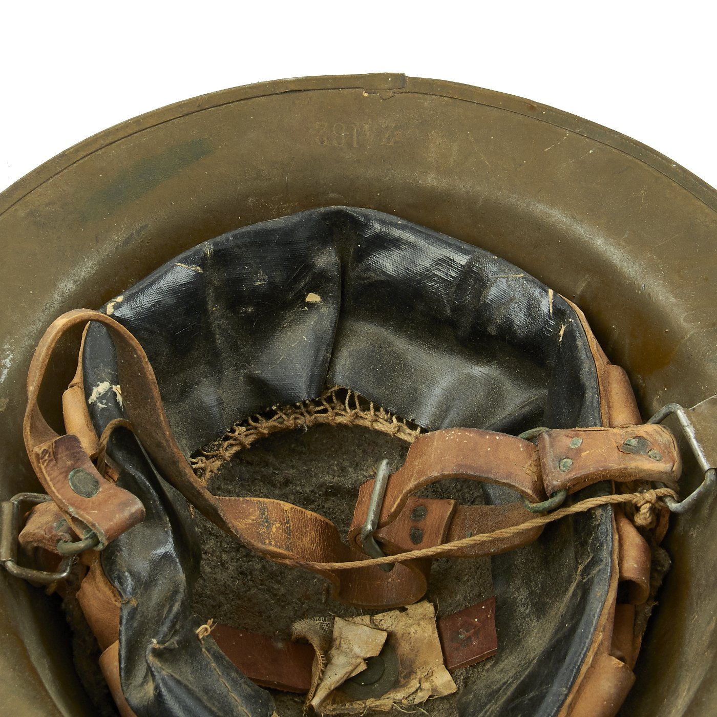 The shell is maker marked with a stamping on the underside of the rim that reads ZA 182. This maker marking indicates that this is a U.S. produced shell, which is further indicated by the solid rivets used to retain the chin strap bales.