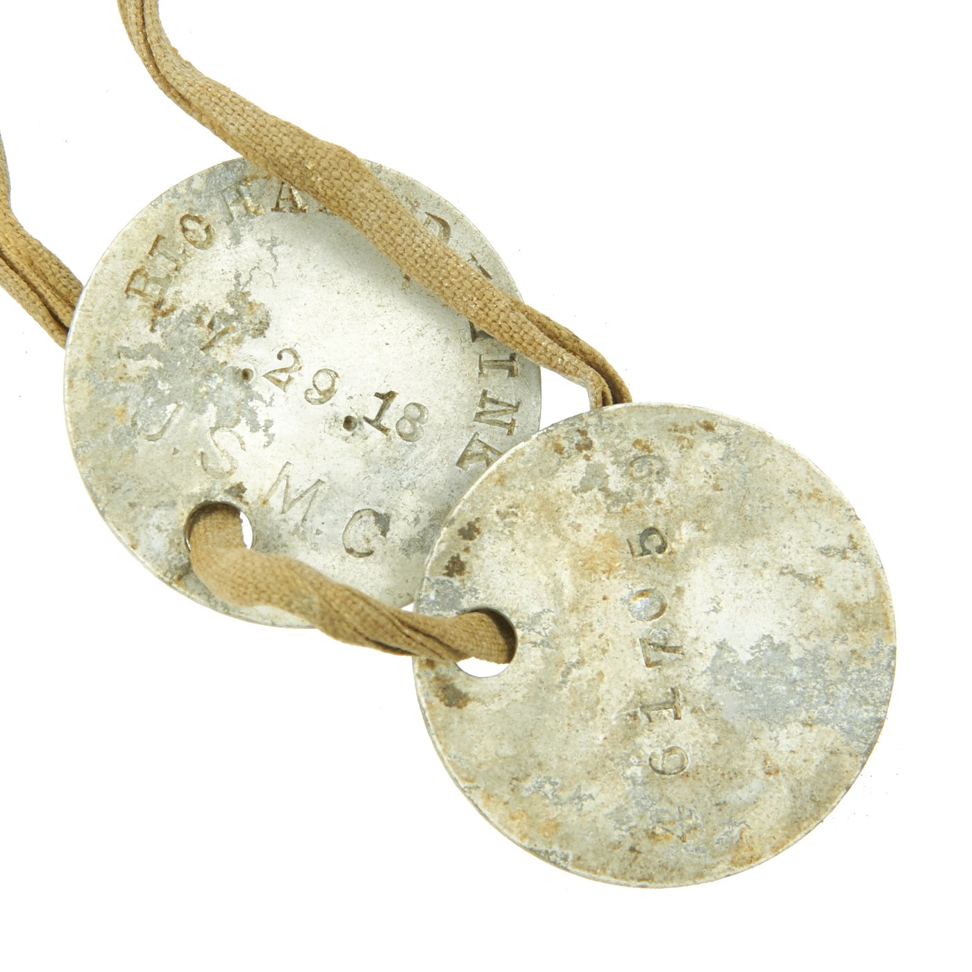 - Original dog tags that read; RICHARD D. KLINK U.S.M.C. 7.28.18 on the front and 61705 on the reverse.