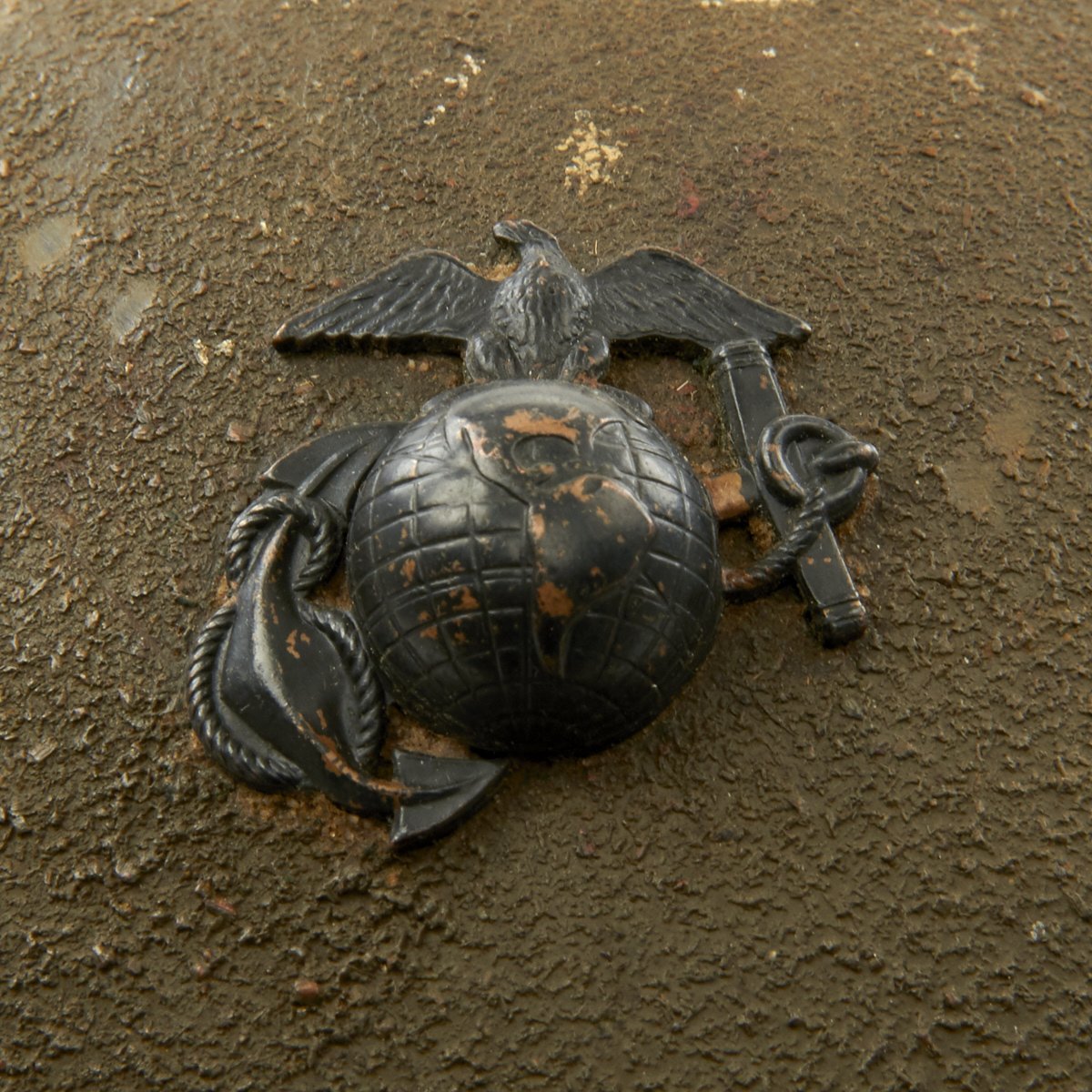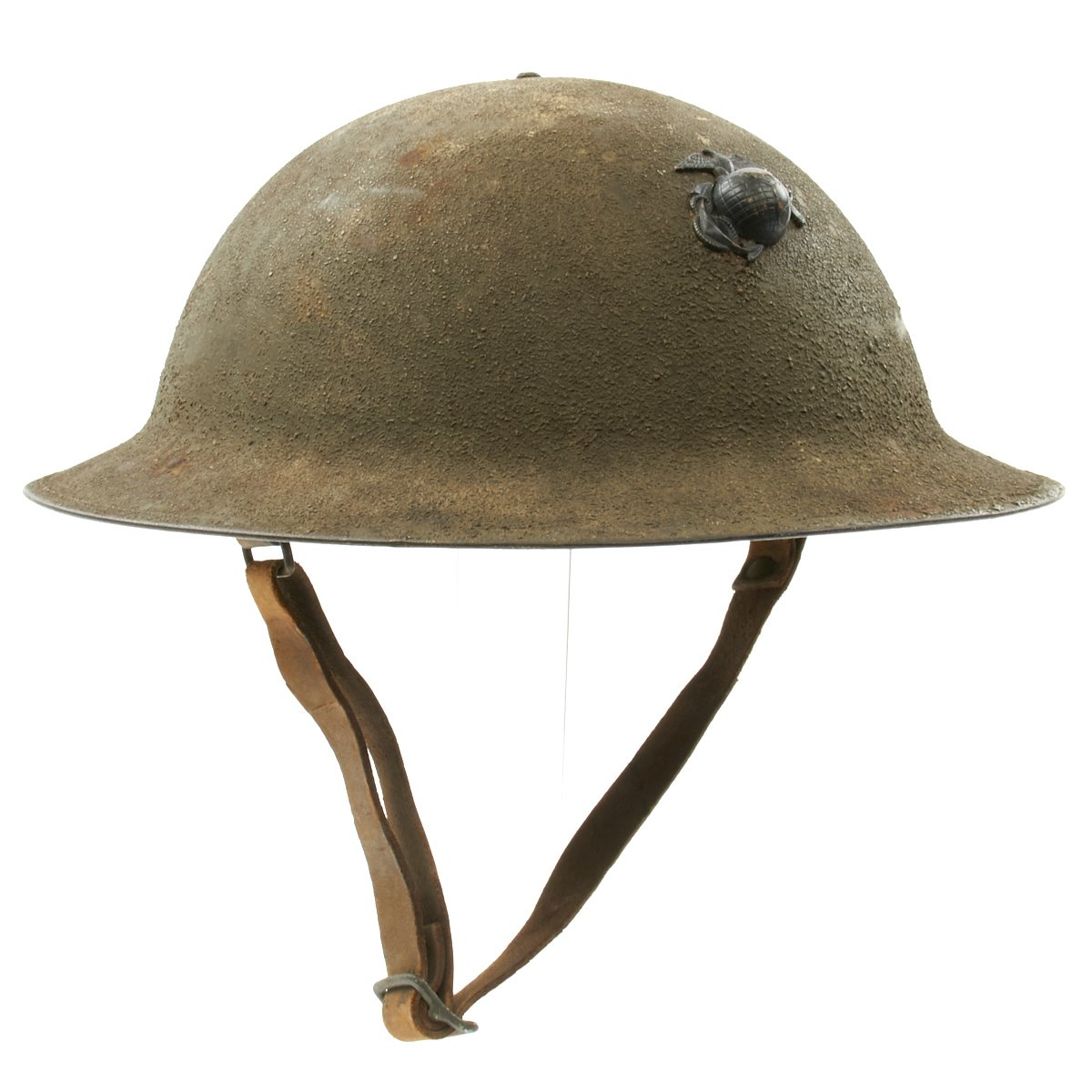 Original Item: Only One Available. This is only the second example of an original U.S. Marine Corps M1917 "Doughboy" helmet that we had had, as they are very hard to come by. This very nice example is complete with a complete liner and chinstrap, and still has original period col textured paint on the outer shell. More importantly, the front still has a genuine WWI USMC EGA Badge!