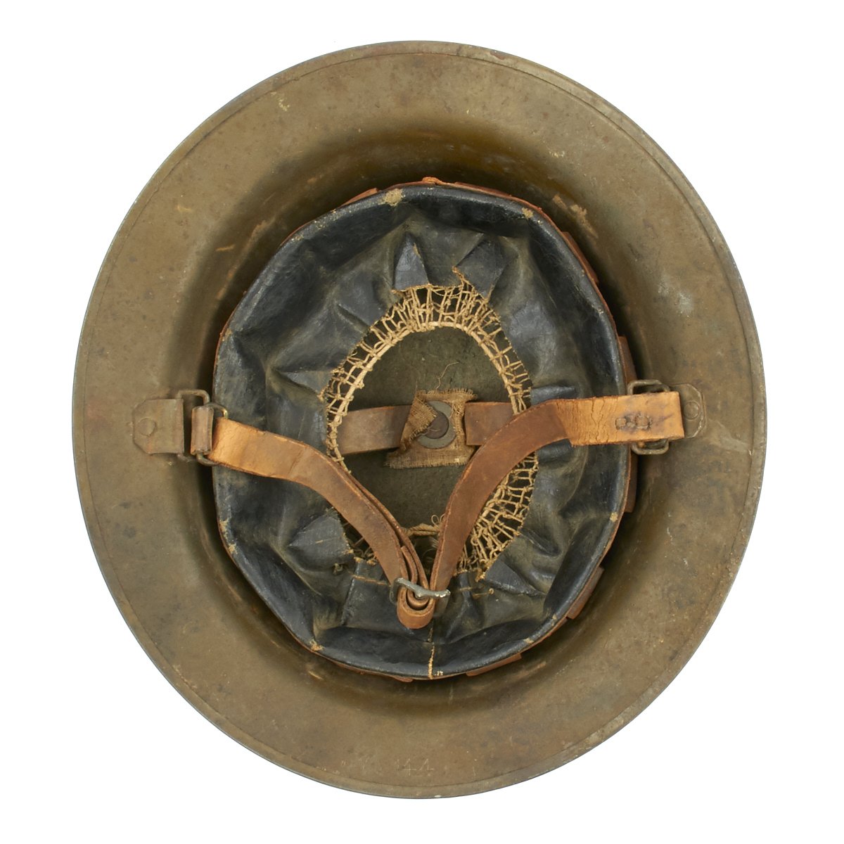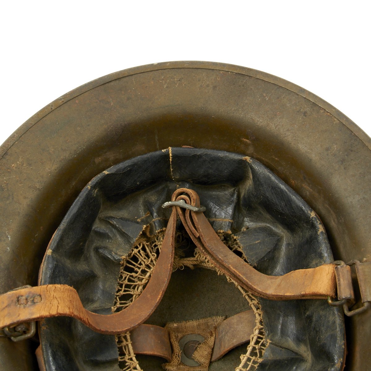 M1917 helmet liners typically show a paper label at the crown and the dome rivet head. The liner is set up as on the British versions, with an oilcloth band and net configuration, attached to a leather strap, riveted to the shell. The chinstrap is leather with steel buckle.