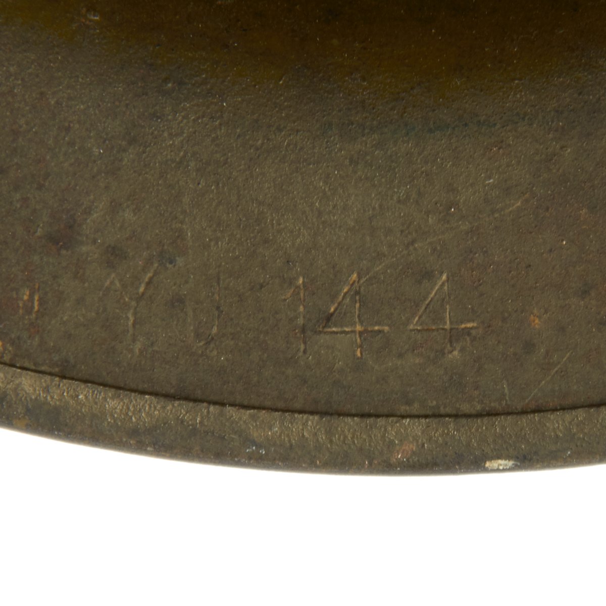 The shell is maker marked with a stamping on the underside of the rim that reads YJ 144. This maker marking indicates that this is a U.S. produced shell, which is further indicated by the solid rivets used to retain the chin strap bales.