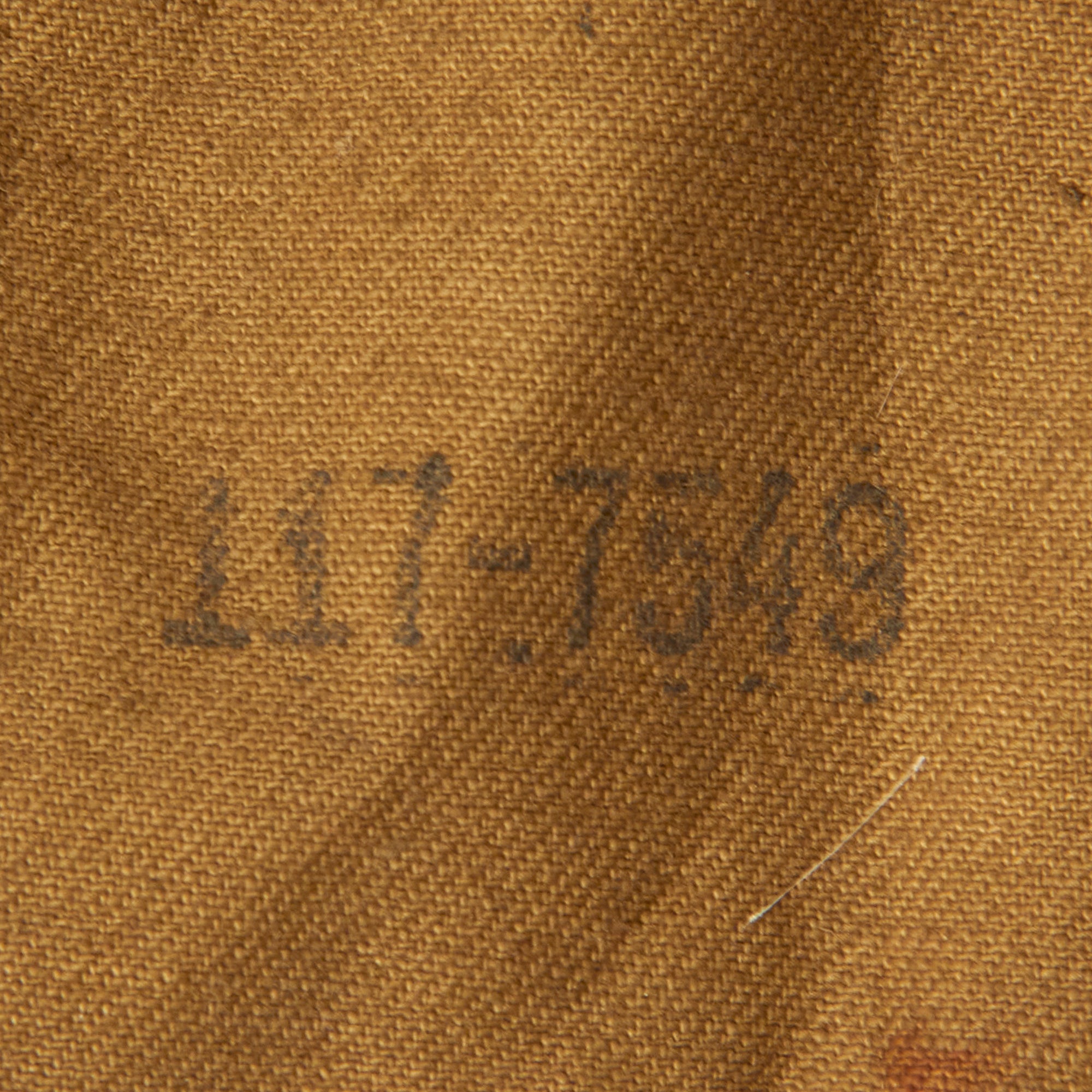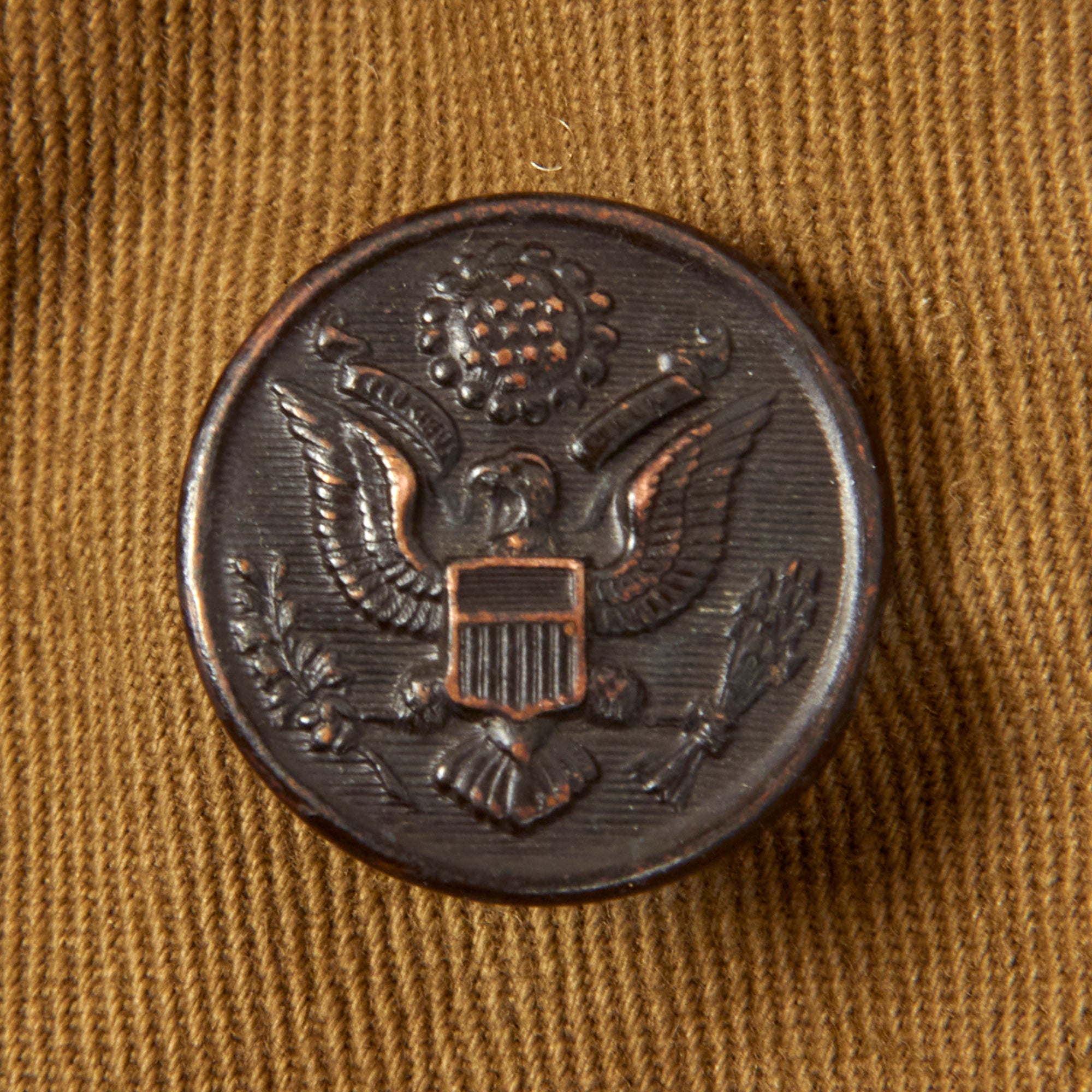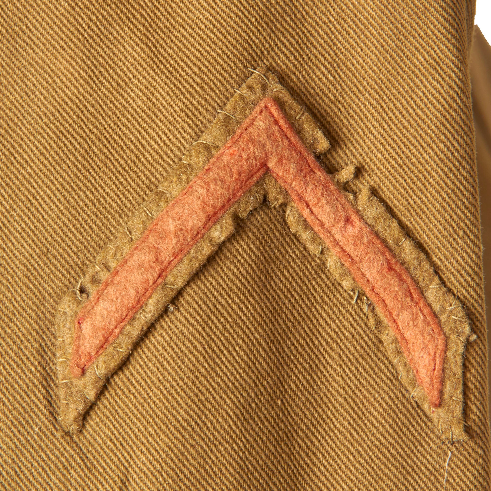 The Tunic is of the M-1916 Cotton variety, with two overseas chevrons in bullion, discharge stripe, velvet three-piece North Russian Expeditionary Force “Walking Polar Bear” Shoulder Sleeve Insignia. A U.S. National Army Collar insignia is on the right side of the collar, and a “D” Company Engineer insignia is on the left. The tunic still retains the original paper label on the collar. The tunic displays very well despite one button being missing and a 2” tear on the right arm