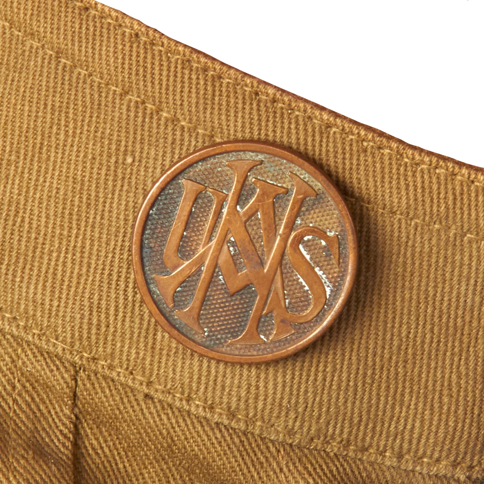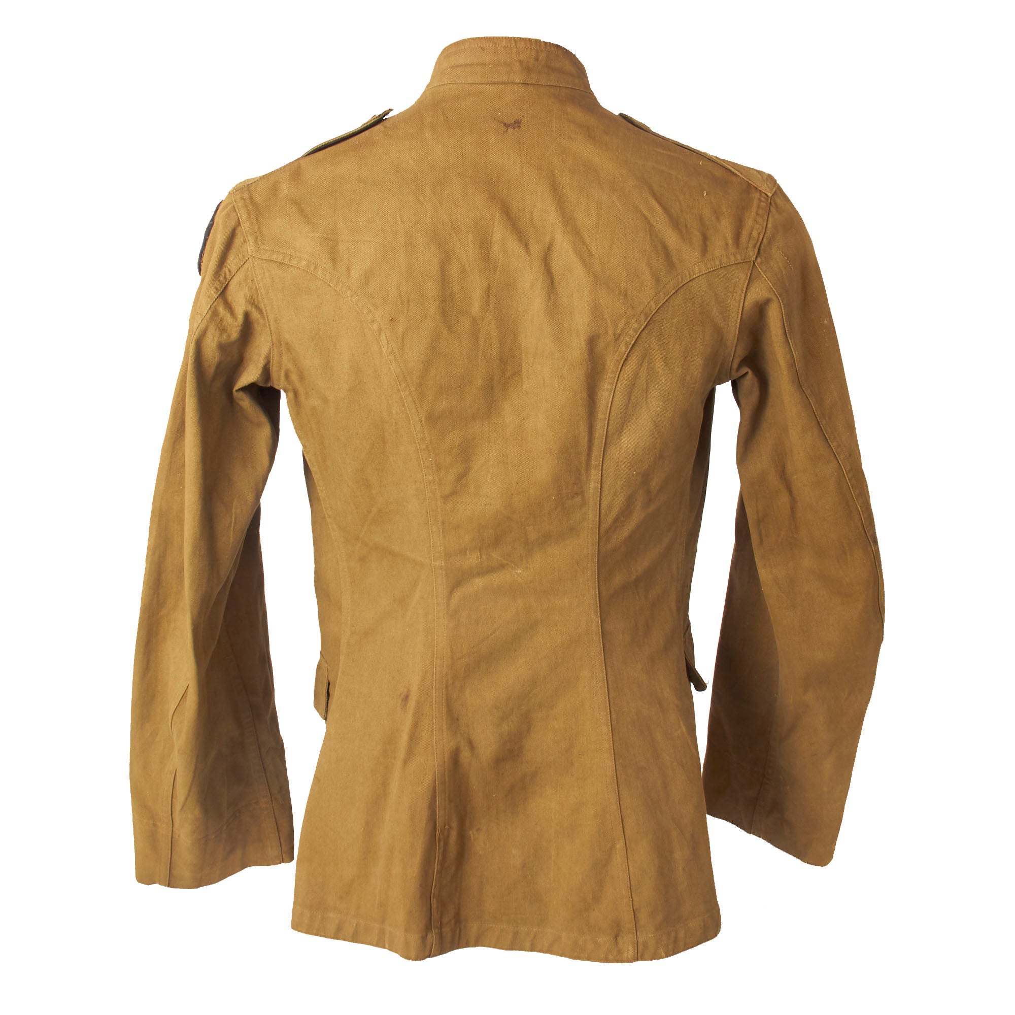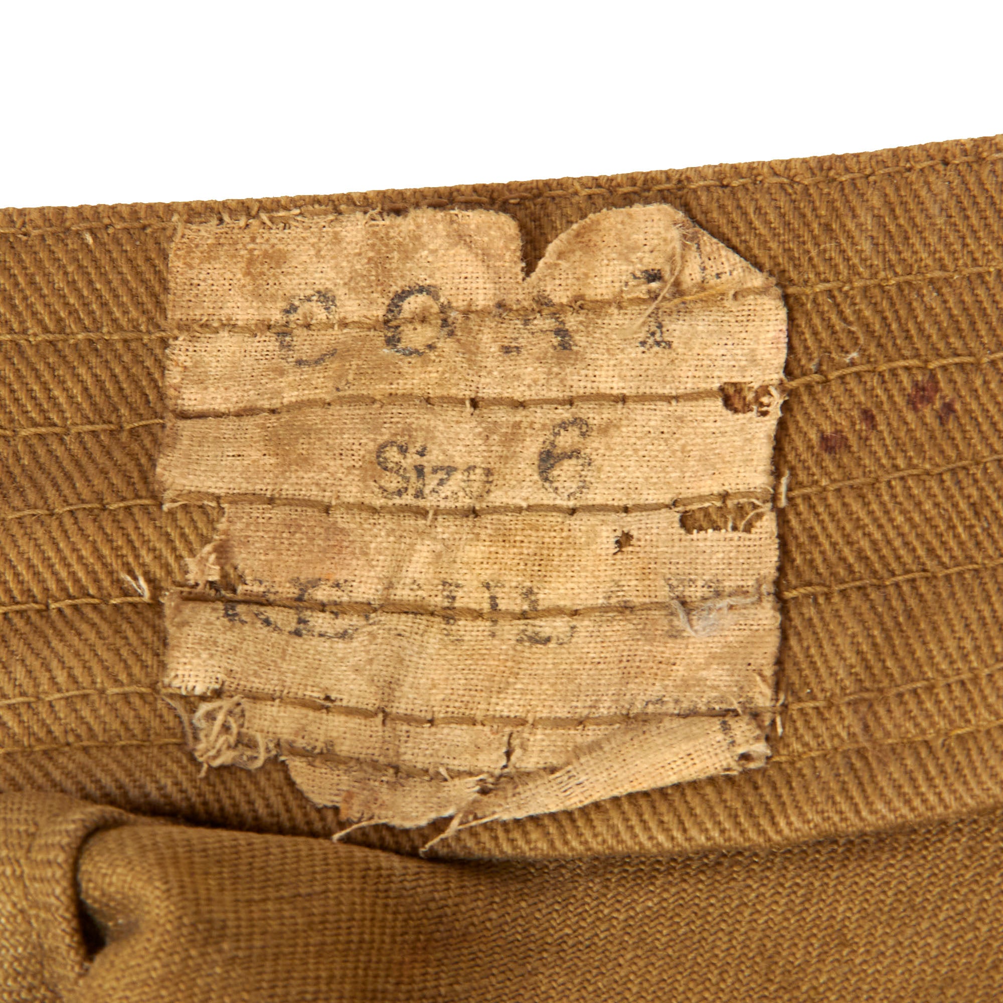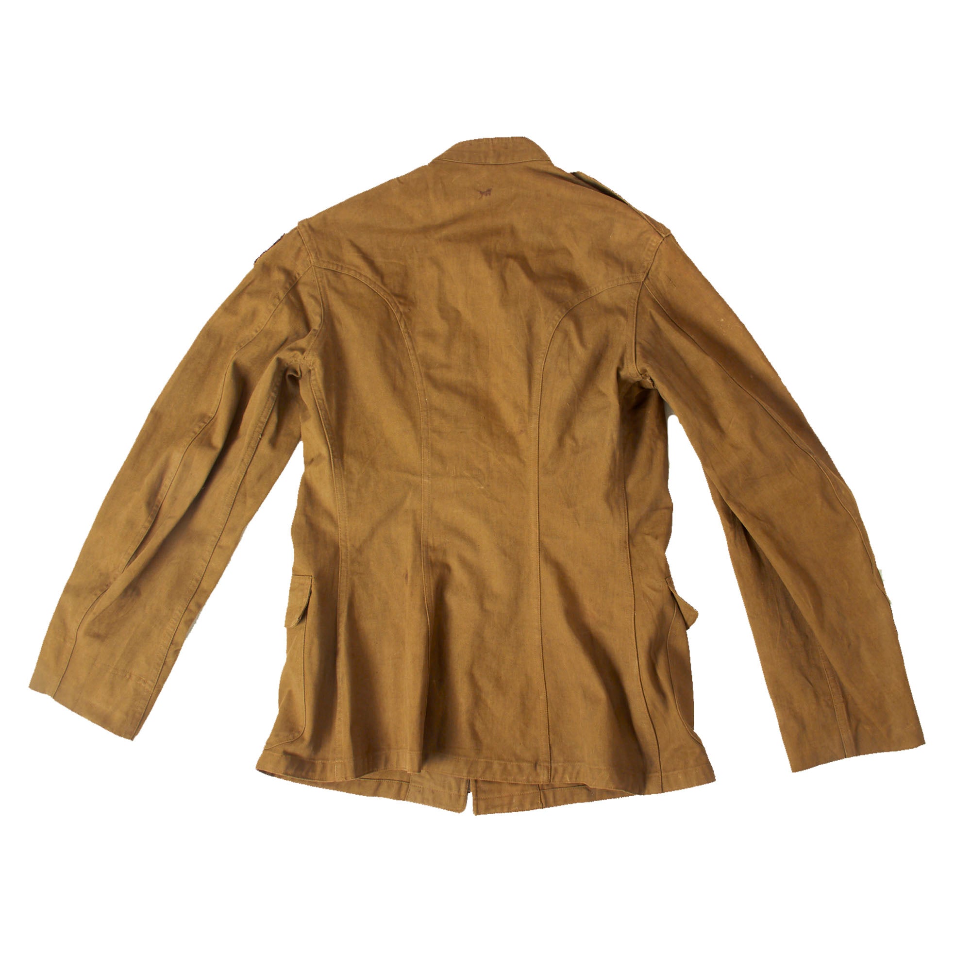 The Tunic is of the M-1916 Cotton variety, with two overseas chevrons in bullion, discharge stripe, velvet three-piece North Russian Expeditionary Force “Walking Polar Bear” Shoulder Sleeve Insignia. A U.S. National Army Collar insignia is on the right side of the collar, and a “D” Company Engineer insignia is on the left. The tunic still retains the original paper label on the collar. The tunic displays very well despite one button being missing and a 2” tear on the right arm