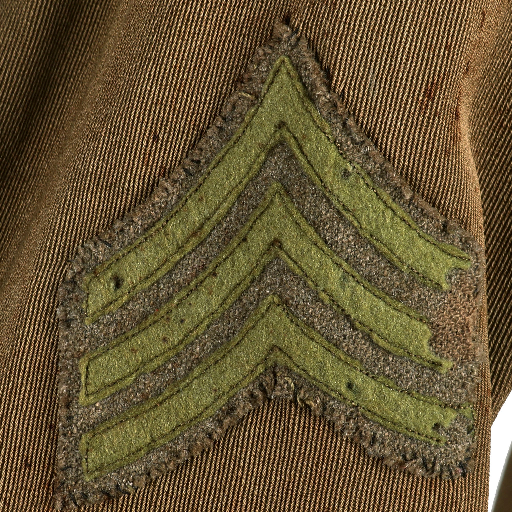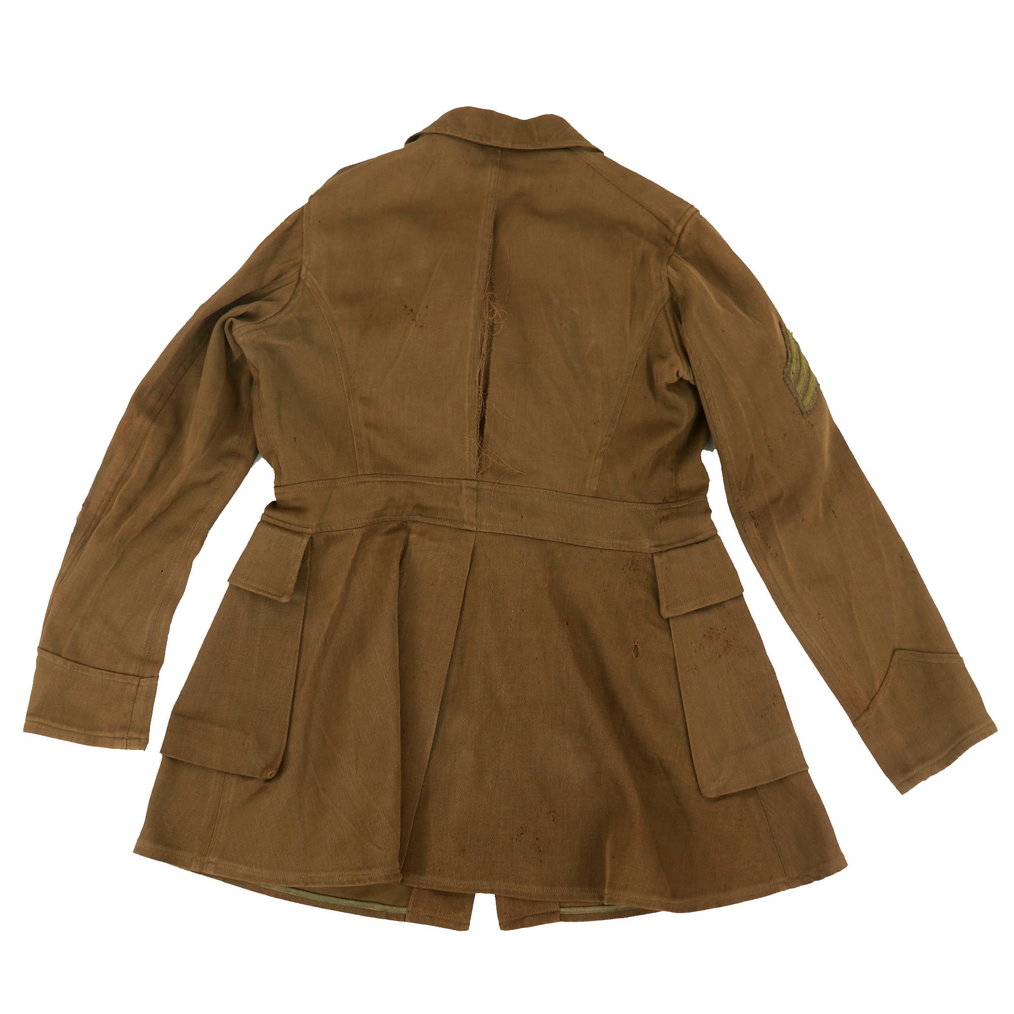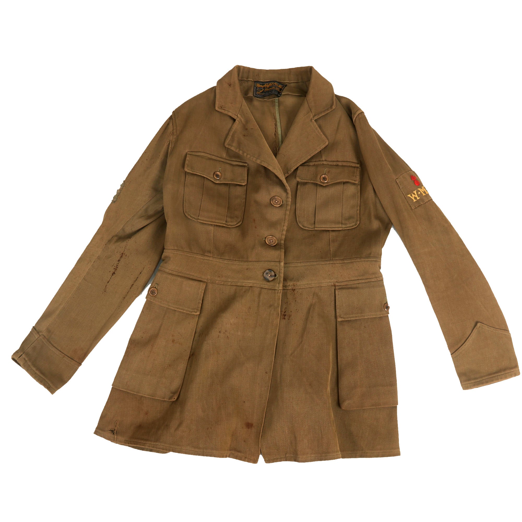 - Privately tailored Women’s Munition Reserve tunic with a WMR patch stitched onto the left sleeve. The patch features a red flaming ordnance bomb above the acronym WMR. On the opposite sleeve is an Army Sergeant’s rate. This ranking system was almost certainly used to distinguish those with more experience in the plant. There is a long tear in the back of the uniform. All buttons are remaining, there is very light mothing on the uniform. This coat was tailored by Mary Ruffit Clothes in New York.