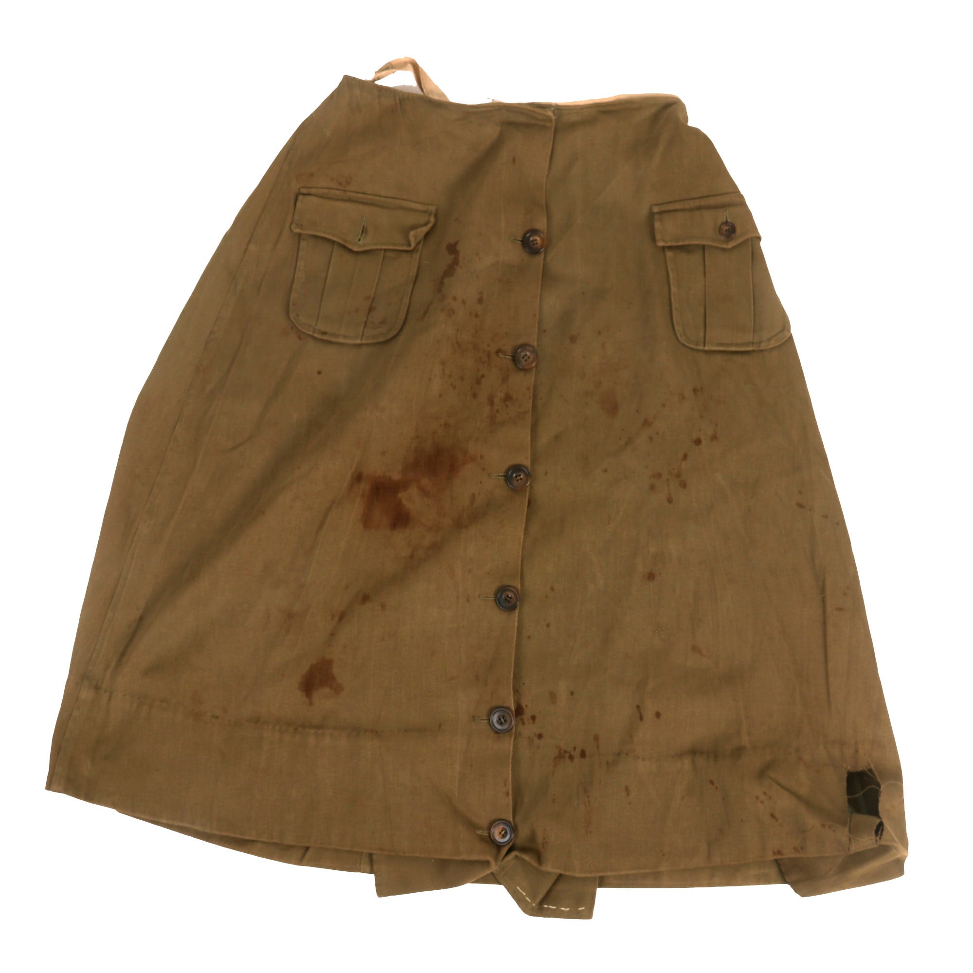 - The matching skirt for the above tunic, has two pockets similar to those on the tunic, with similar staining and one small rip near the bottom. The skirt is in overall great shape.