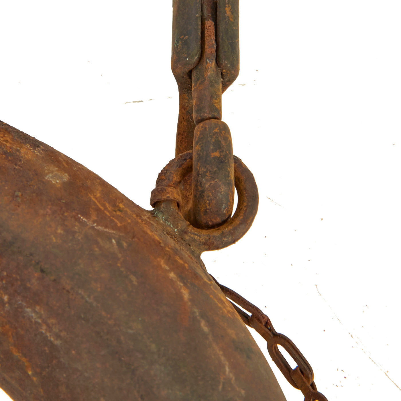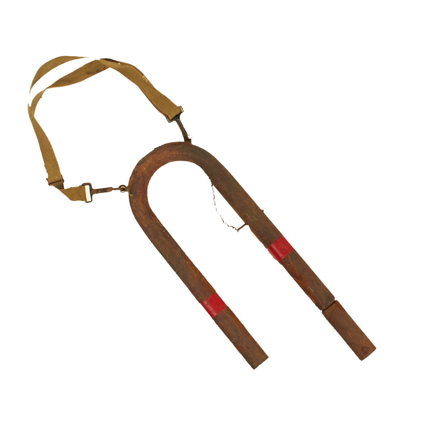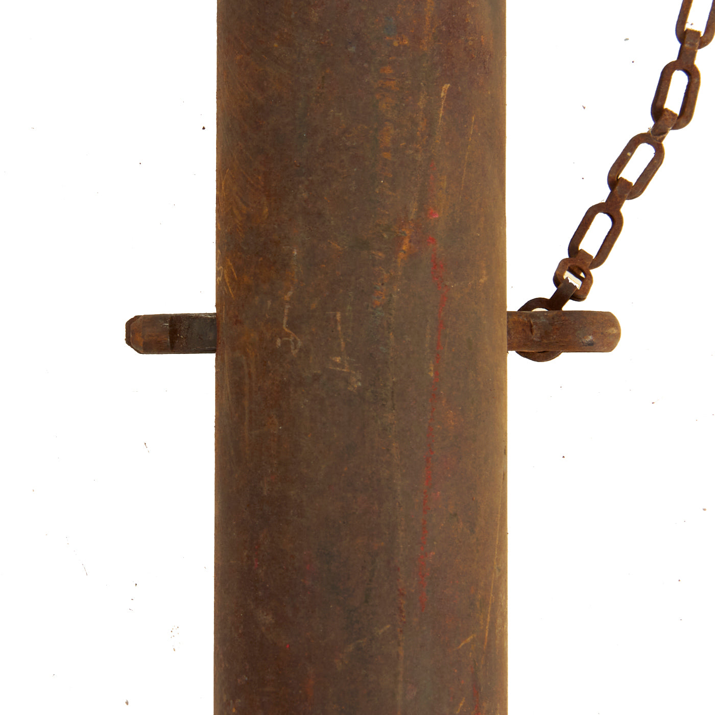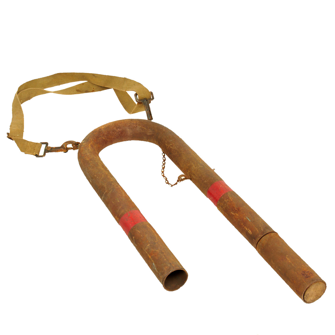 This “U” shaped design is a very simple one. 1 ½ inch hollow metal tubing, at approximately 33 inches, was bent into a U shape and had 2 eyelets on the top to attach some sort of sling system like the one you can see in the pictures. The sling system is still completely functional with no major damage to the webbing, clips or buckles. Attached to the gong, by a large cotter pin on a chain, is a trench club style device. This wooden handled instrument is 12 inches in length with 4 inches of hollow metal tubing slid over top of the wood and fastened with a single metal pin going through the both of them. The metal used is more than likely excess metal tubing that went into making the gongs. The about 10 inch chain is fastened to a top eyelet running through a hole made in the bottom of the club and then secured by a large cotter pin which is then secured into the gong.