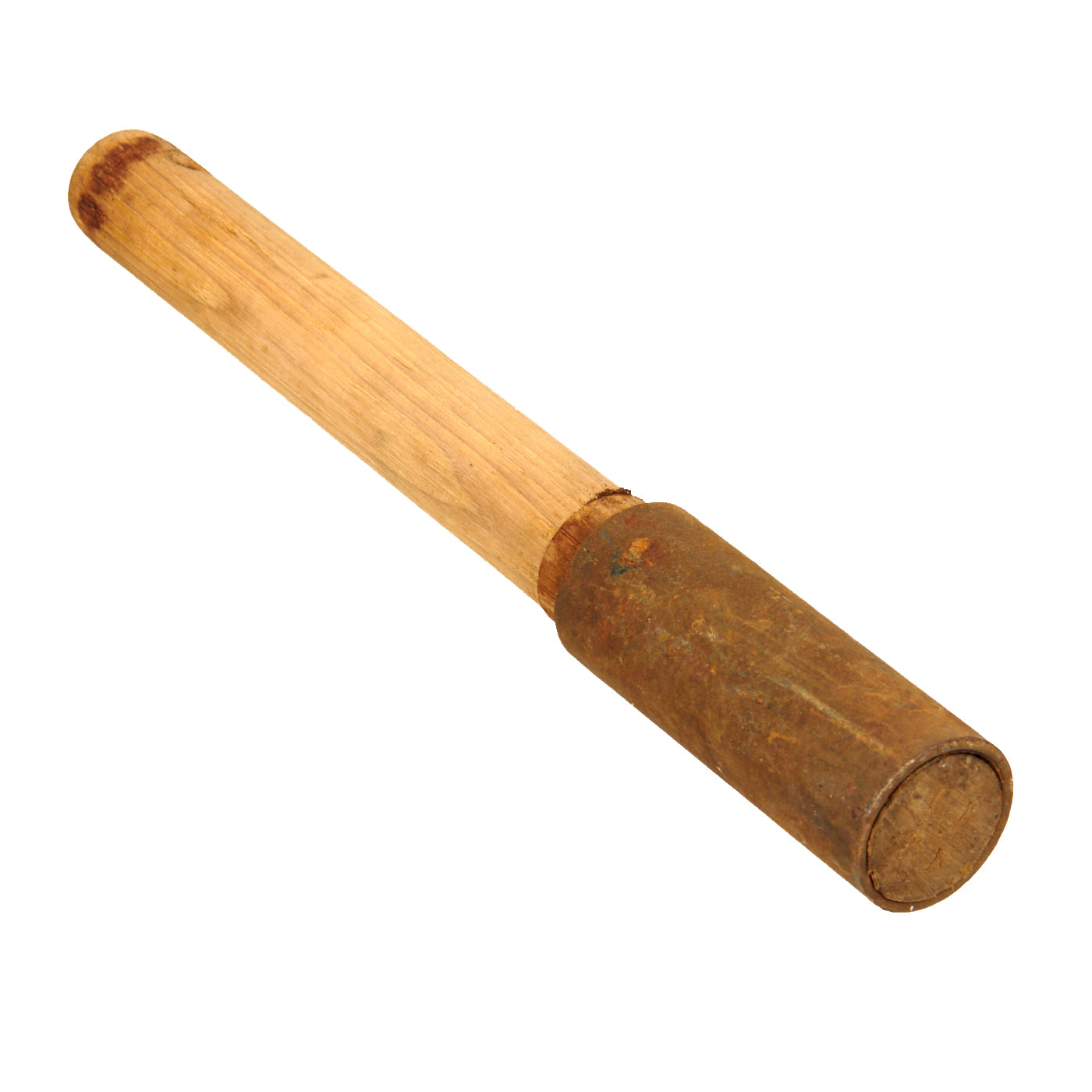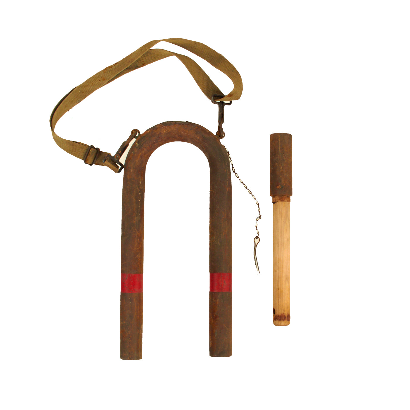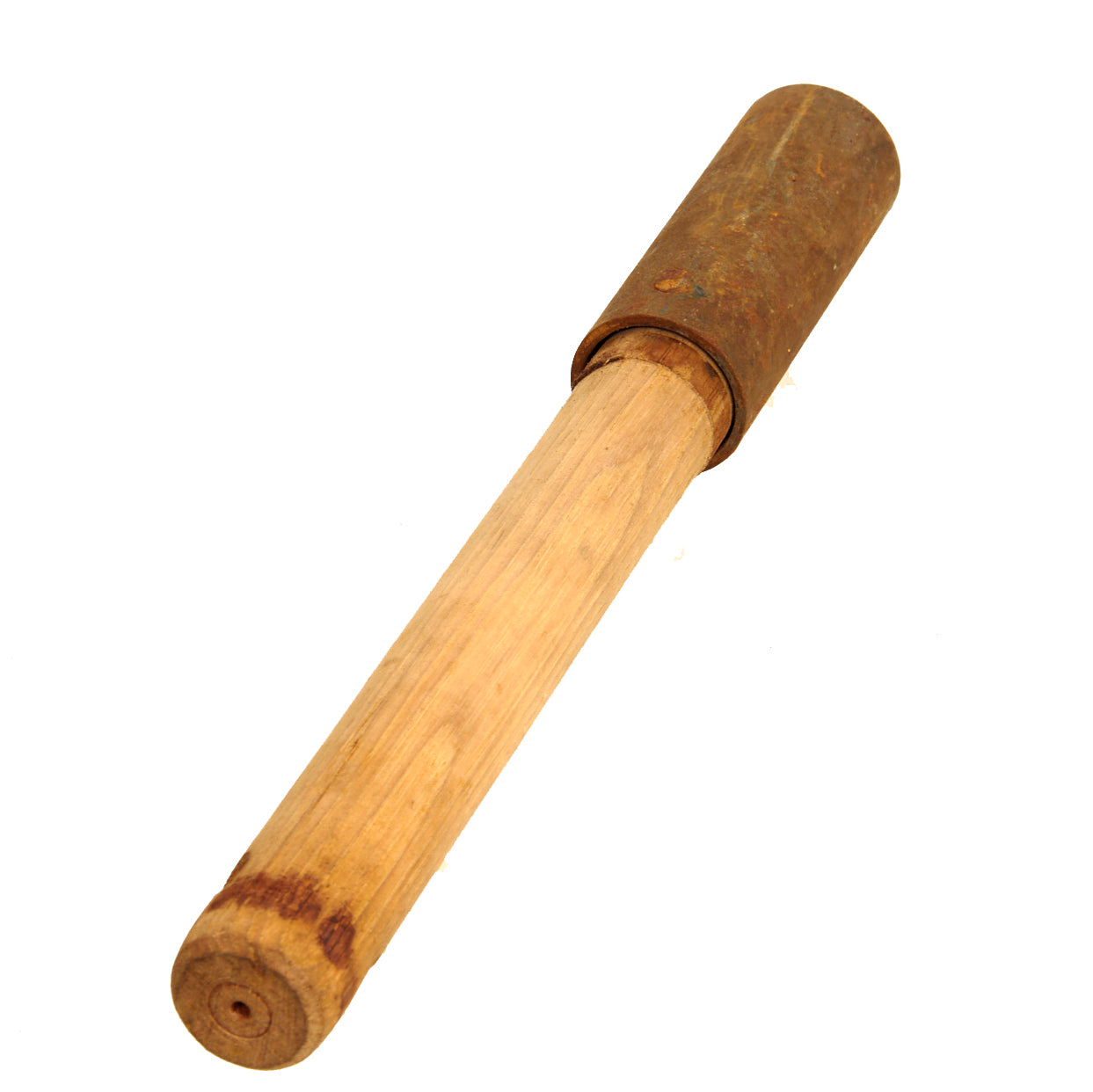 This example is a complete, fully functional and beautiful one at that. There are still original red rings painted around the tubing and there’s no significant damage to the device but there is rust damage at the top, but the metal is still solid. The “club” appears as if it was used many times to strike the gong, you can see noticeable indents in the metal sleeve. The wooden handle has no damage besides minor surface scratches.