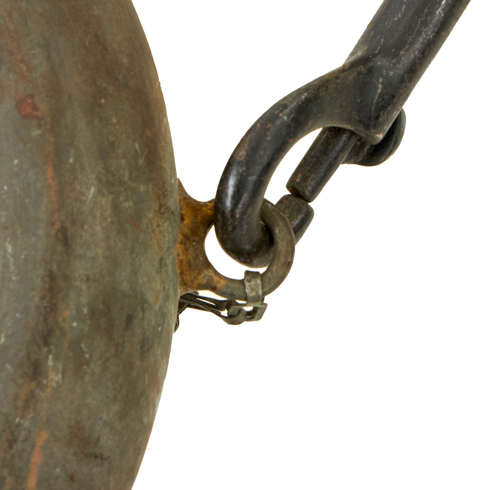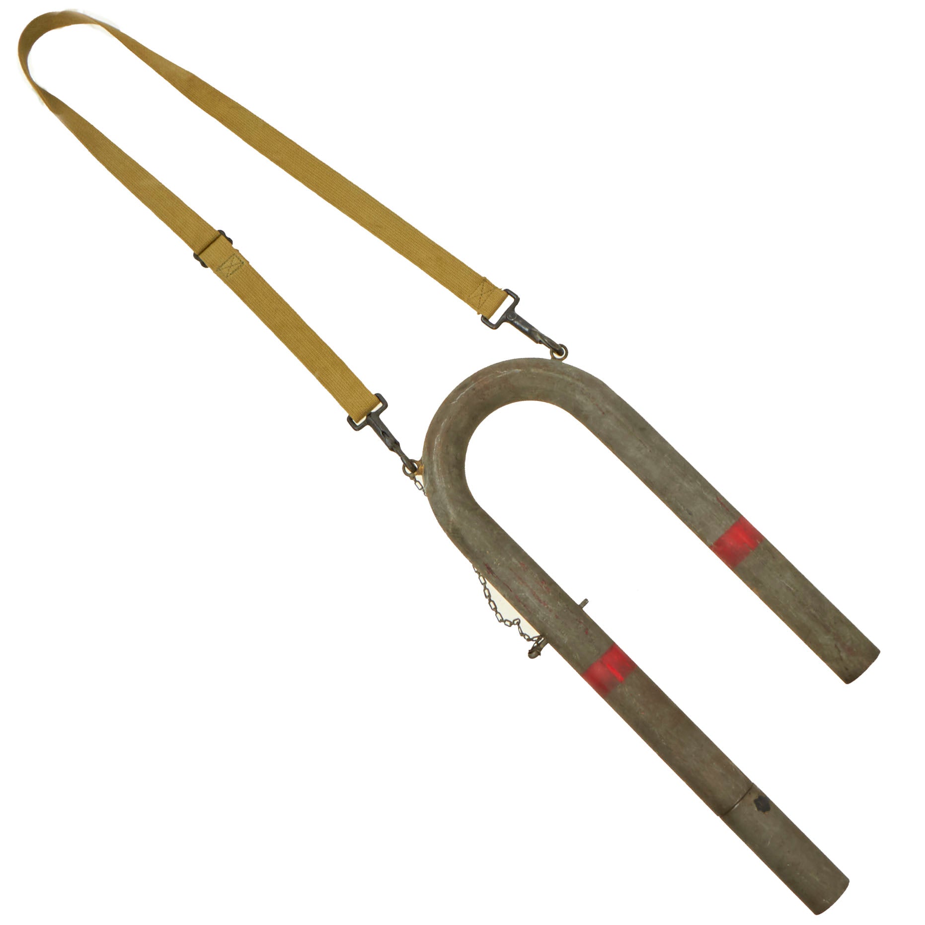 This “U” shaped design is a very simple one. 1 ½ inch hollow metal tubing, at approximately 33 inches, was bent into a U shape and had 2 eyelets on the top to attach some sort of sling system like the one you can see in the pictures. The sling system is still completely functional with no major damage to the webbing, clips or buckles. Attached to the gong, by a large cotter pin on a chain, is a trench club style device. This wooden handled instrument is 12 inches in length with 4 inches of hollow metal tubing slid over top of the wood and fastened with a single metal pin going through the both of them. The metal used is more than likely excess metal tubing that went into making the gongs. The about 10 inch chain is fastened to a top eyelet running through a hole made in the bottom of the club and then secured by a large cotter pin which is then secured into the gong.
