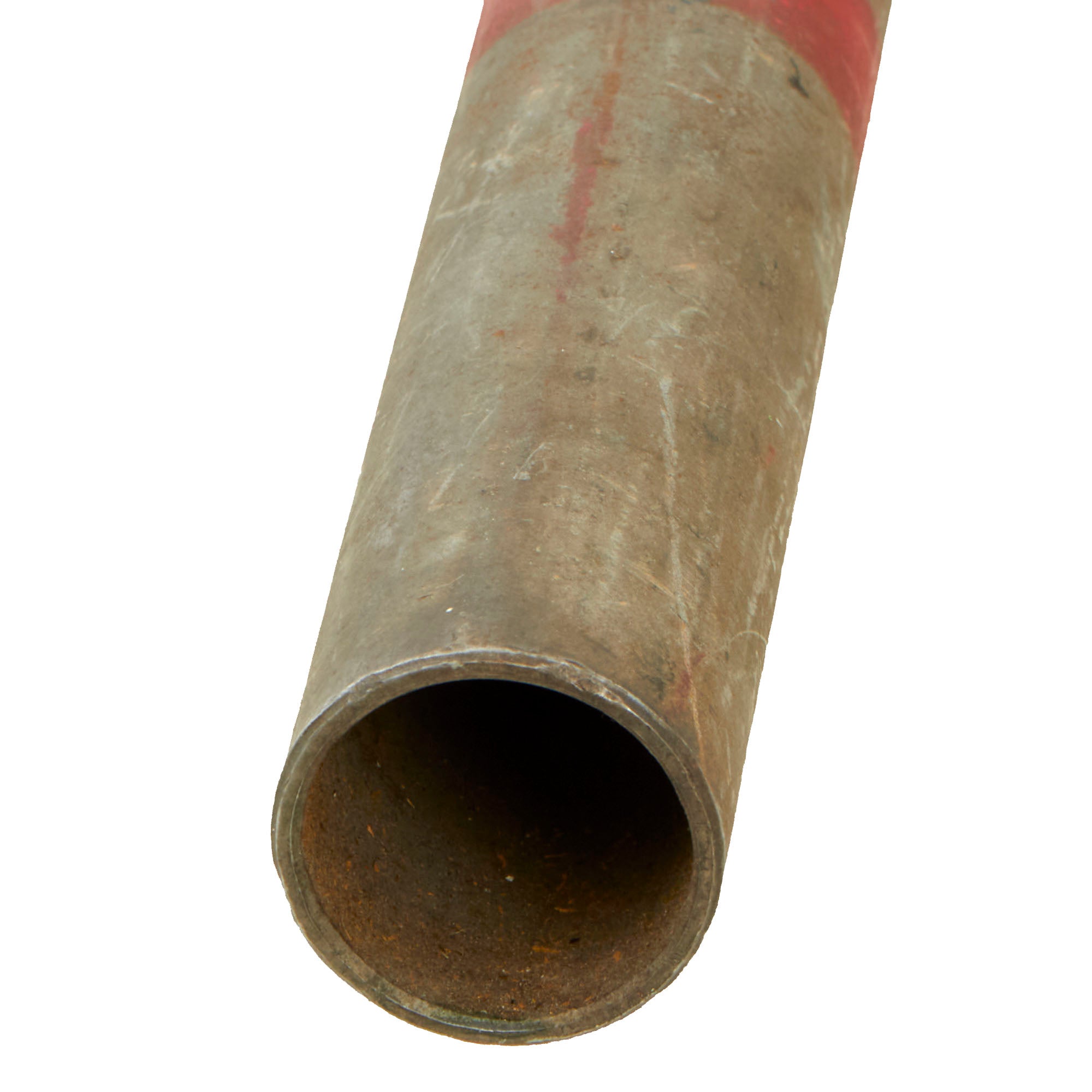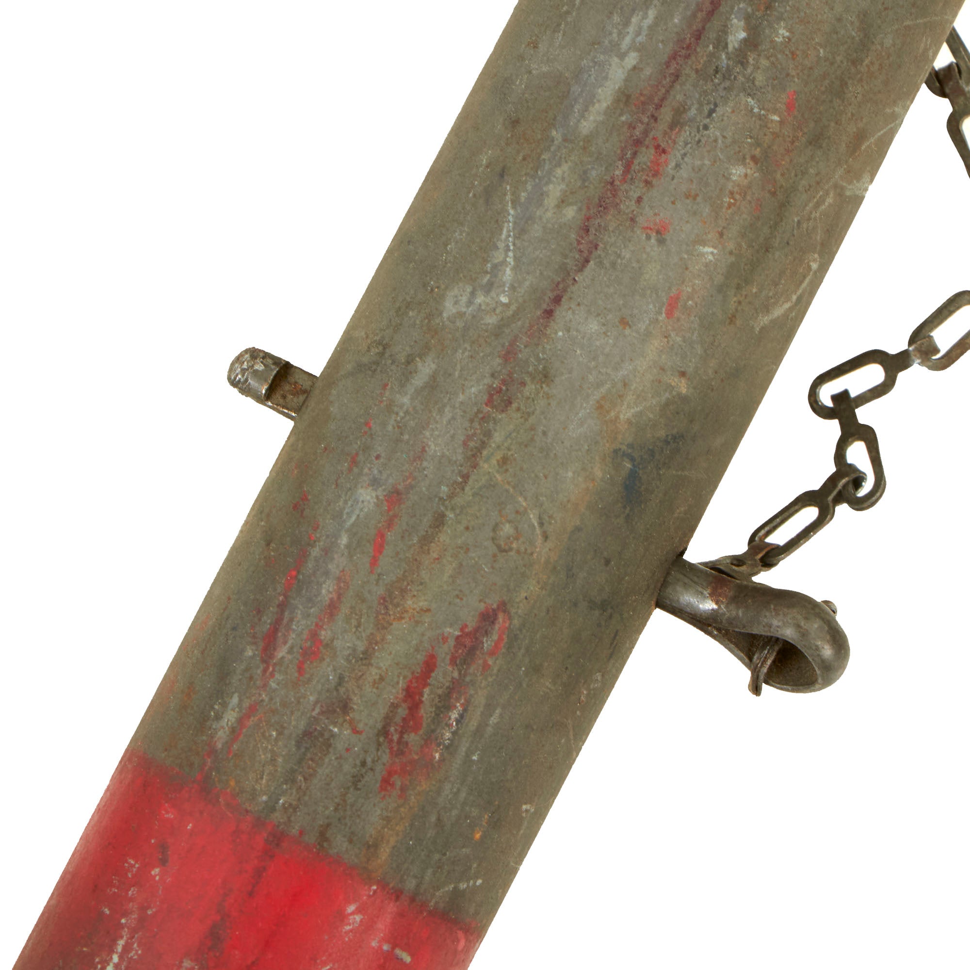 This example is a complete, fully functional and beautiful one at that. There are still original red rings painted around the tubing and there’s no significant damage to the device but there is light rust on the interior of the tube. The “club” appears as if it was used many times to strike the gong, you can see noticeable indents in the metal sleeve. The wooden handle has no damage besides minor surface scratches.