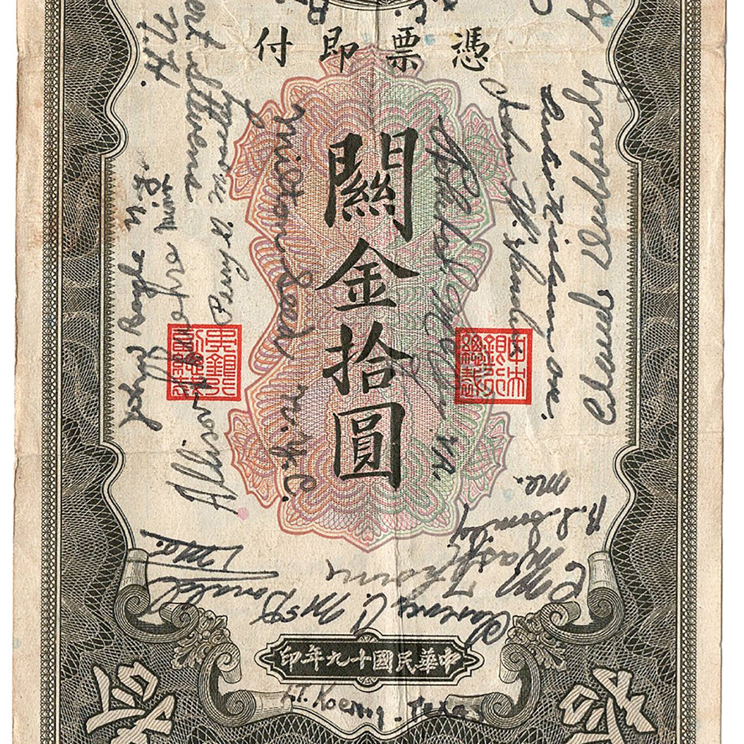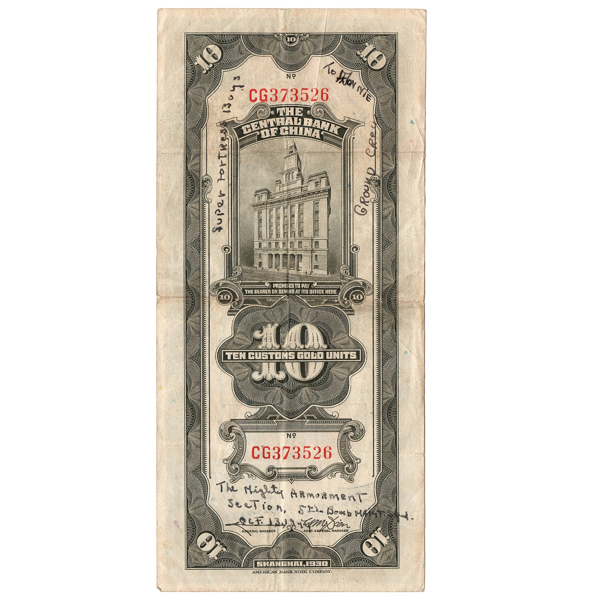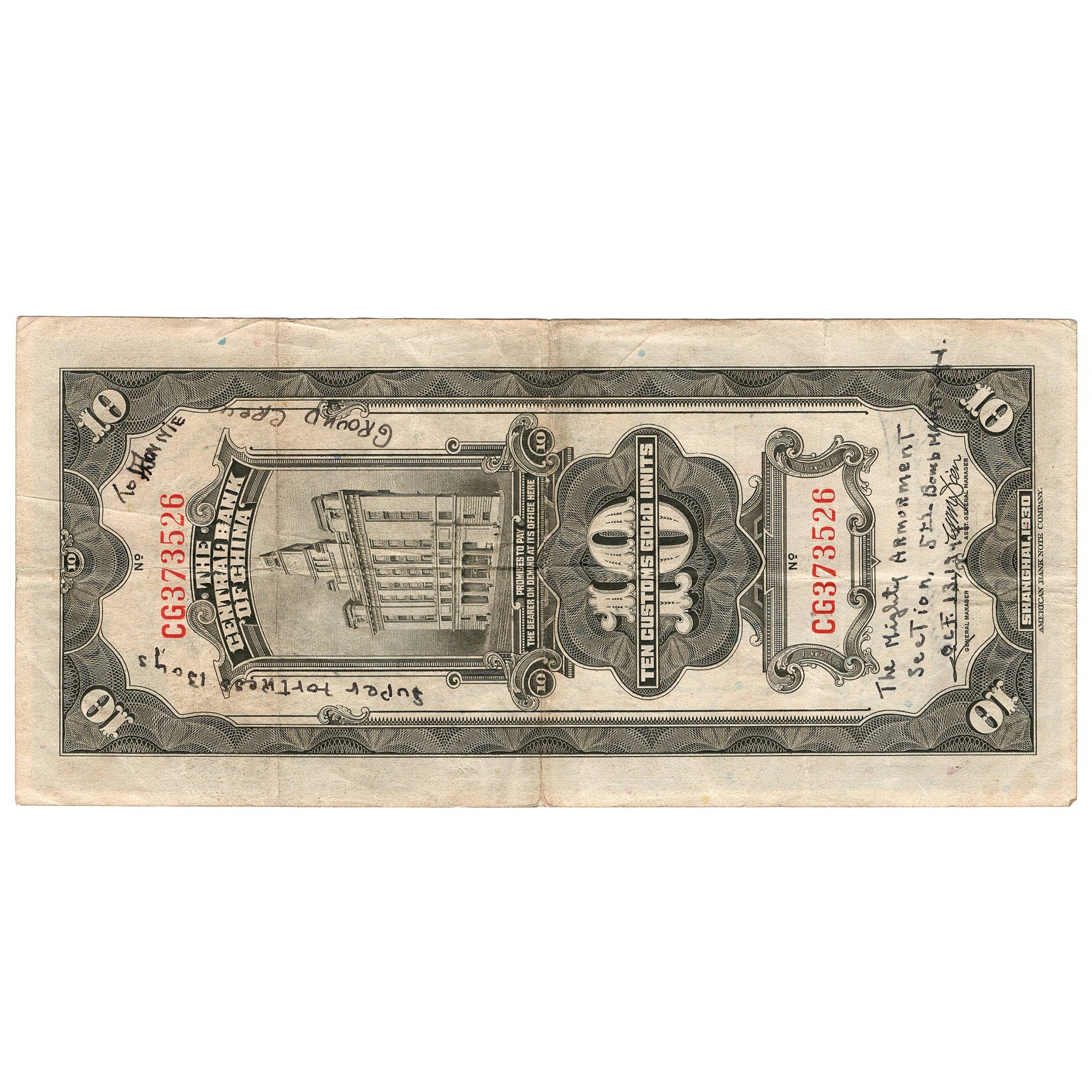 This particular example is on a Chinese Ten Customs Gold Unit Note. The customs gold unit (CGU) was a currency issued by the Central Bank of China between 1930 and 1948. In Chinese, was literally "customs gold yuan" but the English name given on the back of the notes was "customs gold unit". It was divided into 100 cents. As the name suggests, this currency was initially used for customs payments, but in 1942 it was put into general circulation for use by the public at 20 times its face value in terms of the first Chinese yuan.
