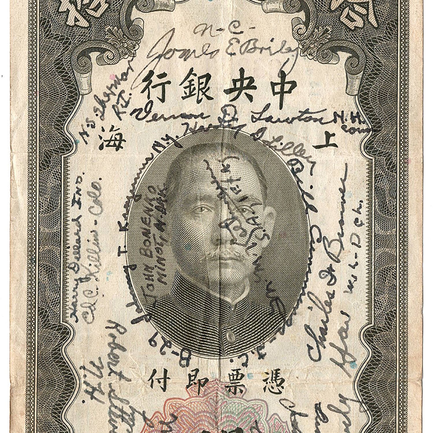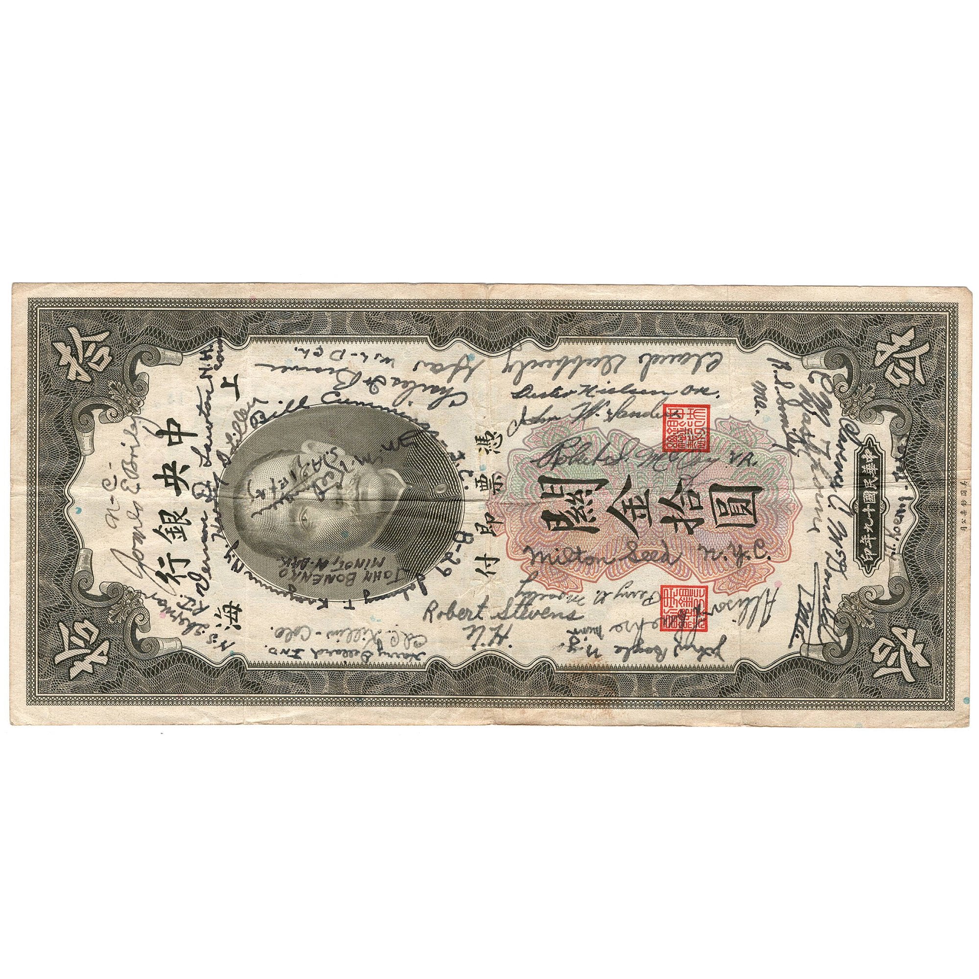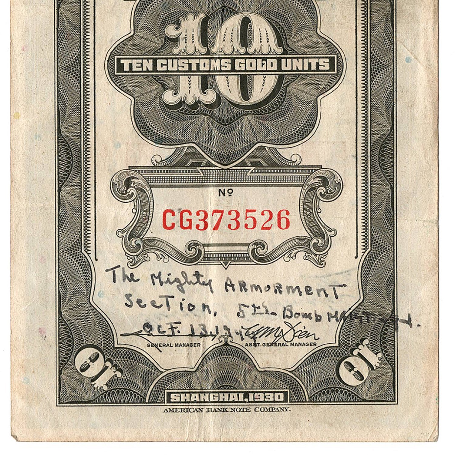 This particular example is on a Chinese Ten Customs Gold Unit Note. The customs gold unit (CGU) was a currency issued by the Central Bank of China between 1930 and 1948. In Chinese, was literally "customs gold yuan" but the English name given on the back of the notes was "customs gold unit". It was divided into 100 cents. As the name suggests, this currency was initially used for customs payments, but in 1942 it was put into general circulation for use by the public at 20 times its face value in terms of the first Chinese yuan.