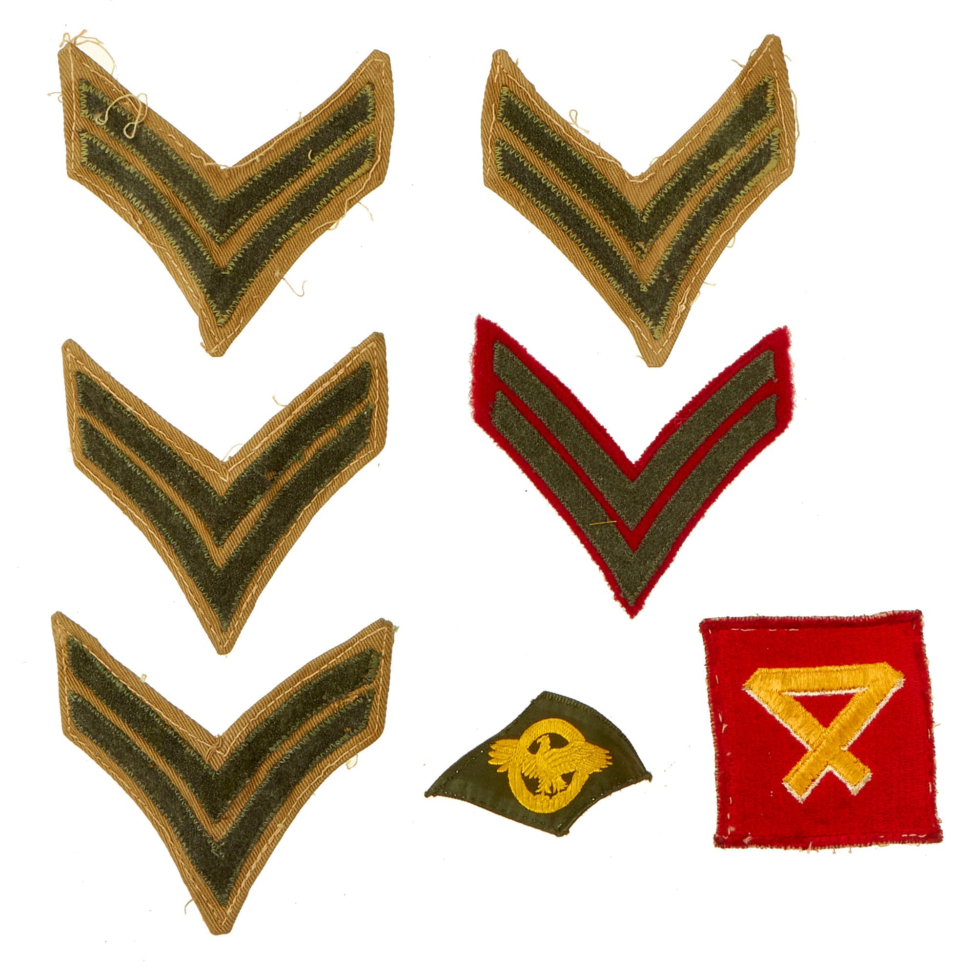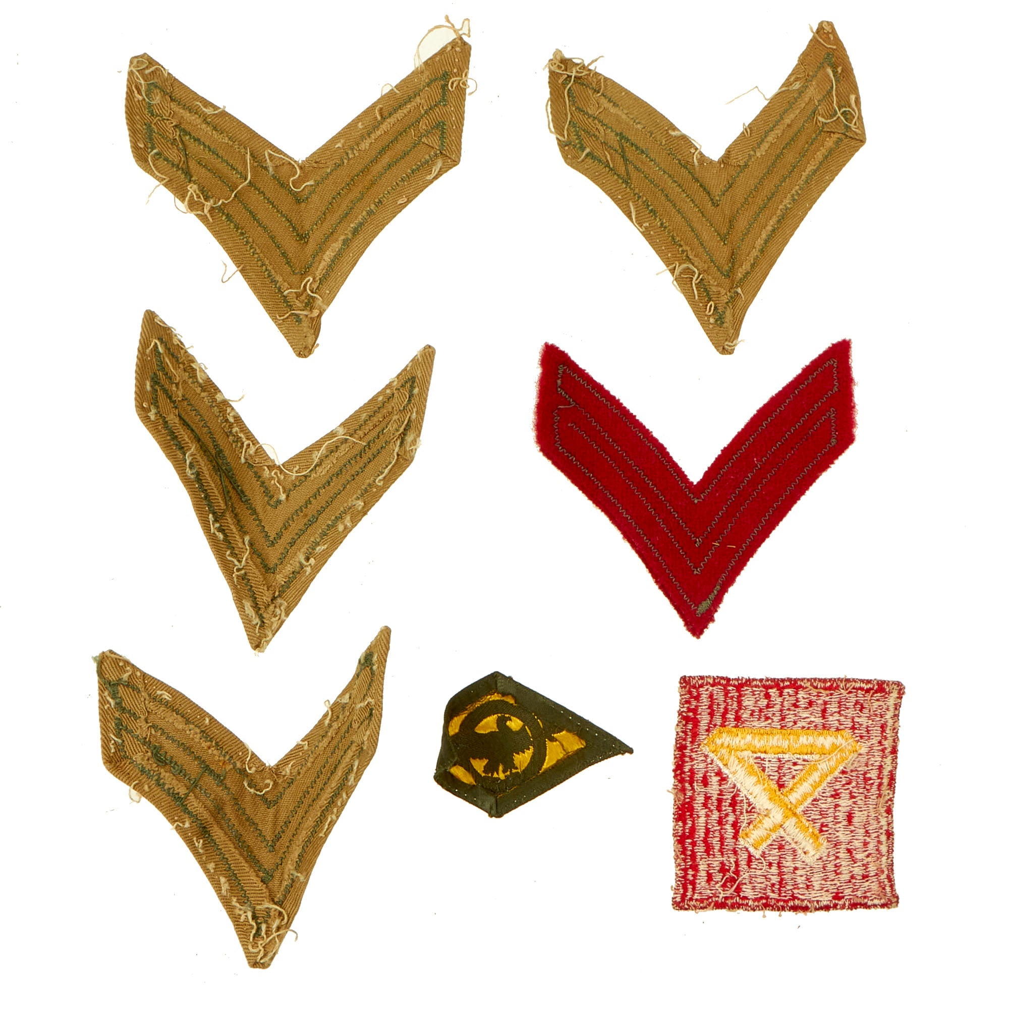 - - Patches; 4th MARDIV Shoulder Sleeve Insignia, Three Khaki Corporal Chevrons, one set of Red/Green Corporal Chevrons