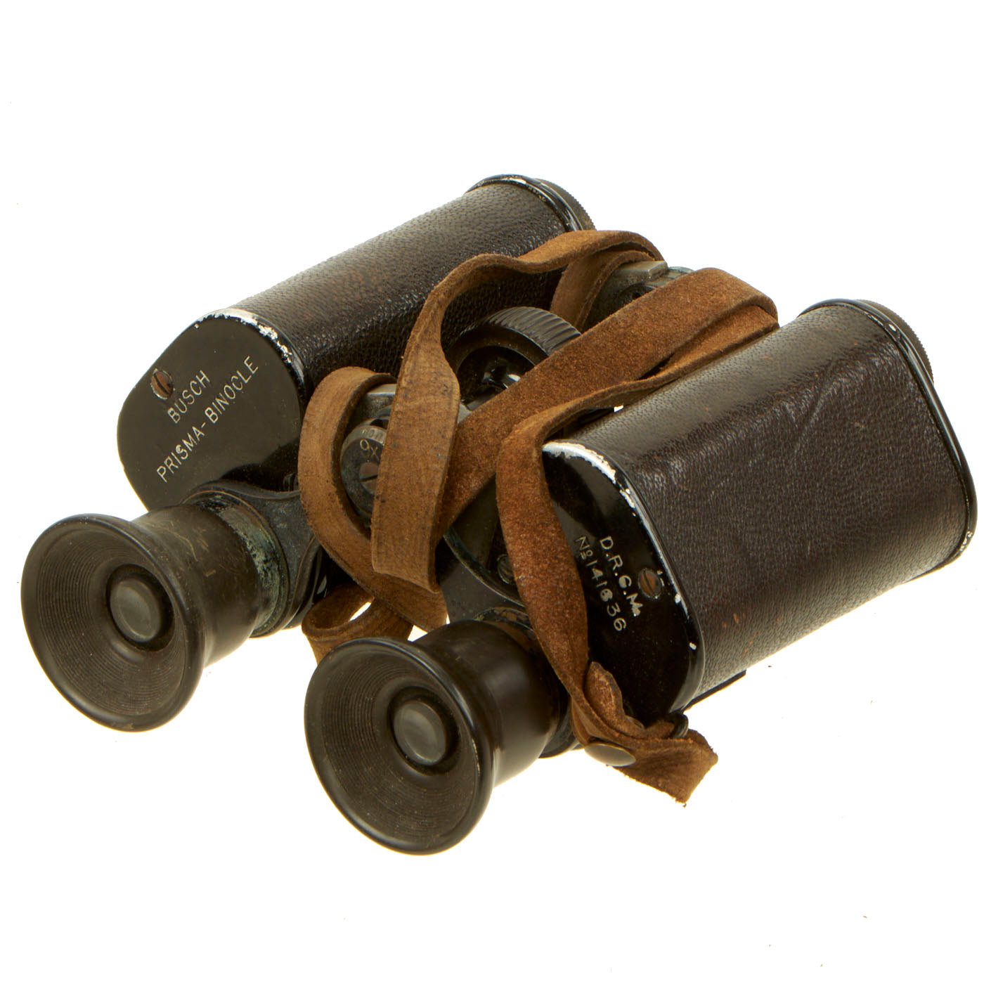 The first set of binoculars is a German made pair by Busch Prisma-Binocle. These binoculars are in good condition. The glass looks fairly clean and can be used still today! The leather strap is still intact. It has the serial number 141636 on it and the letters D.R.G.M. which stands for loosely as the “German Reich Utility Model” and can be found on the right side.