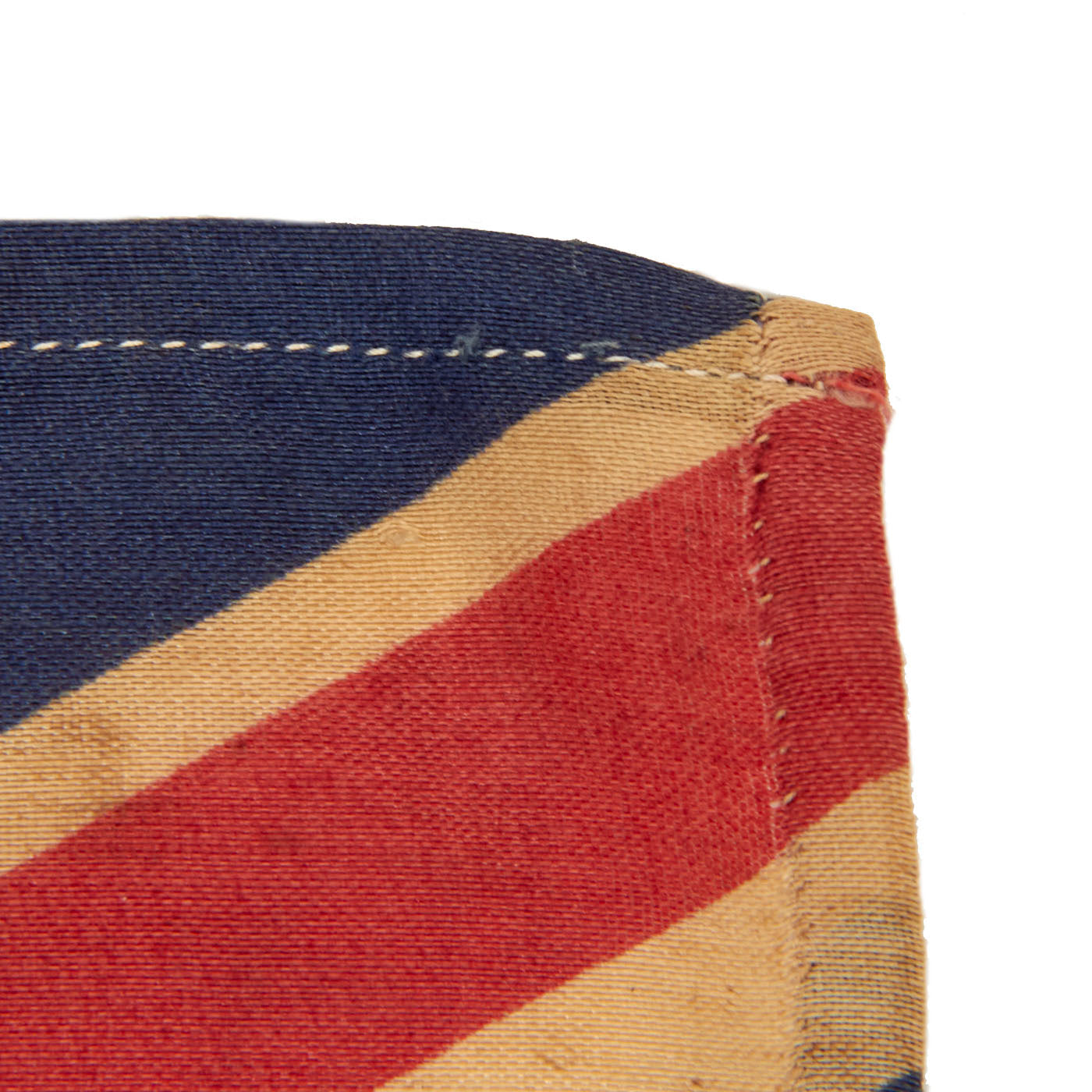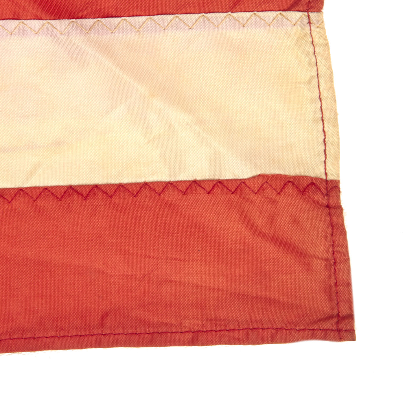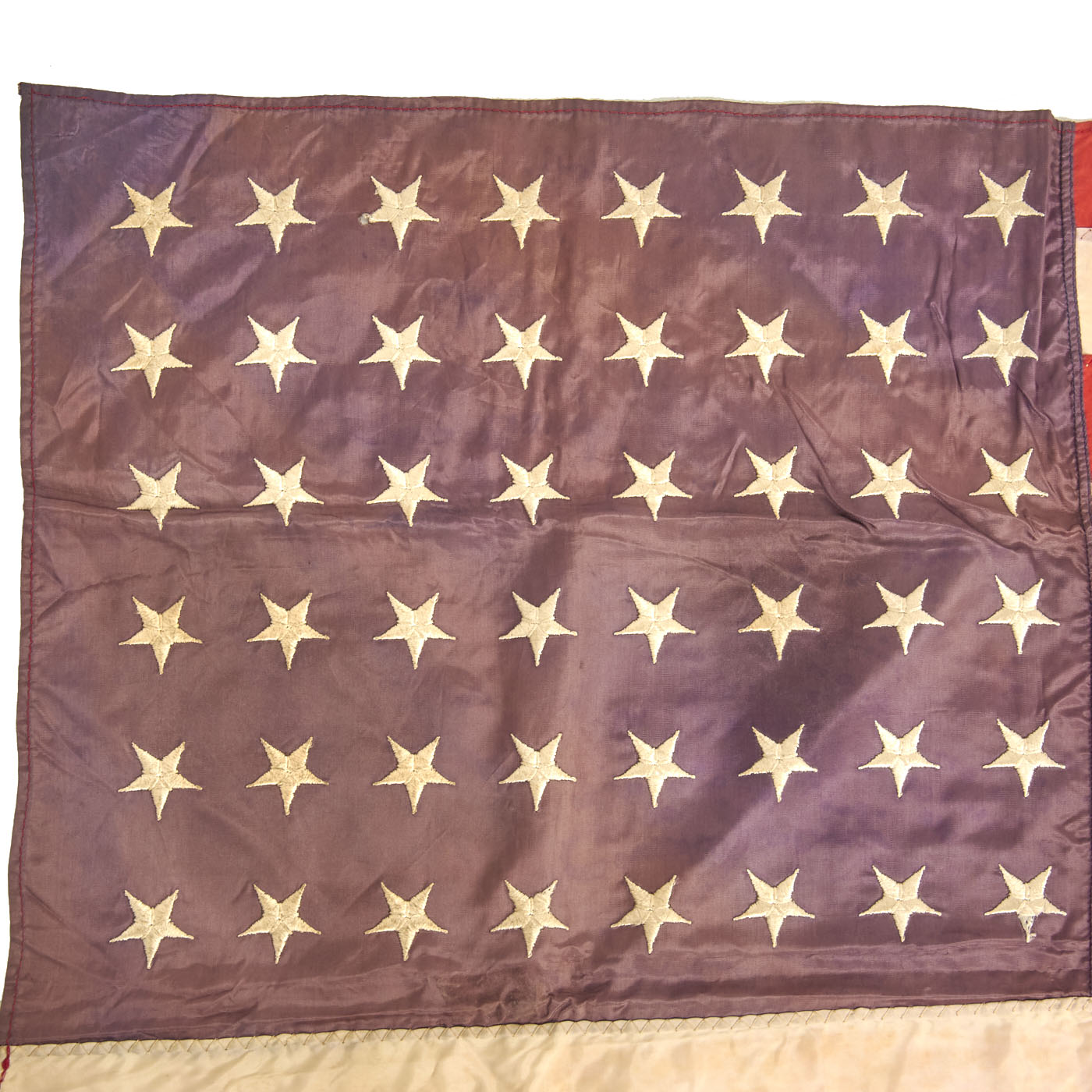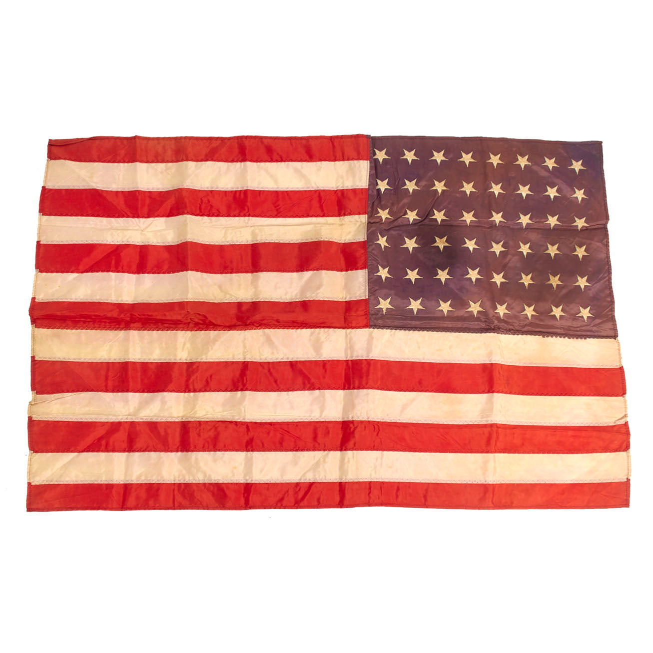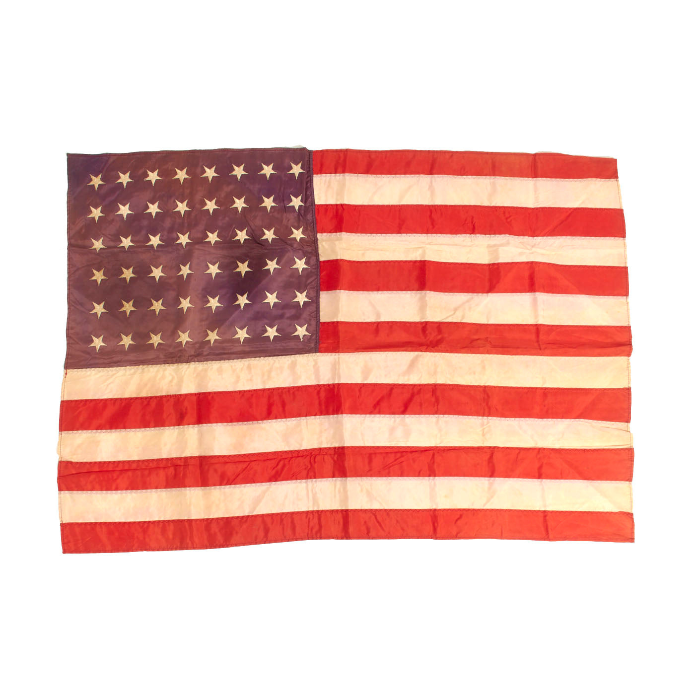 - 34 ½” x 24 ½” American Flag: During the war some 16,112,566 Americans served in the United States Armed Forces, with 405,399 killed and 671,278 wounded. There were also 130,201 American prisoners of war, of whom 116,129 returned home after the war. Key civilian advisors to President Roosevelt included Secretary of War Henry L. Stimson, who mobilized the nation's industries and induction centers to supply the Army, commanded by General George Marshall and the Army Air Forces under General Hap Arnold. The Navy, led by Secretary of the Navy Frank Knox and Admiral Ernest King, proved more autonomous. Overall priorities were set by Roosevelt and the Joint Chiefs of Staff, chaired by William Leahy. The highest priority was the defeat of Germany in Europe, but first the war against Japan in the Pacific was more urgent after the sinking of the main battleship fleet at Pearl Harbor. The flag is in lovely condition with minor fading.
