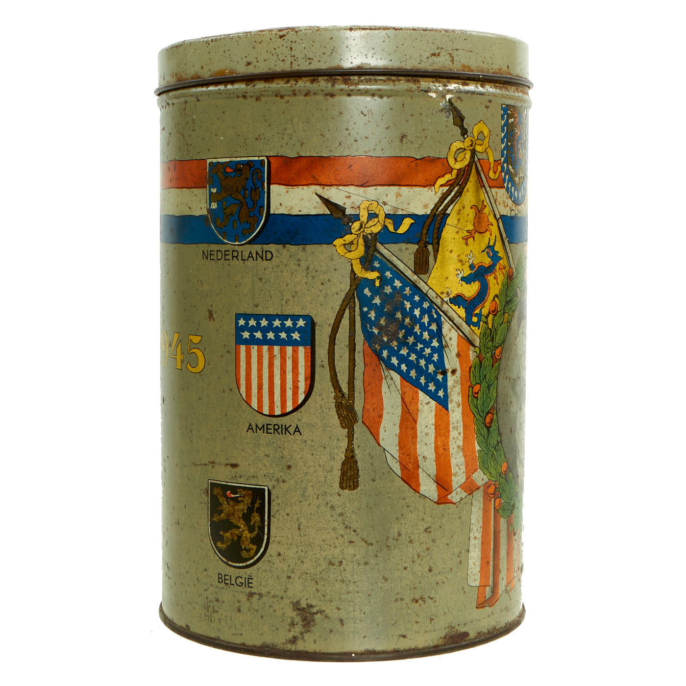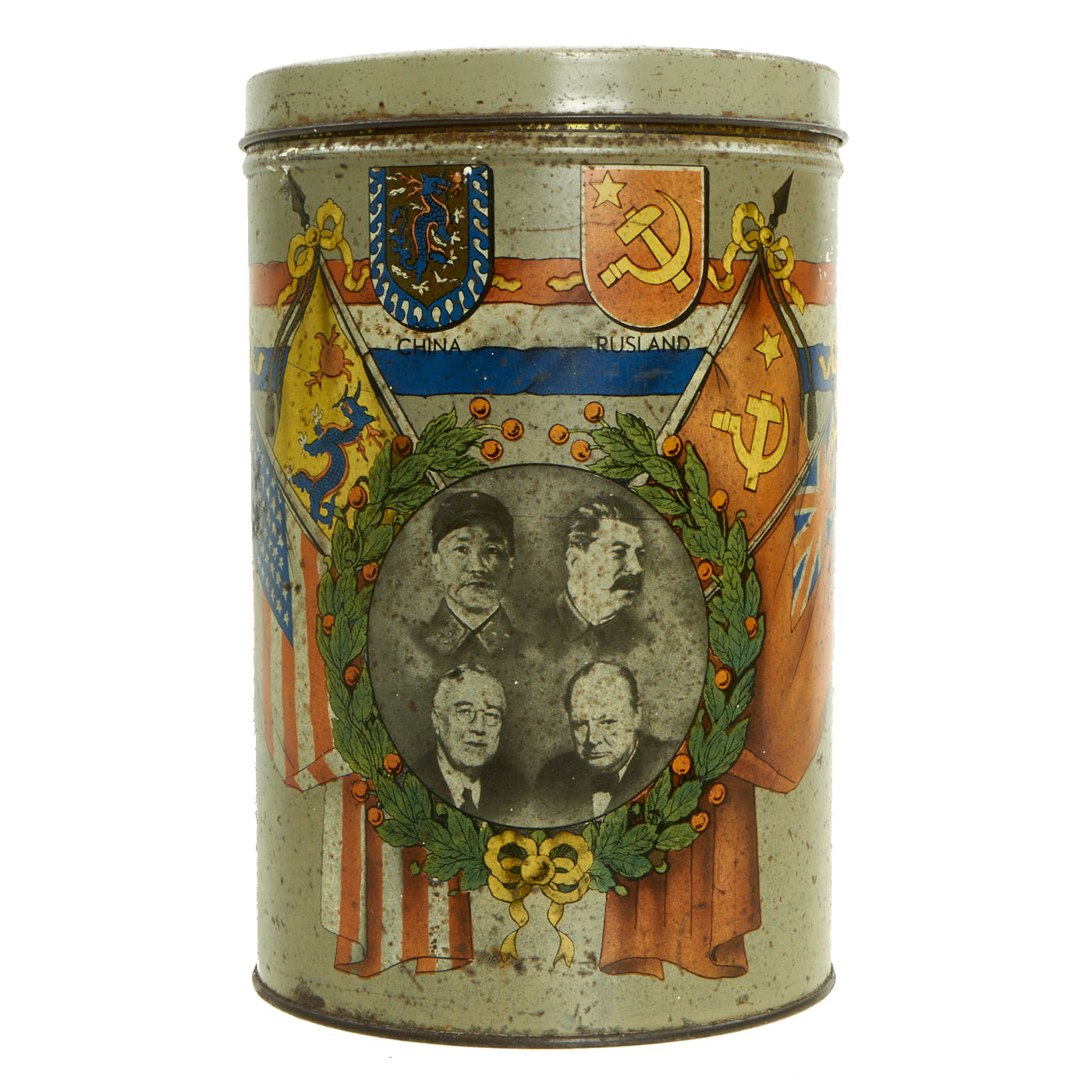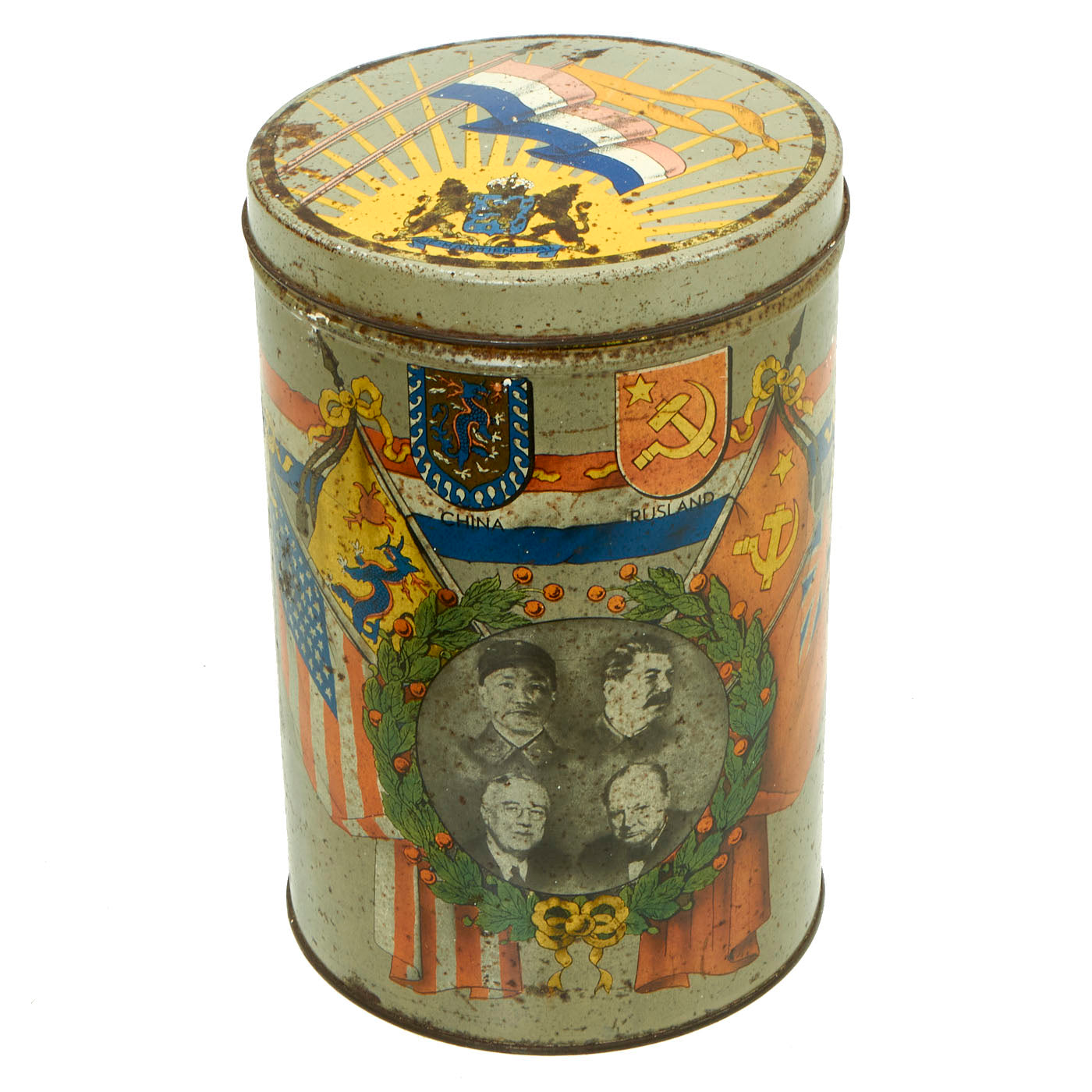 This 9.5" tall, 6.25" in diameter, lithographed tin container was widely produced to mark the end of World War II. It depicts FDR, Churchill, Stalin and Chiang Kai Shek on the front, within a wreath, surrounded by flags of their respective countries, dated 1939-1945. The lid depicts the Netherlands national flag. There is minor rust; otherwise, in outstanding condition with almost all of the original colors still vibrant and lovely.