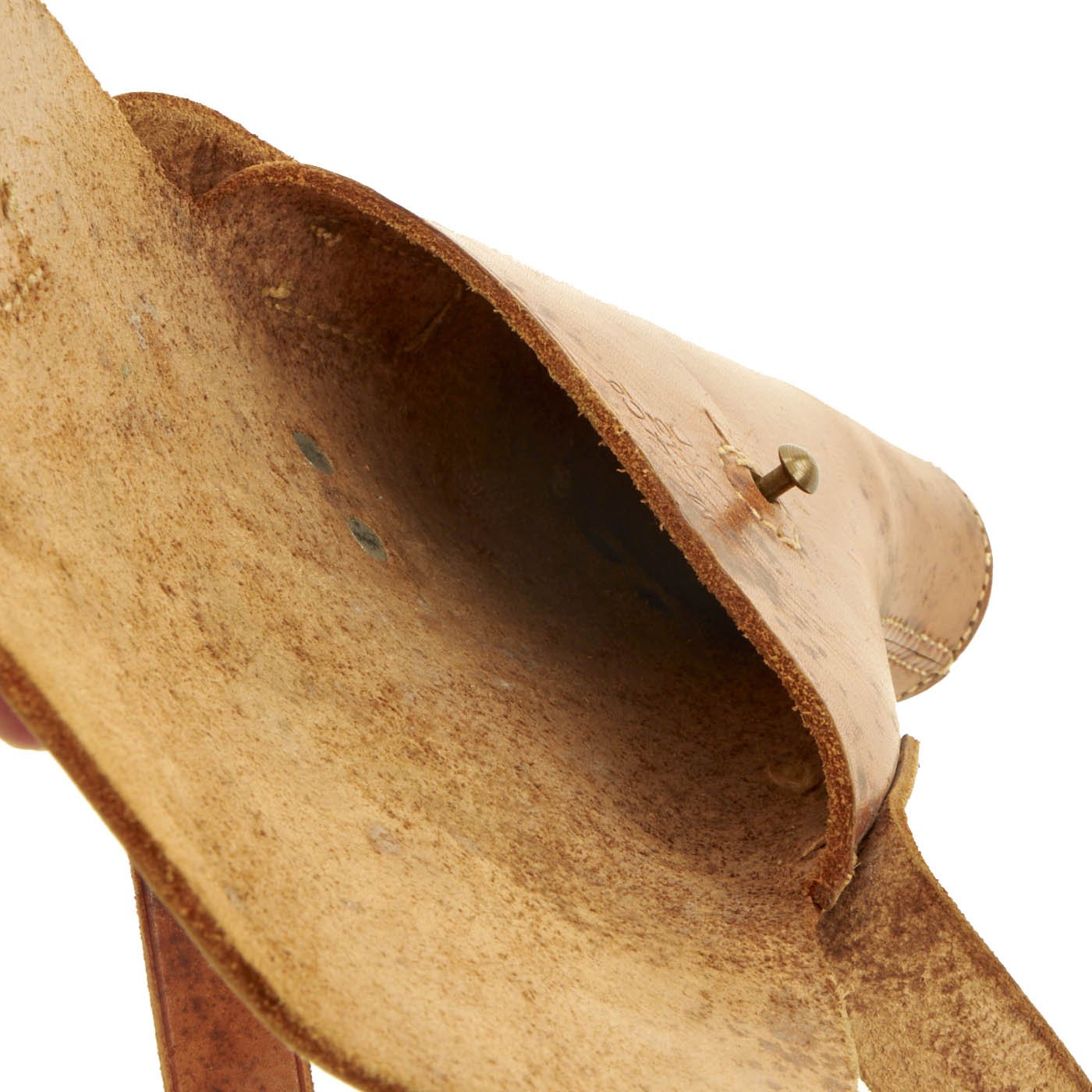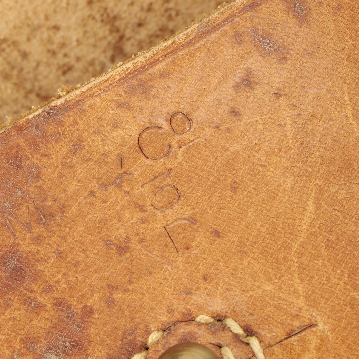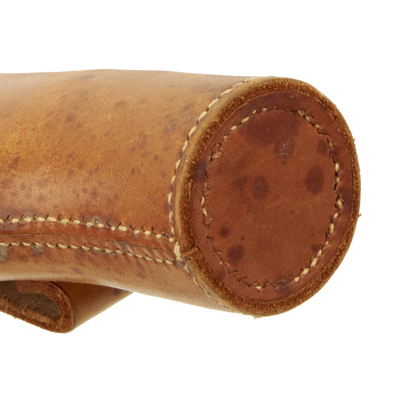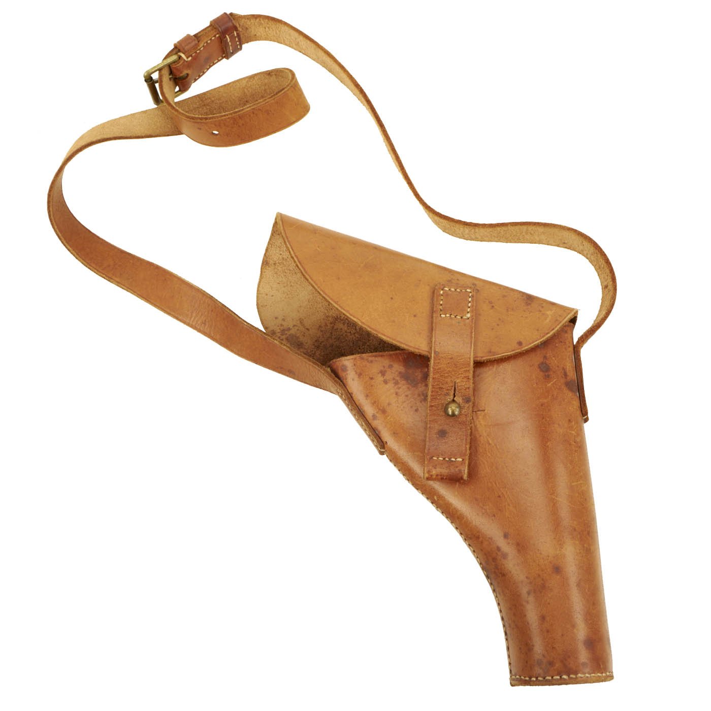 The holster included with this pistol is the standard brown leather large holster used during both WWI and WWII complete with shoulder strap. It is in very solid condition, with a maker marking above the closure stud on the front of the holster: M.H. & Co. / 1943 / D (broadarrow) D.