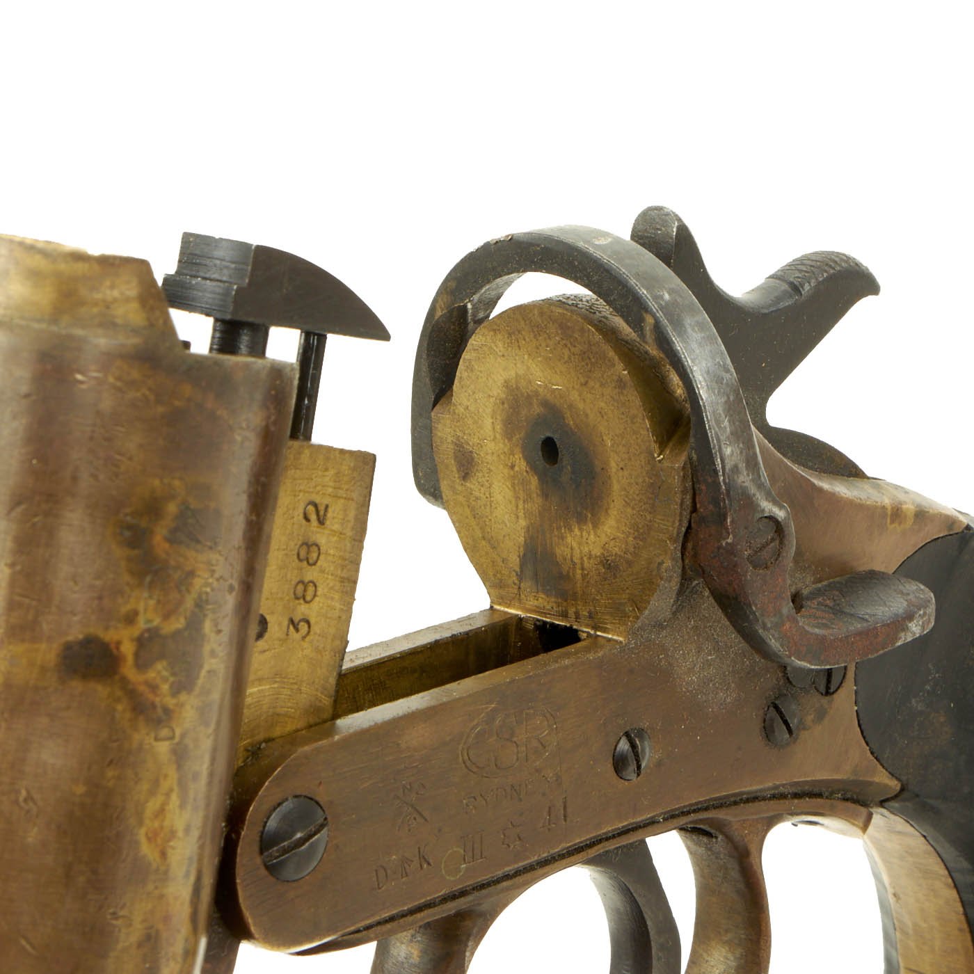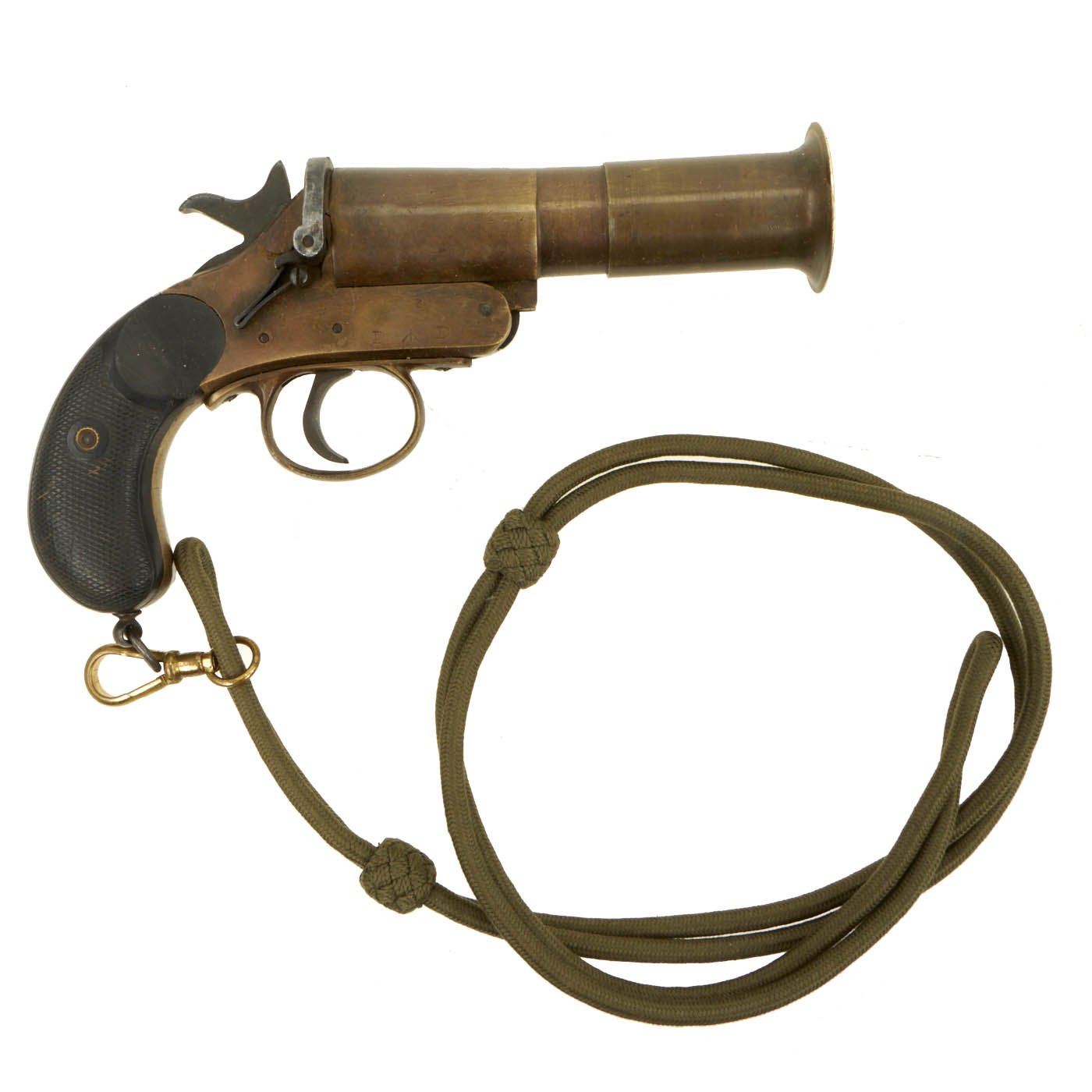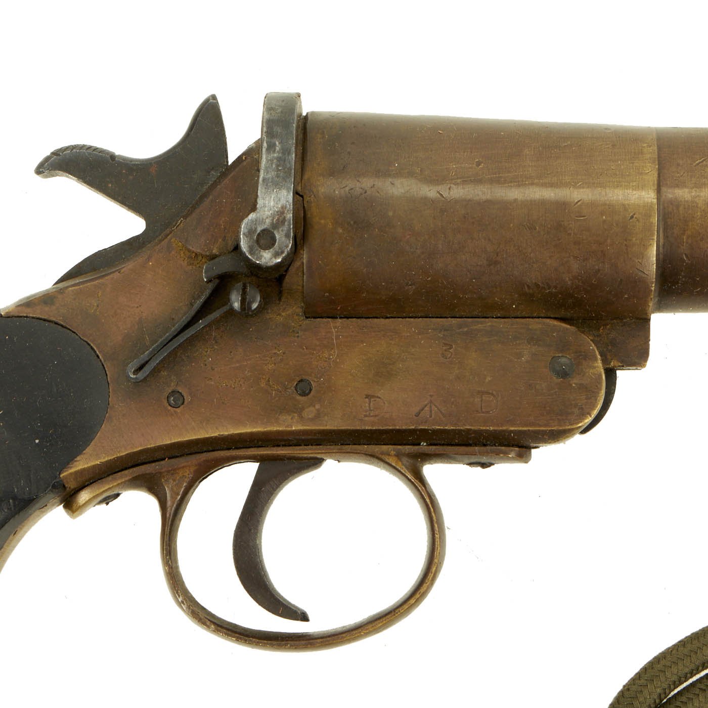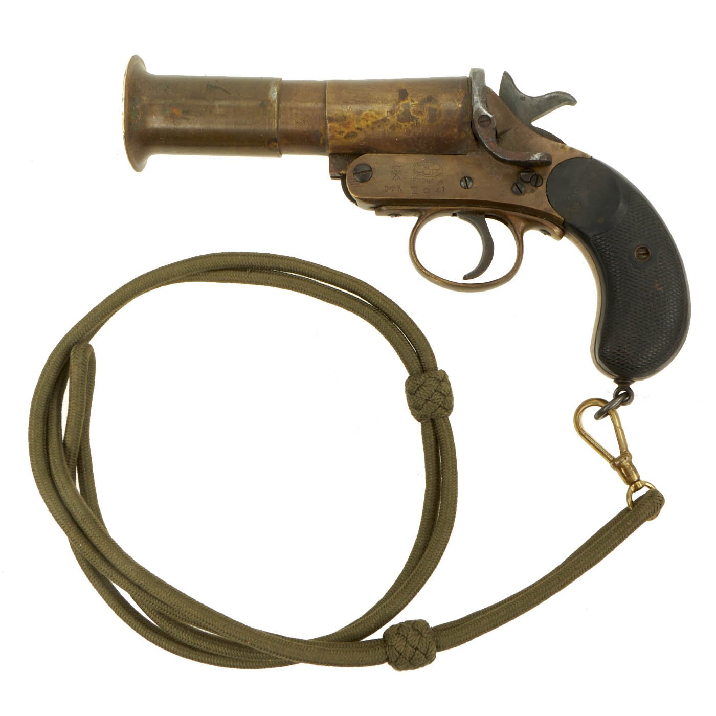 Original Item: Only one available. This is a very nice WWII-produced example of the Australian military Mark III* flare pistol, as issued and used during the last part of World War I and early in WWII by British and Commonwealth Forces. The rig comes complete with an original 1943 dated leather holster with maker markings, and “DD Broadarrow” Australian Military proofmarks. This particular Mark III* signal pistol was produced by The Colonial Sugar Refinery of Sydney.