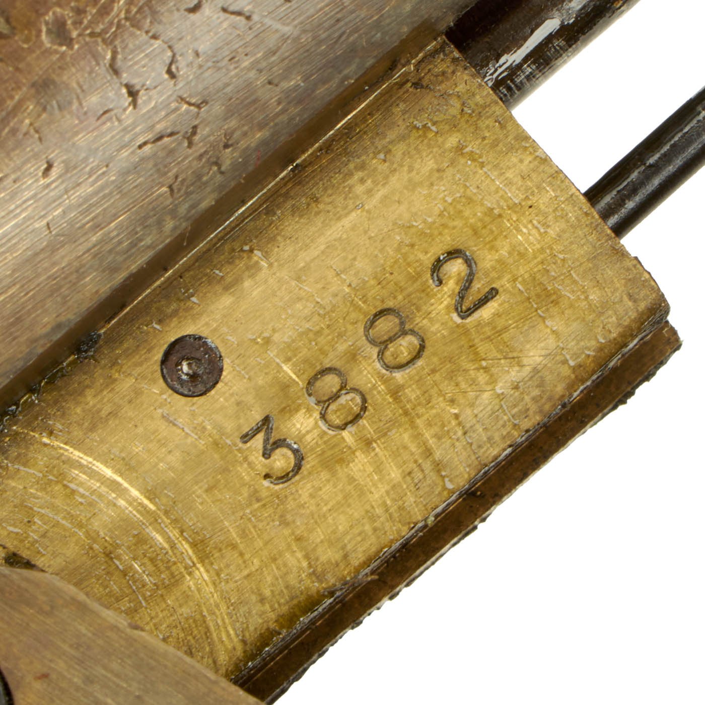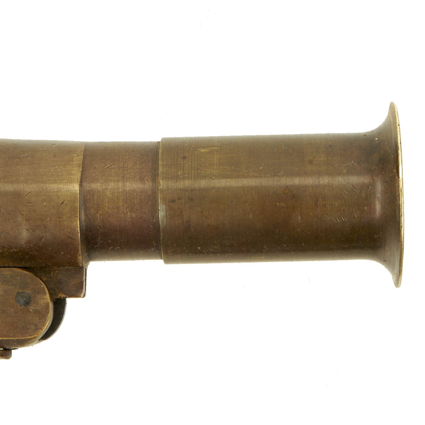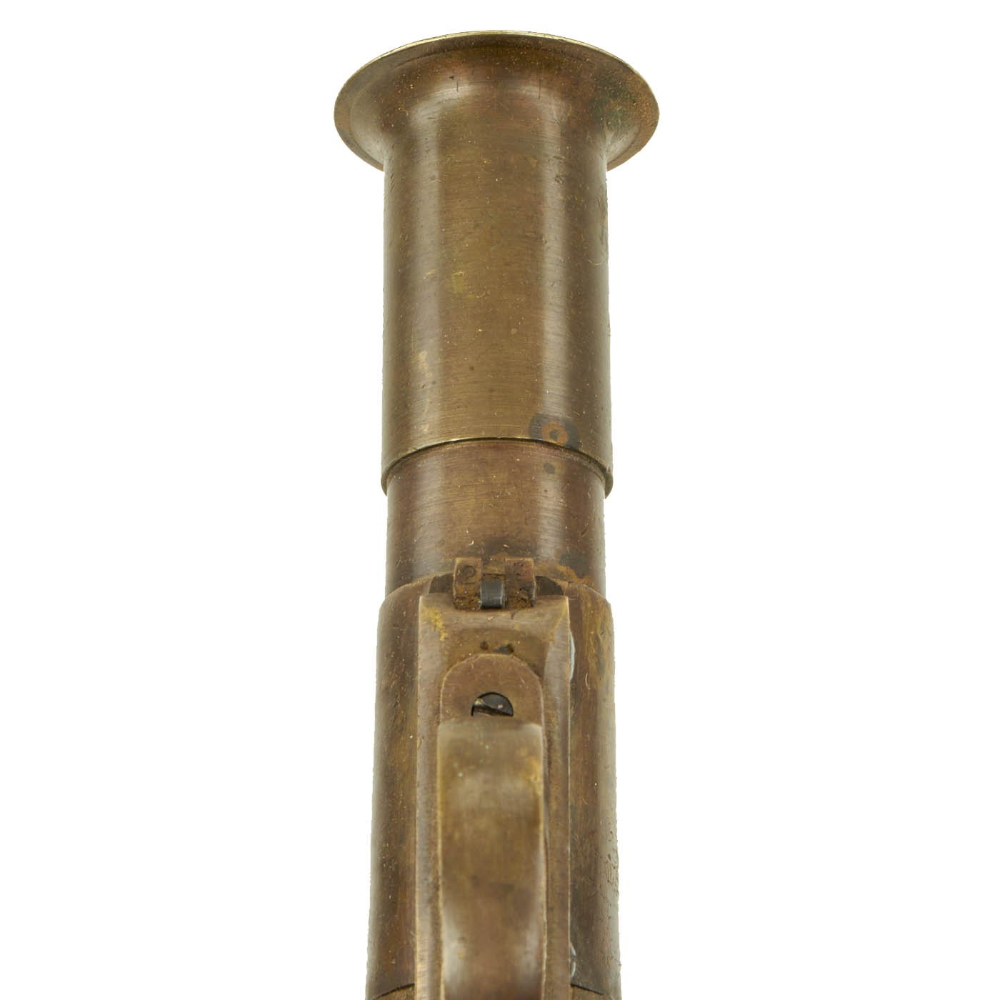 The signal pistol is in very good used condition. All of the markings on the frame and barrel remain crisp and clear. The brass frame components have a nice used look, with some mustard patina around the muzzle. The steel components do not show any rust or pitting, and the trigger and hammer have almost all of the original bluing present.